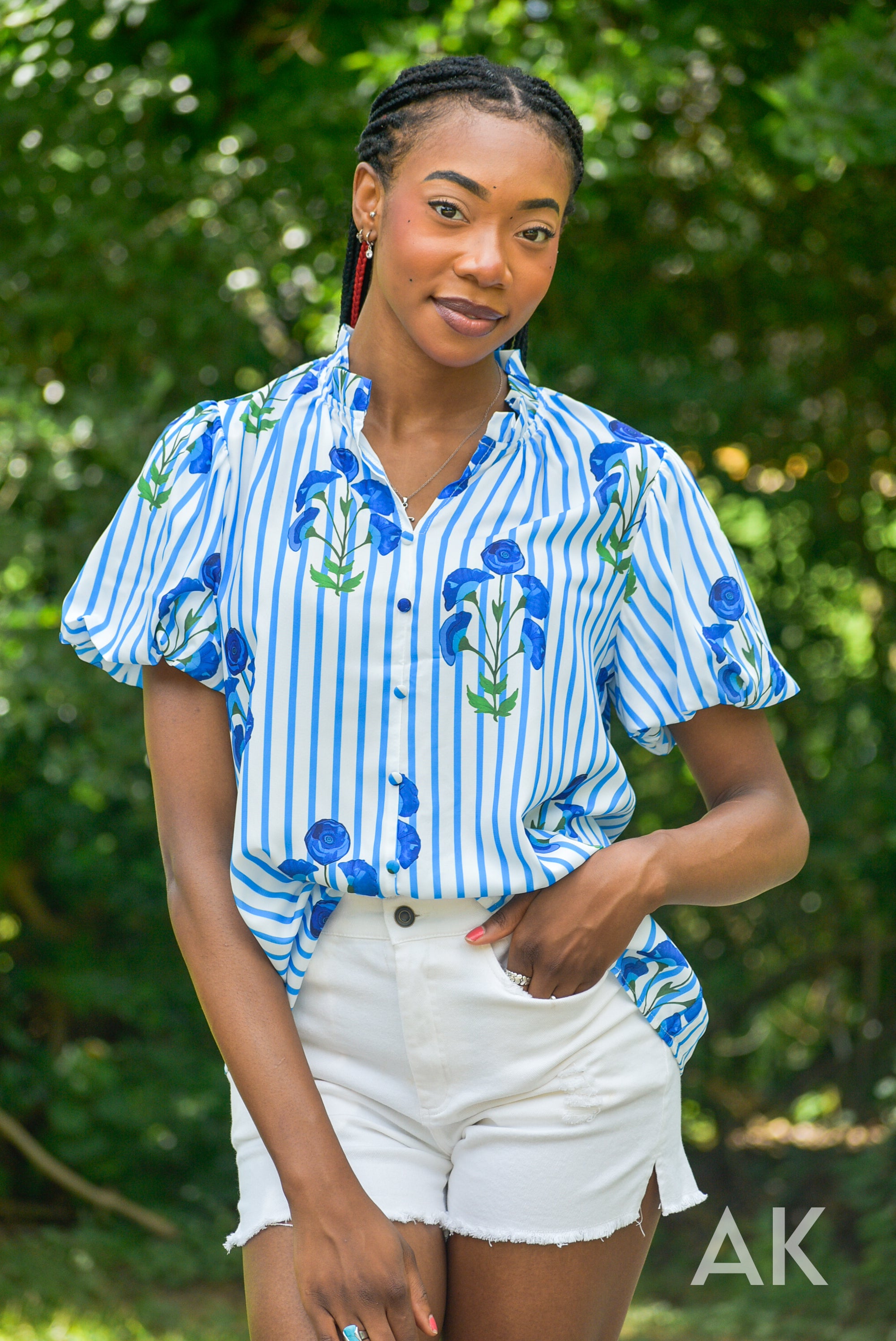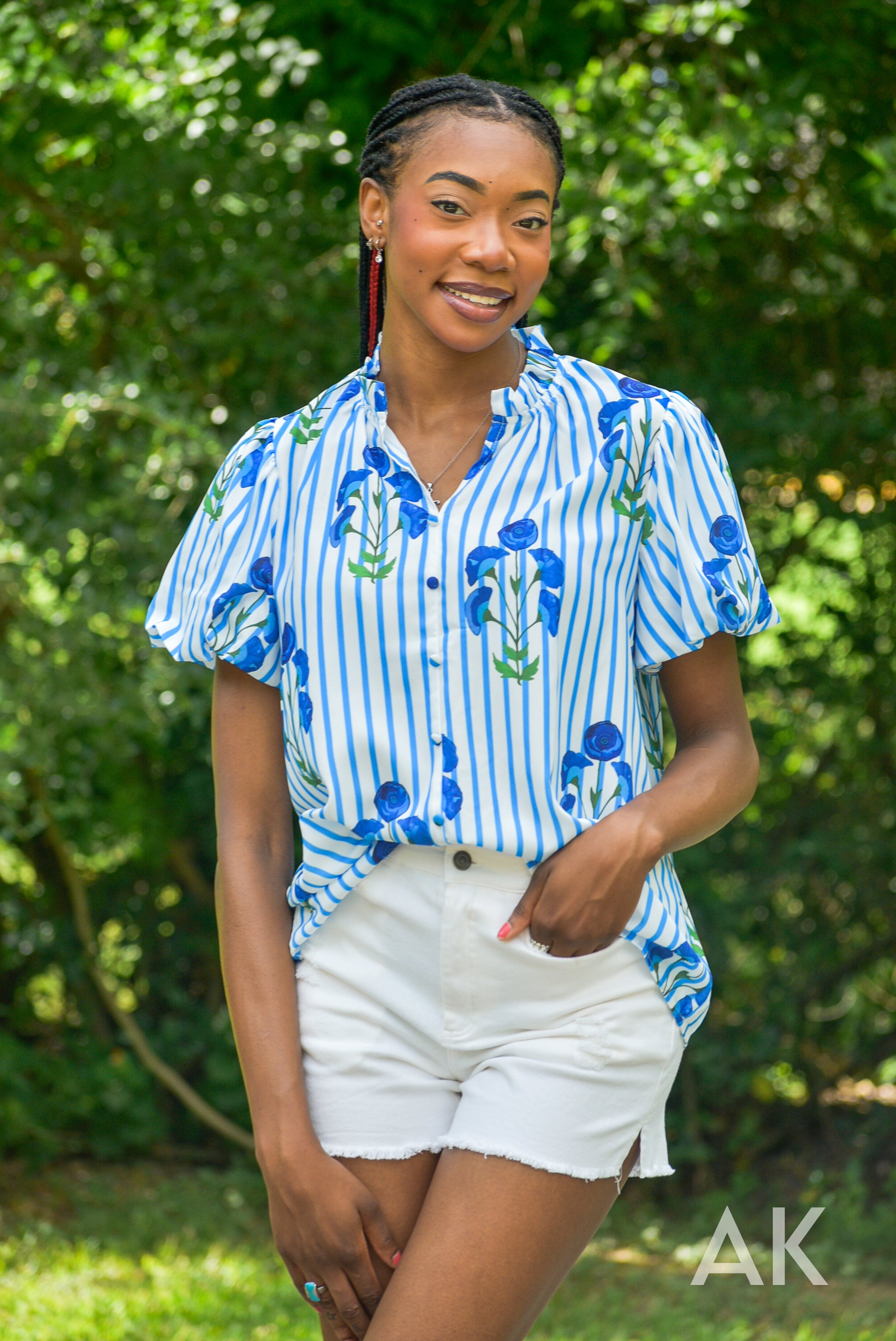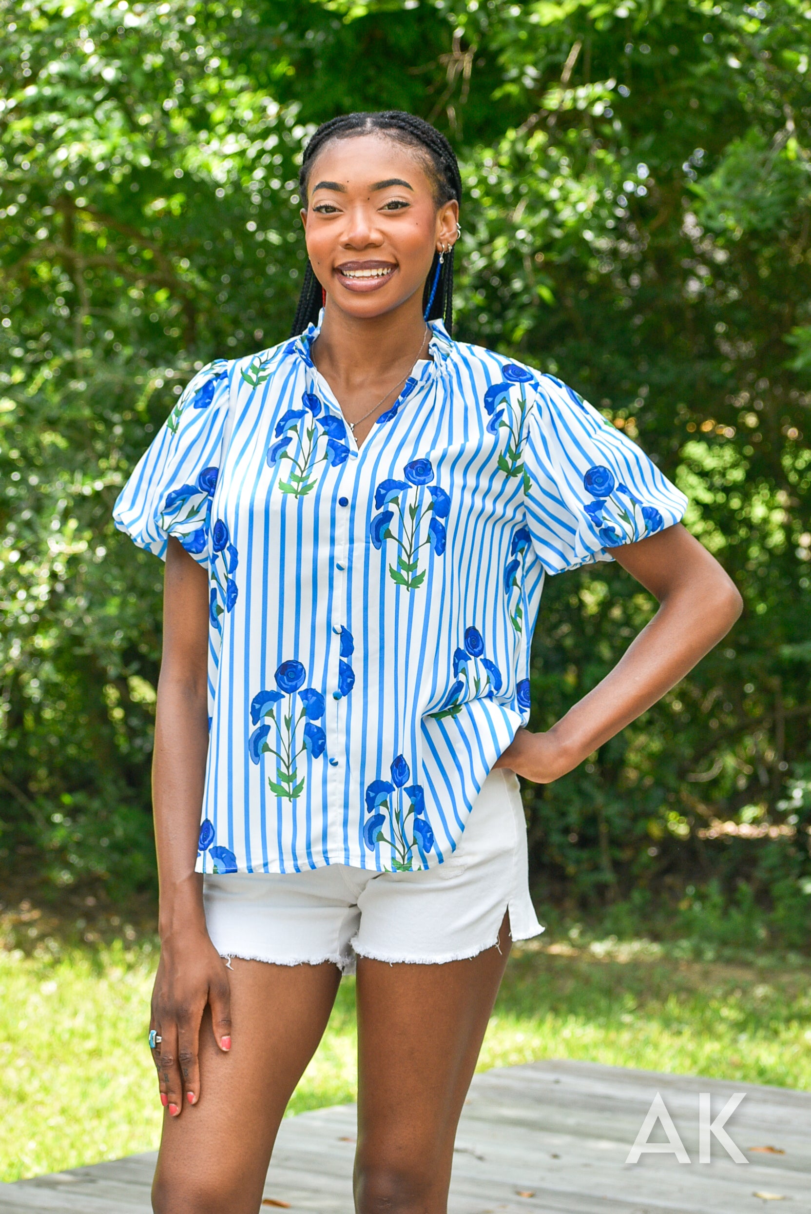 Blue has been such a trendy color this summer and the Zeena top fits the bill! We love the blue and white striped design paired with the blue flowers. The puff sleeves and ruffle at the neck give it a flirty, feminine touch.