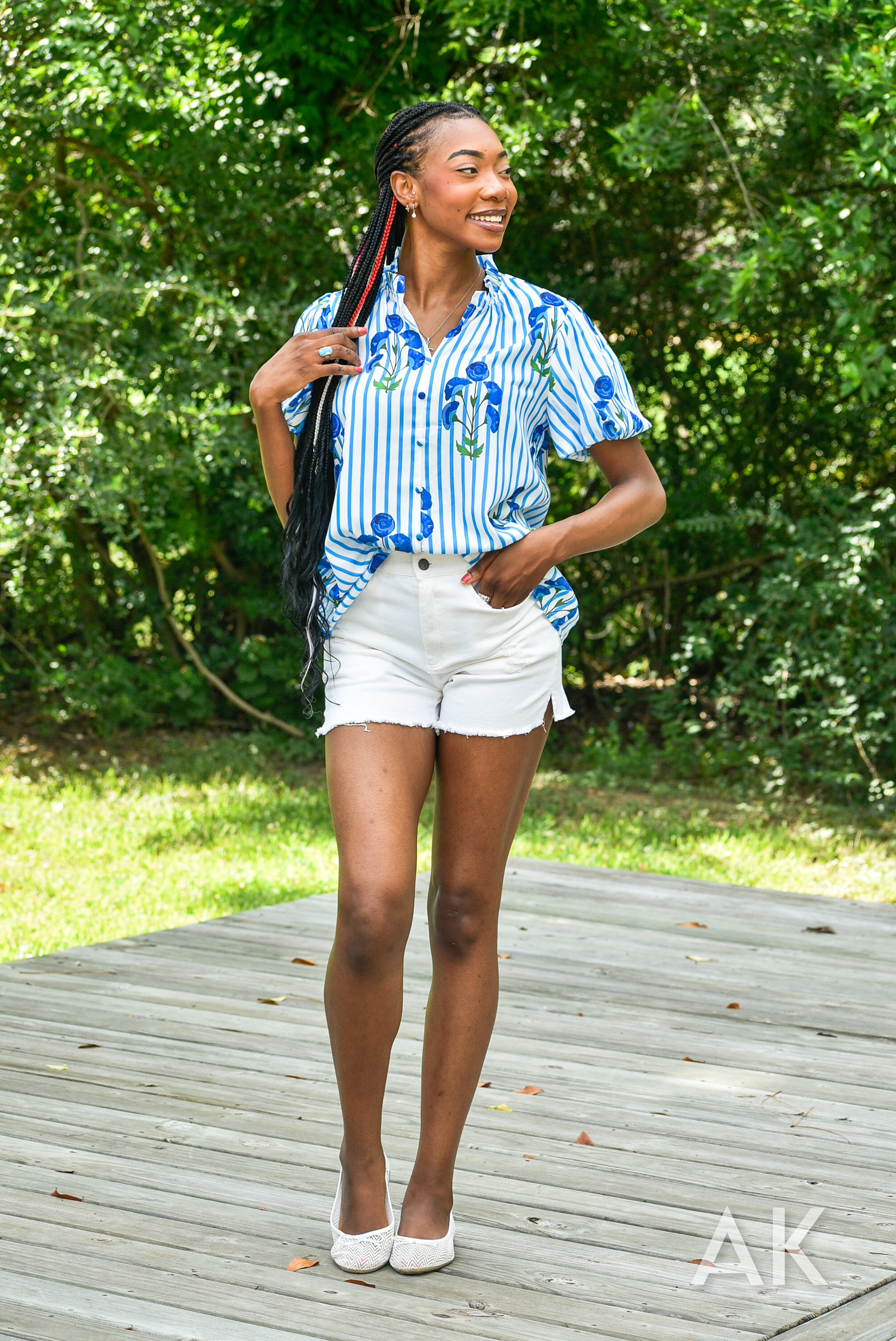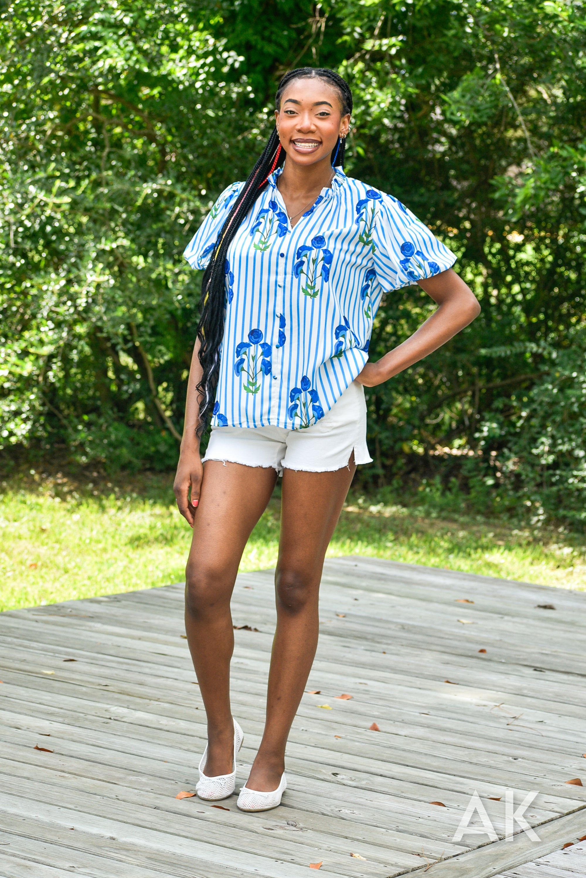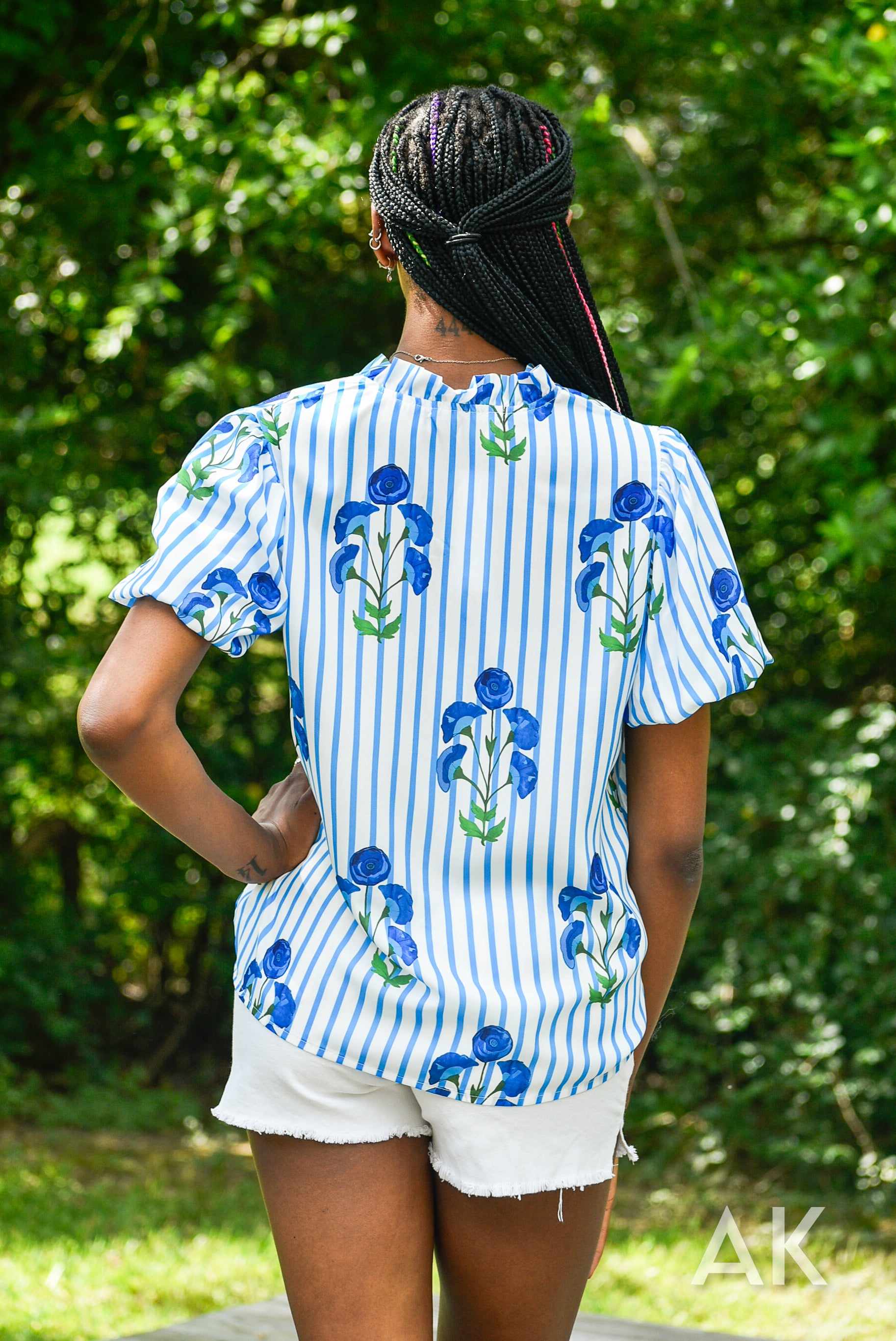 Blue has been such a trendy color this summer and the Zeena top fits the bill! We love the blue and white striped design paired with the blue flowers. The puff sleeves and ruffle at the neck give it a flirty, feminine touch.