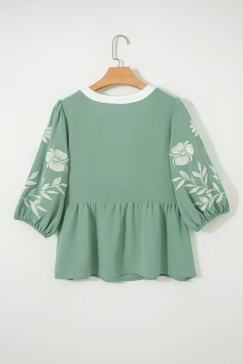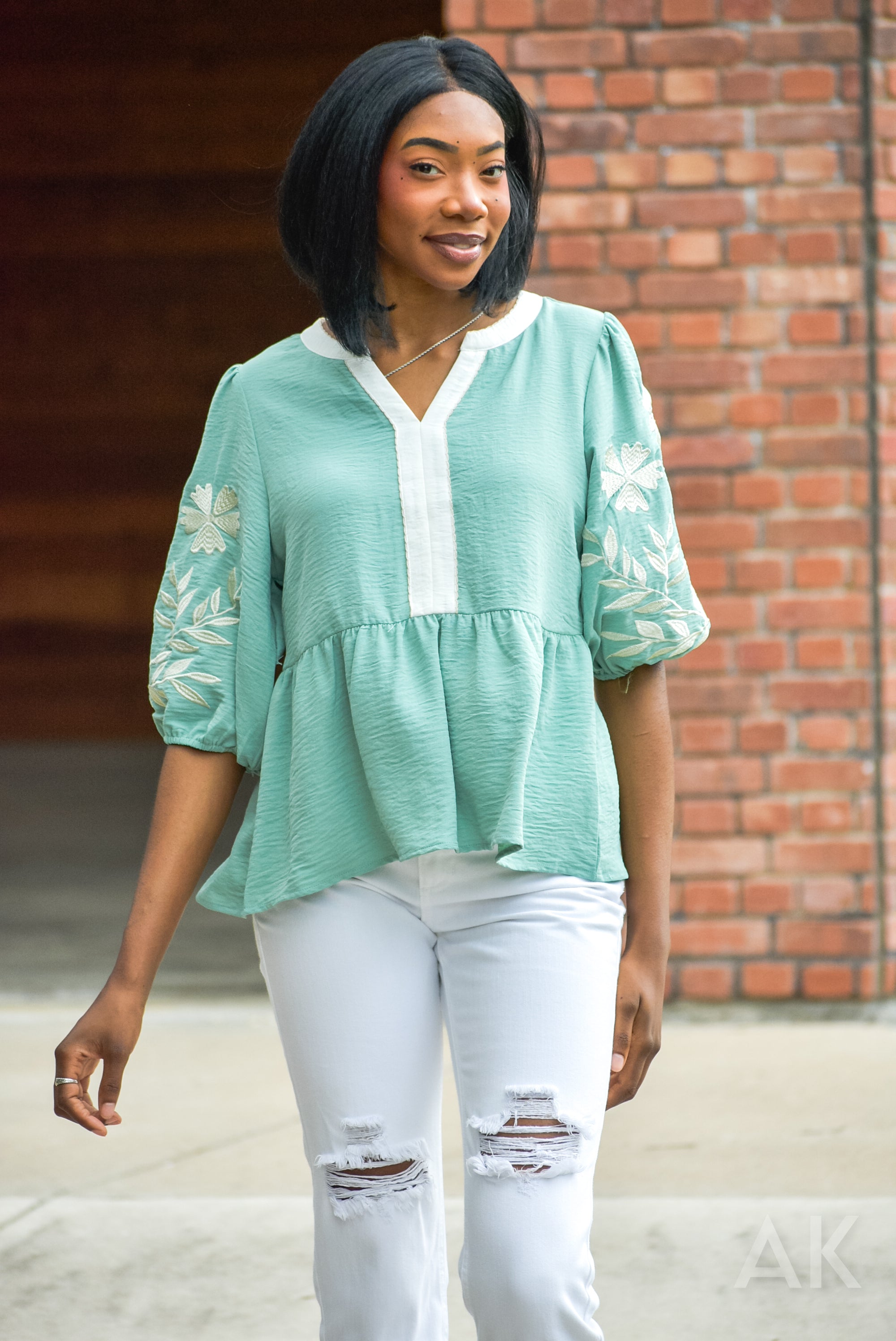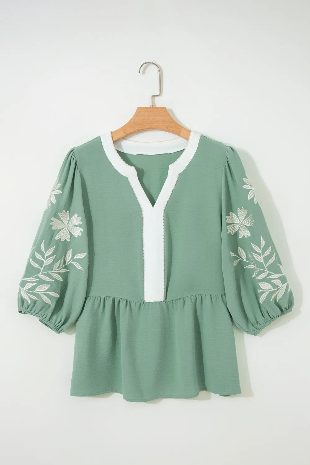 Sometimes you just need a cute top that goes with everything! This is a soft sage green blouse featuring a split neckline with white contrast trim and puff sleeves with delicate floral embroidery. Great for work or a casual day out!