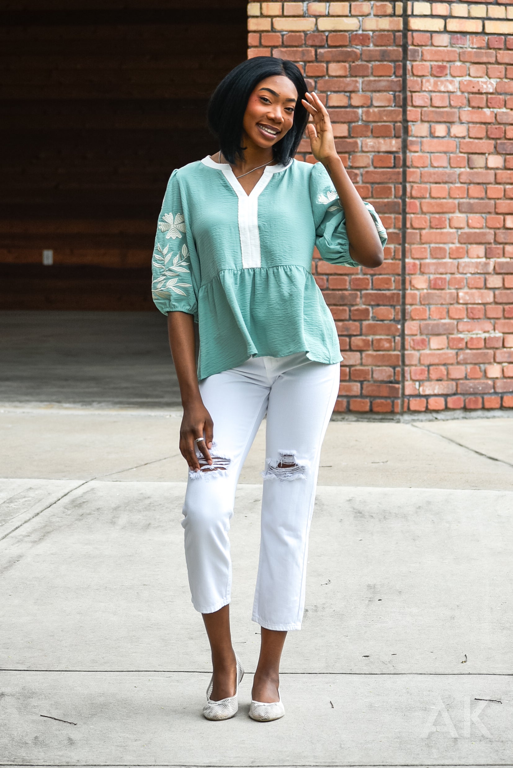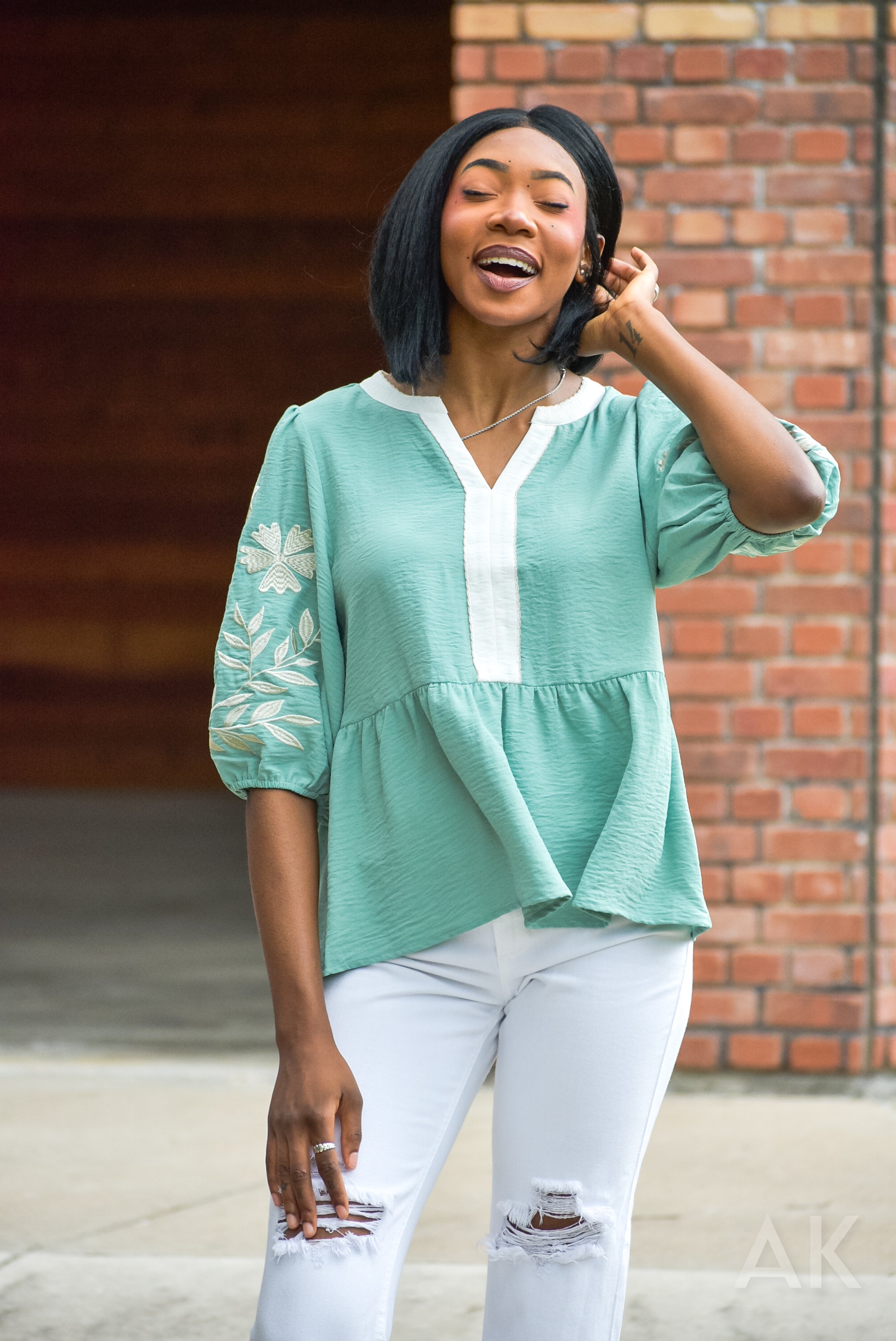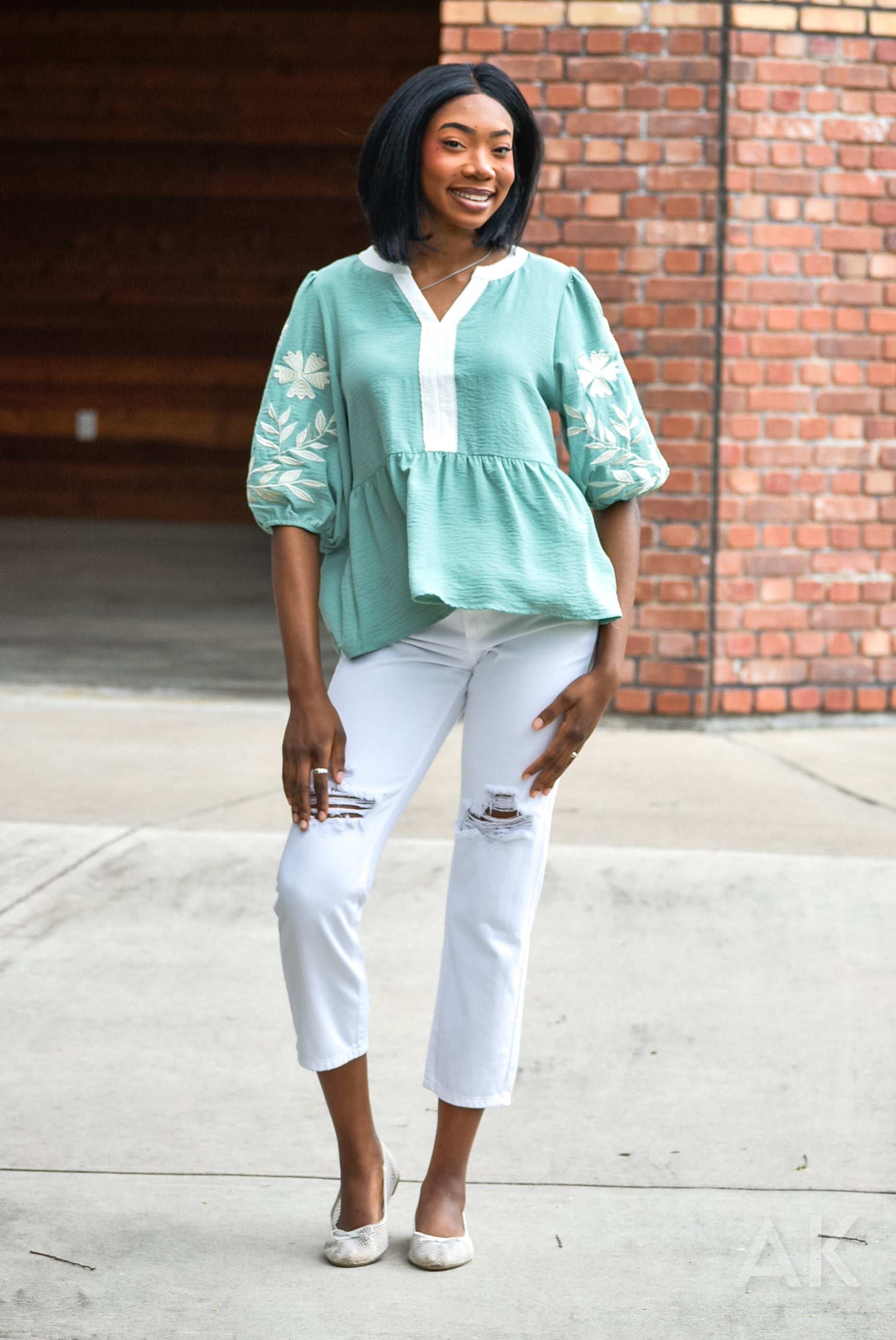 Sometimes you just need a cute top that goes with everything! This is a soft sage green blouse featuring a split neckline with white contrast trim and puff sleeves with delicate floral embroidery. Great for work or a casual day out!