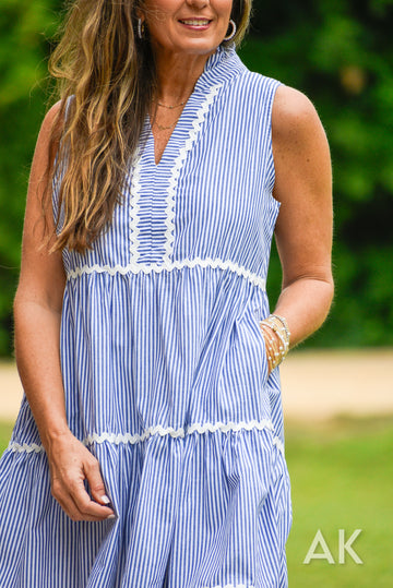 Cavela is full of preppy southern charm! The blue pinstripe pattern is so classic and we love the ric rac details. This dress is a great choice for summer! No stretch Fully lined 100% Cotton Dana is wearing a medium....