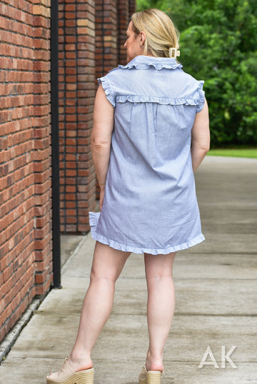 This frilly ruffled shirt dress is lightweight and perfect for summer! It features a classic blue and white pinstripe design with buttons, a collar and patched pockets. No stretch Button down 100% Cotton Mitzi is wearing a medium.  Length...