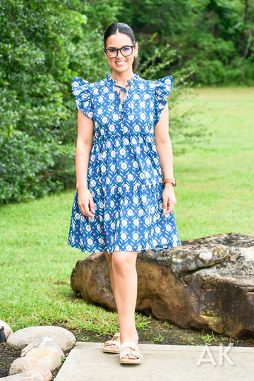 This blue and white floral dress is right on trend! The smocked top and ruffle at the bottom create a flattering fit. This dress is fully lined and the straps tie for an adjustable fit. No stretch Tie straps 100%...