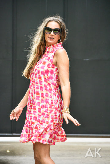 Aiden is the perfect sleeveless summer shift dress! We love the frilled neck and bottom ruffle paired with the abstract design in fuchsia and a pretty creamsicle color. Looks great with heels or sandals! No stretch Button closure at...