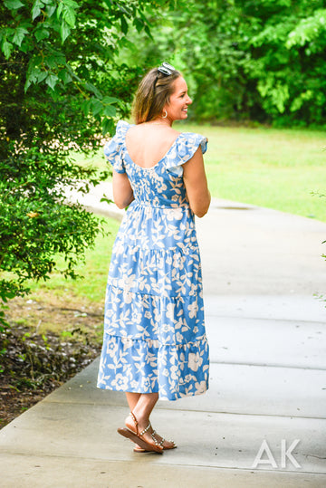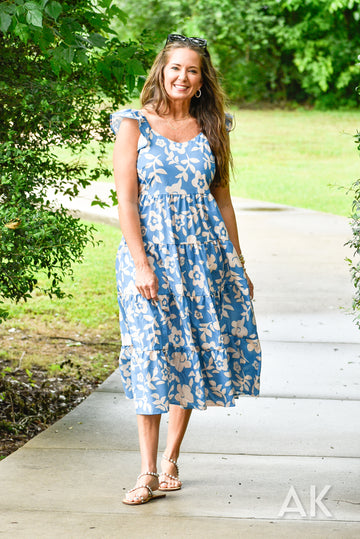 Daisha is the most gorgeous sky blue and cream floral midi dress! We love the delicate flutter sleeve and the flowy, tiered silhouette. This dress is perfect for brunch with friends or summer events! No stretch 100% Poly Dana is...