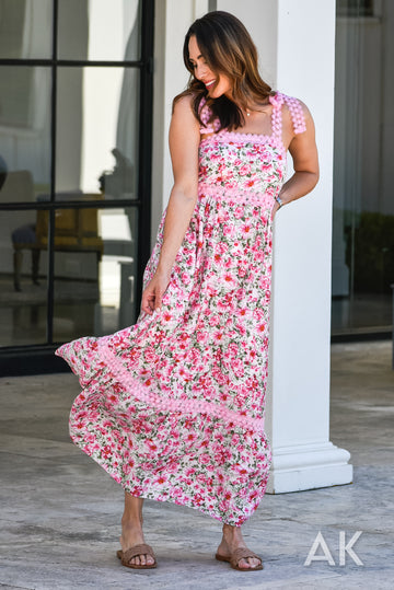 This is such a gorgeous pink floral maxi! We love the lace straps and detailing throughout the dress. It's perfect for so many spring and summer occasions. Leah is wearing a small. No Stretch Pockets 80% Viscose, 20% Polyamide Length...
