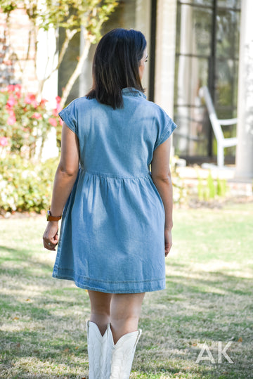 Denim dresses are always so classic! The Carolina dress is sleeveless so it works great on it's own or paired with a long sleeve top underneath. It would look great with our Lucia or Haven tops! We love the pockets...