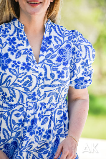 This blue and white floral dress is absolutely gorgeous! The pattern is a classic and we love the puff sleeves. This looks great with cute sneakers, heels or sandals! Mitzi is wearing a medium. No Stretch V neck 100% Cotton...