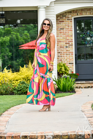 This maxi dress is perfect for the beach or the streets! The horizontal stripes are a mix of great summer colors and we love the ties. The ties are not tacked so you can fully adjust their length. It has...