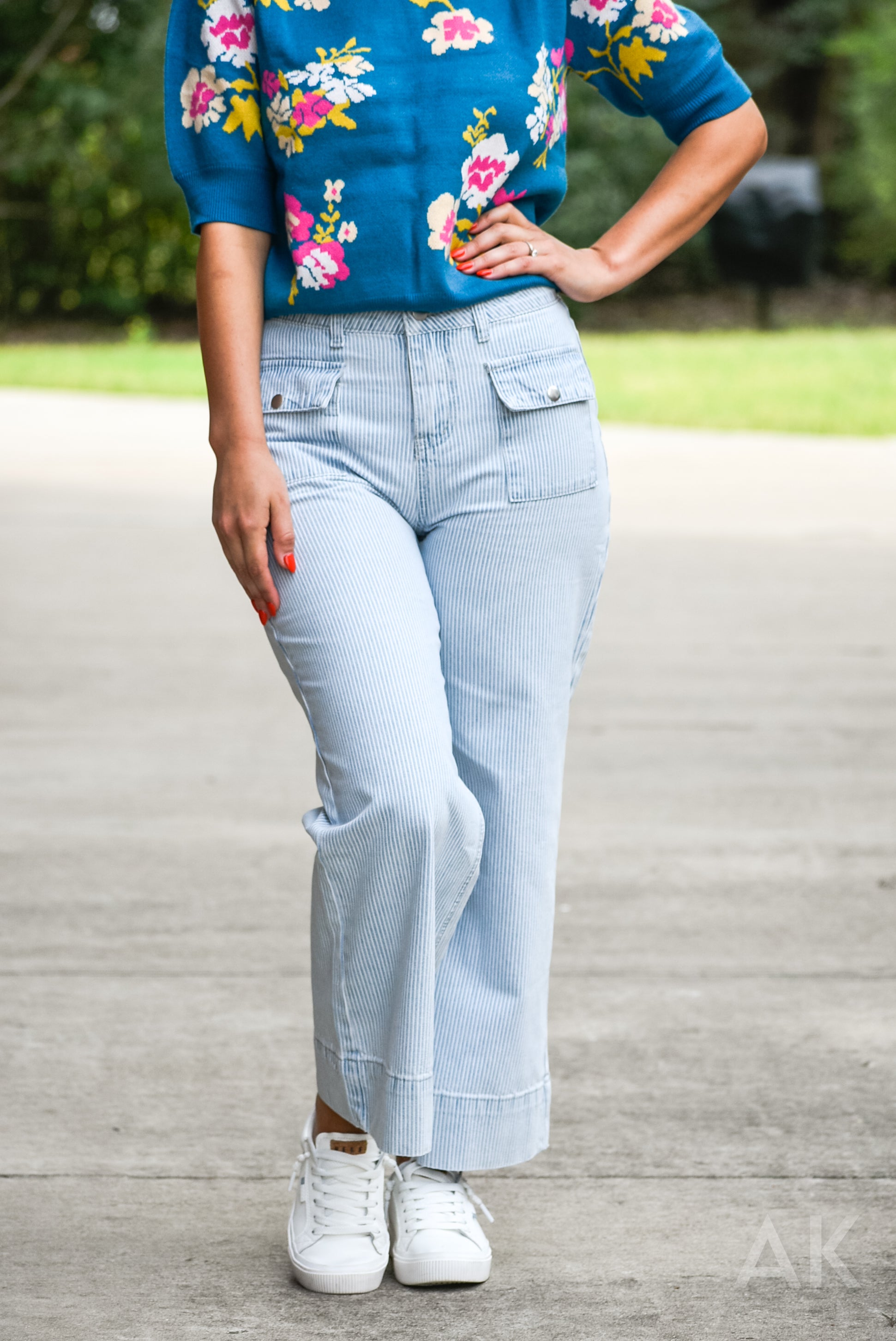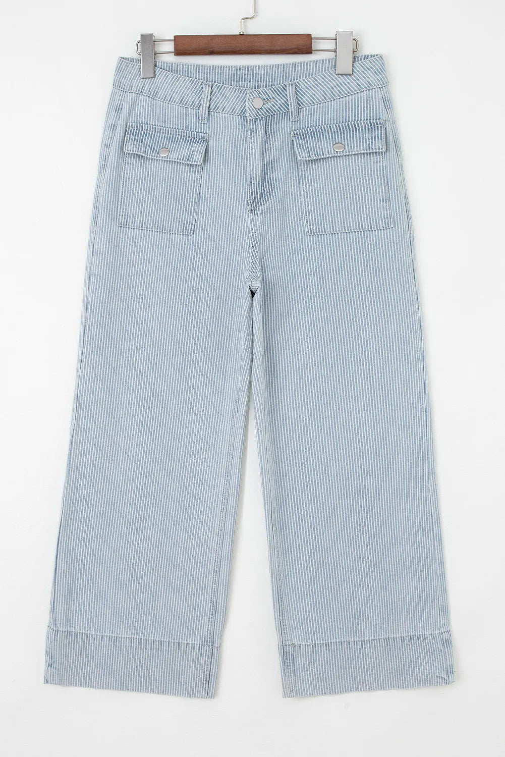 A fun twist on your everyday denim! Audrina is a light wash striped wide leg jean featuring front patch pockets and a flattering high-rise fit. Looks great with tanks, blouses, or your favorite casual tops.