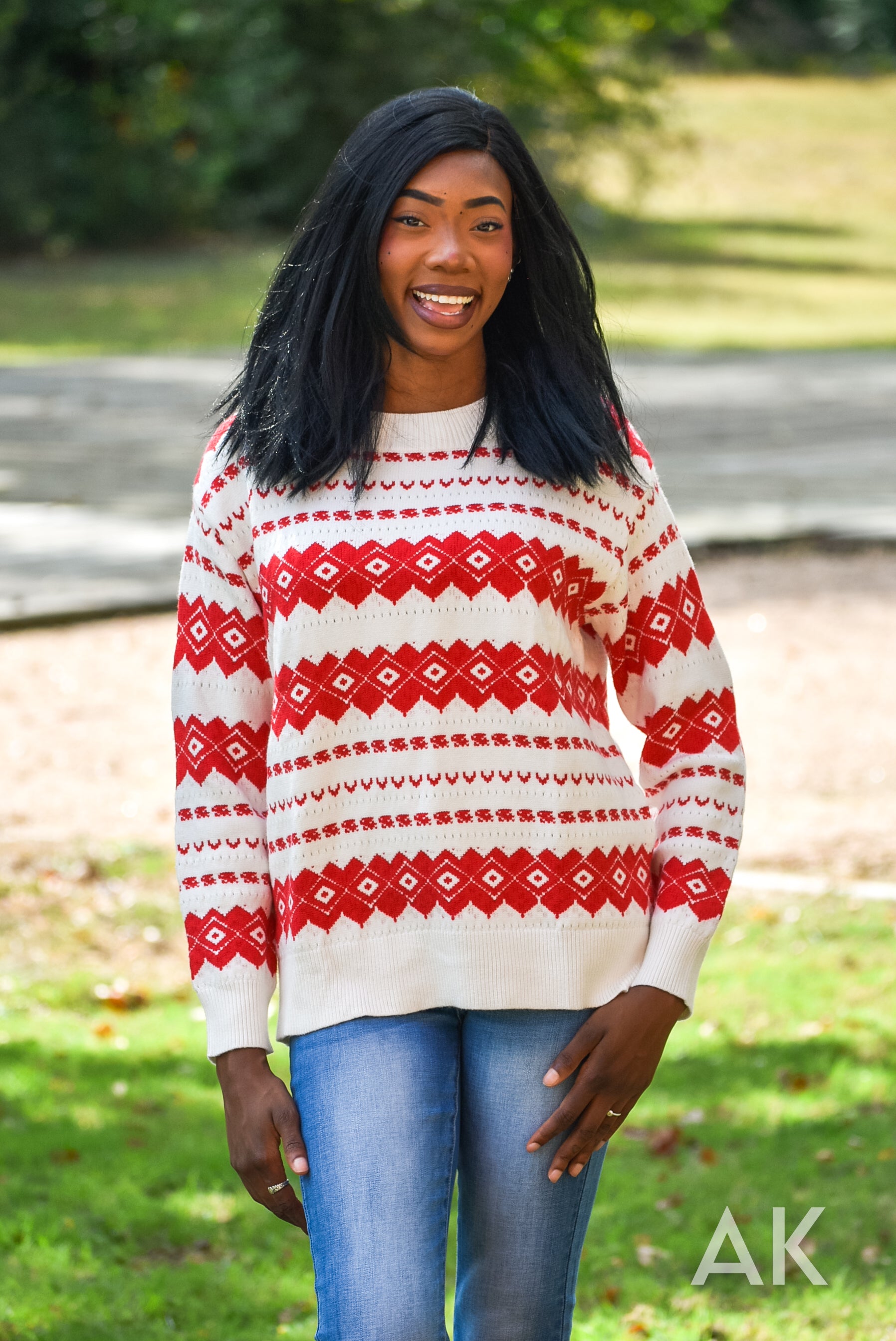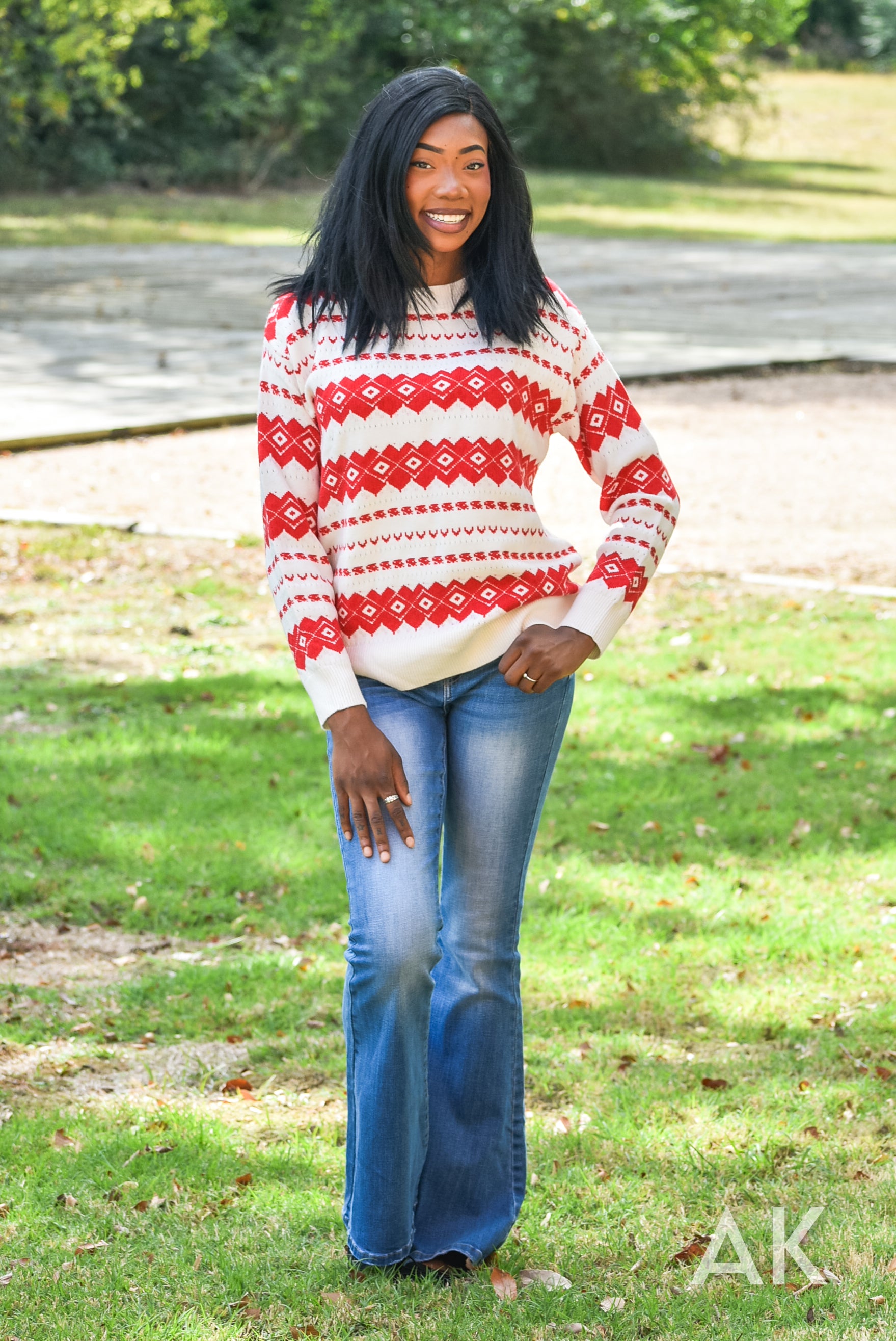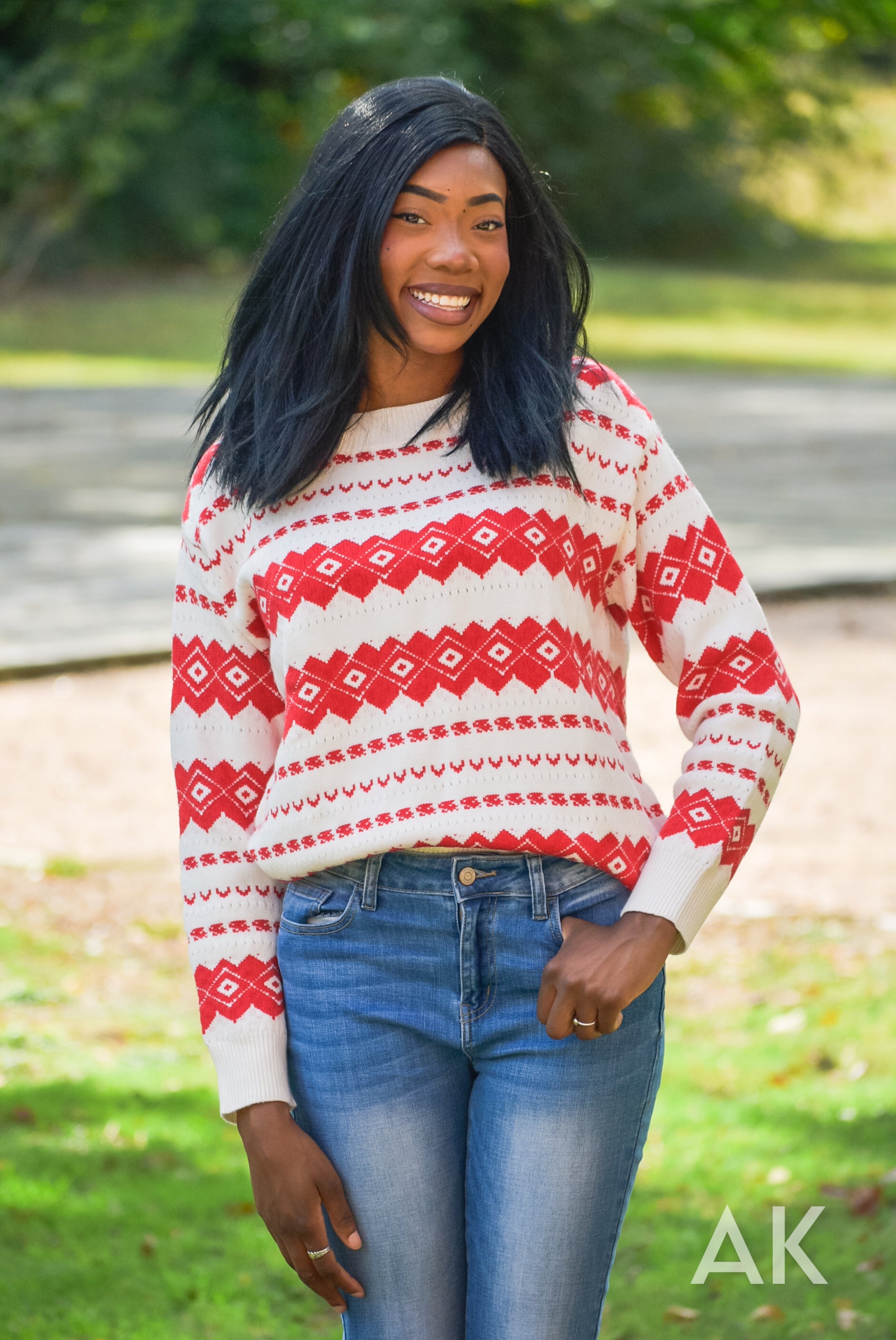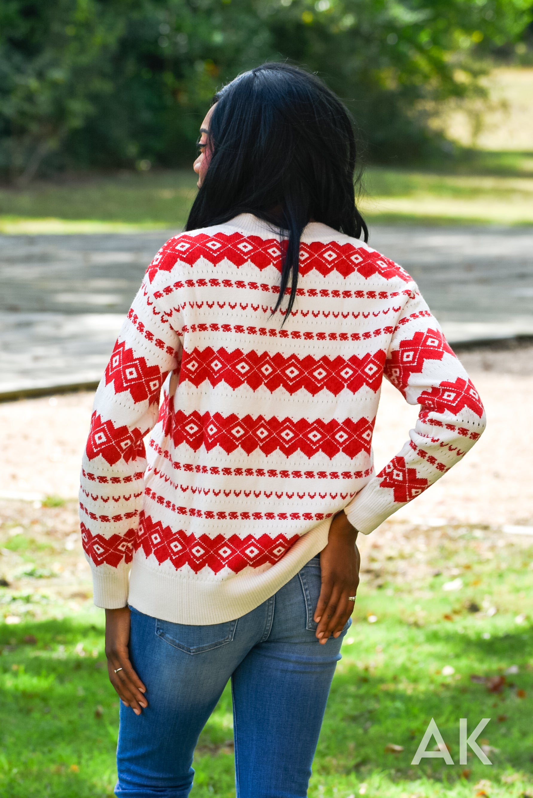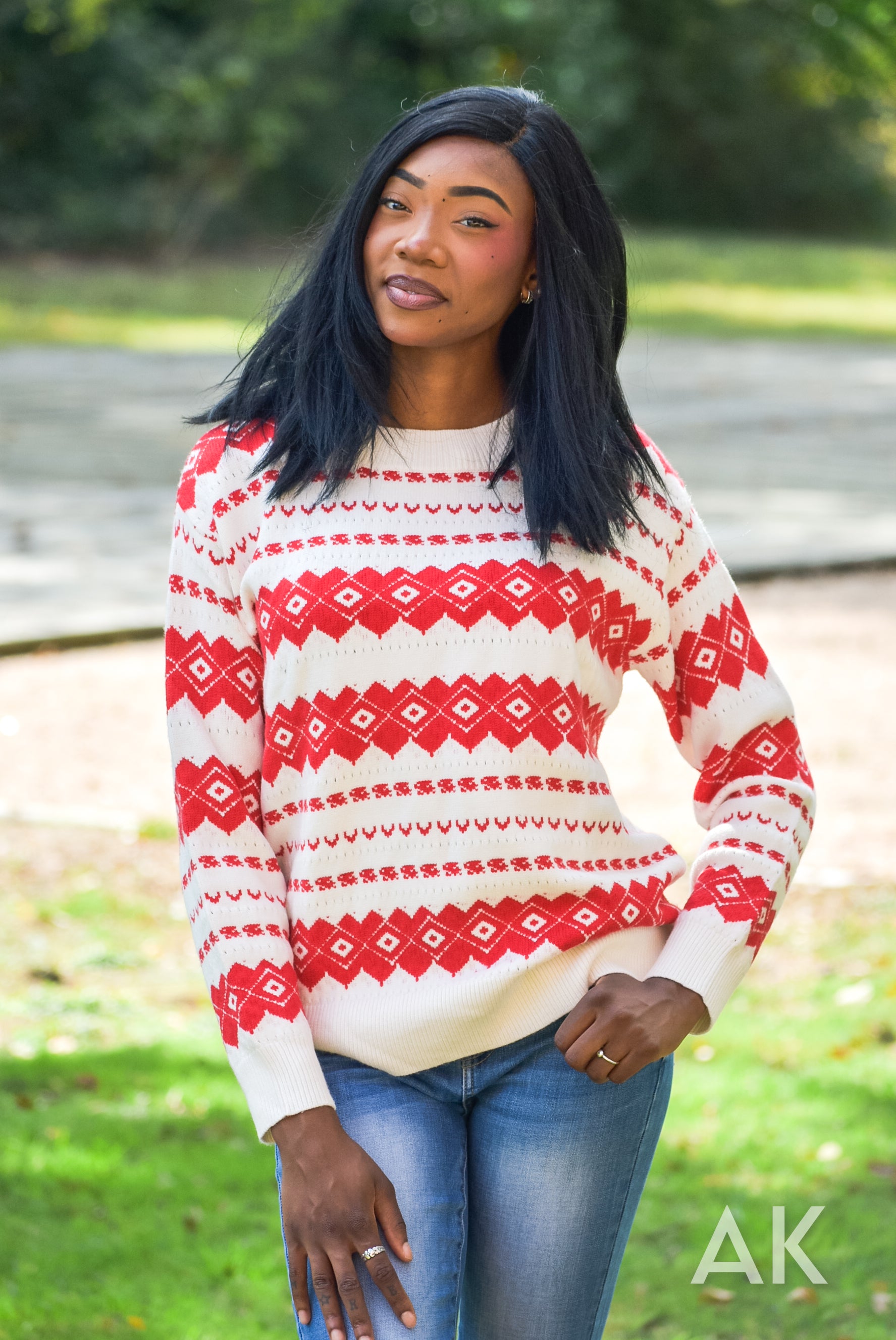 Fall in love with this gorgeous and ultra soft sweater. This sweater has a beautiful red and white pattern along with cute open knit details. Blitzen is slightly oversized and perfect paired with jeans or leggings for a cute and comfy holiday look.