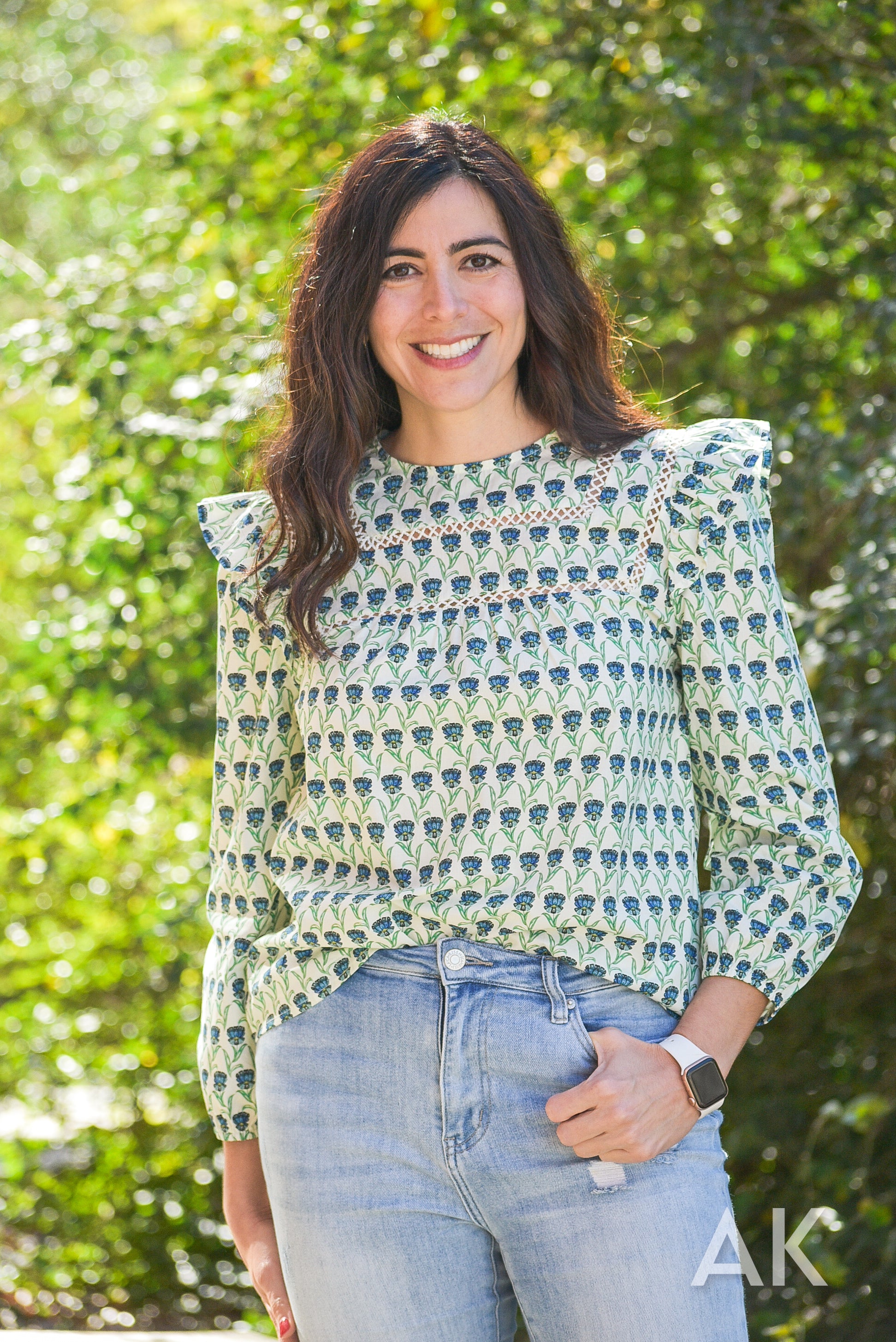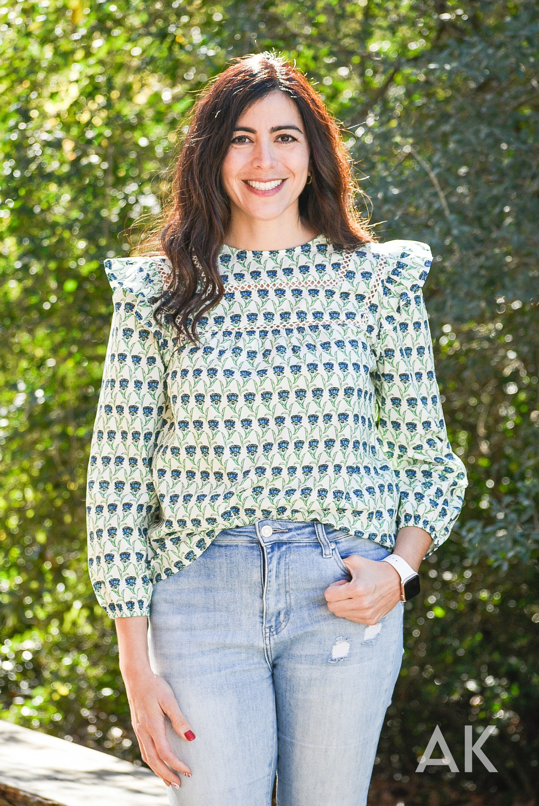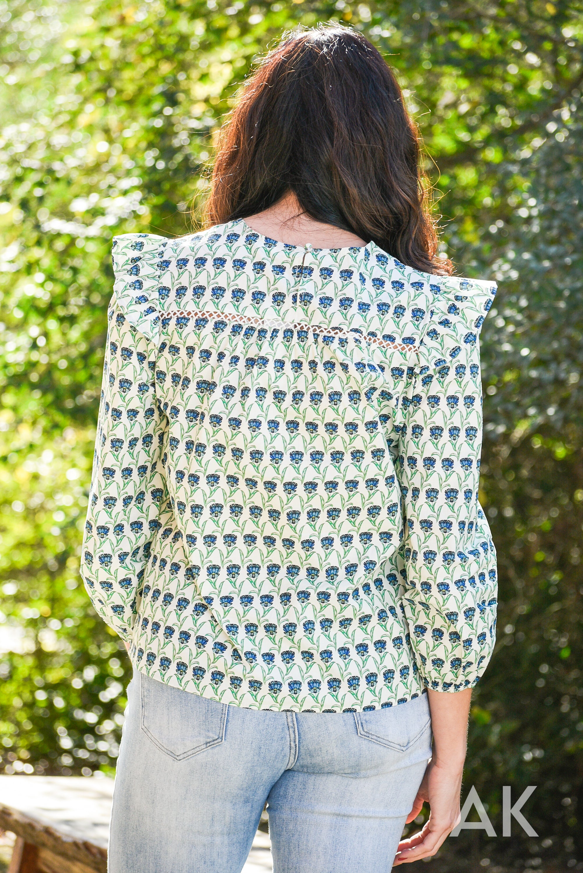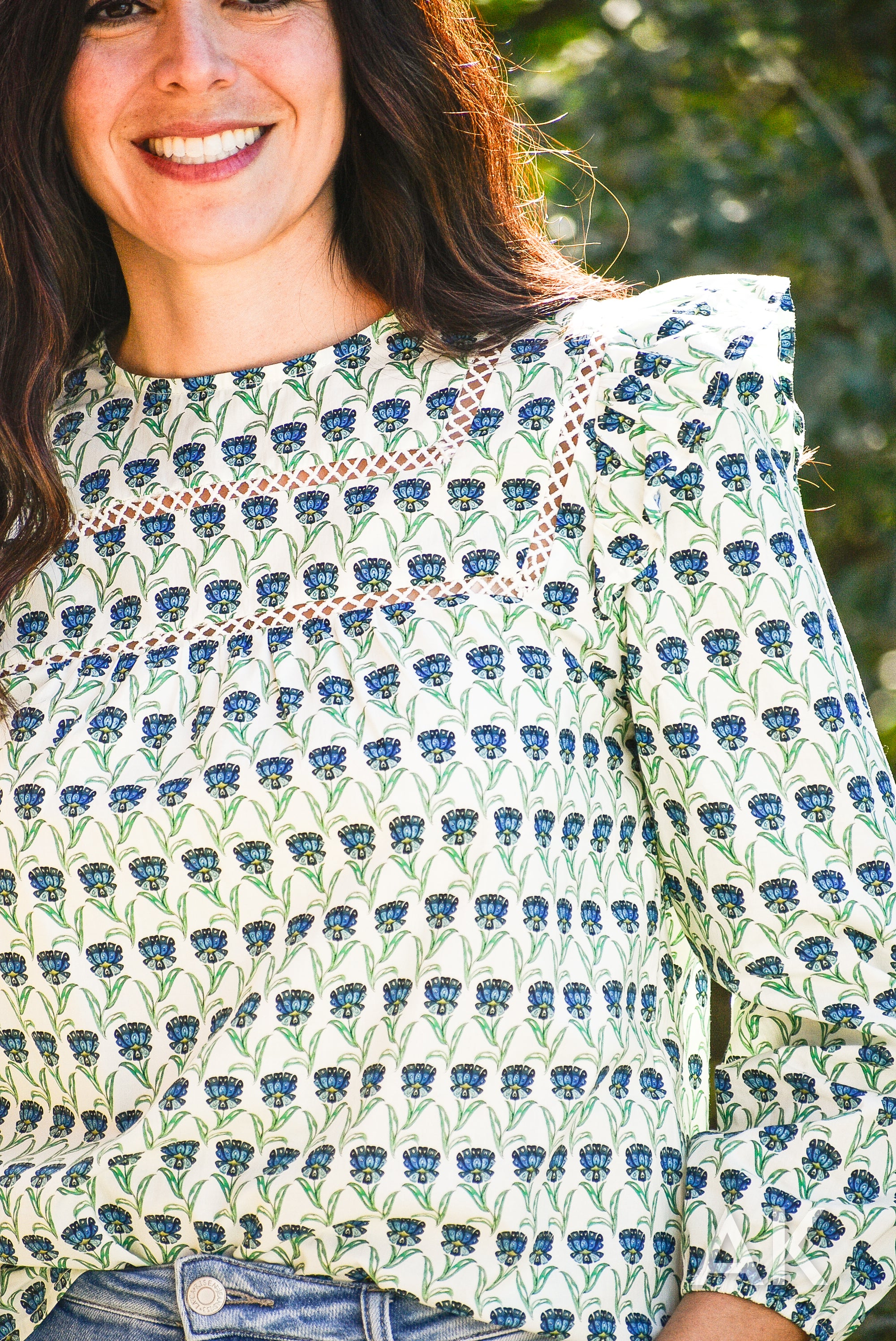 Marlowe is such a charming blouse with a blue floral pattern. The lace trim around the neck and ruffle at the shoulders give it just the right amount of detail. It's perfect for pairing with your favorite denim for a put together look!