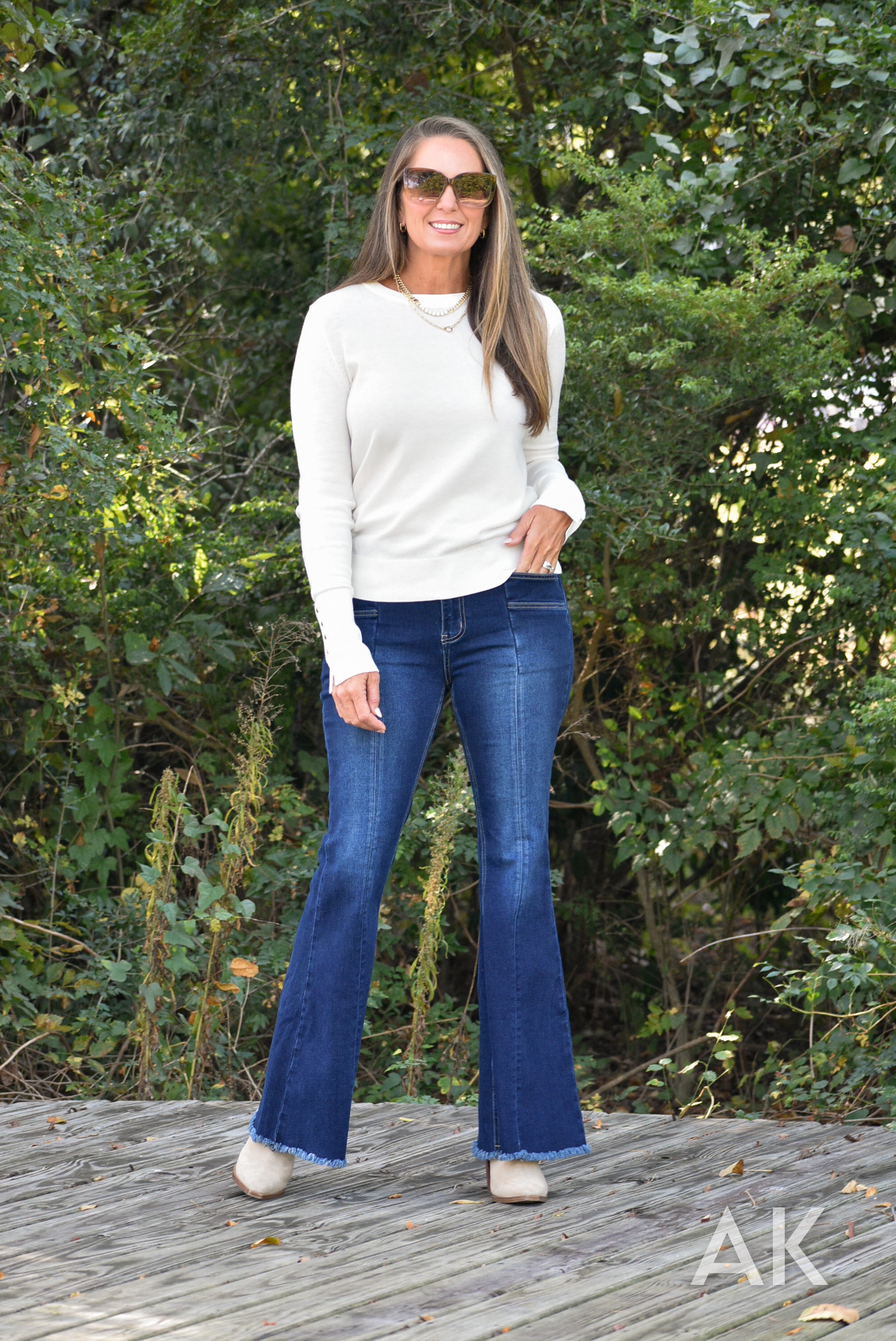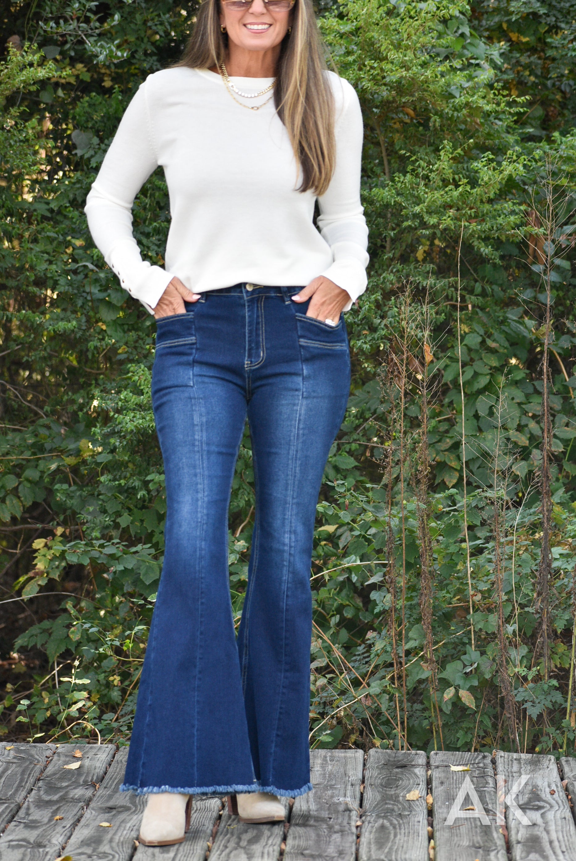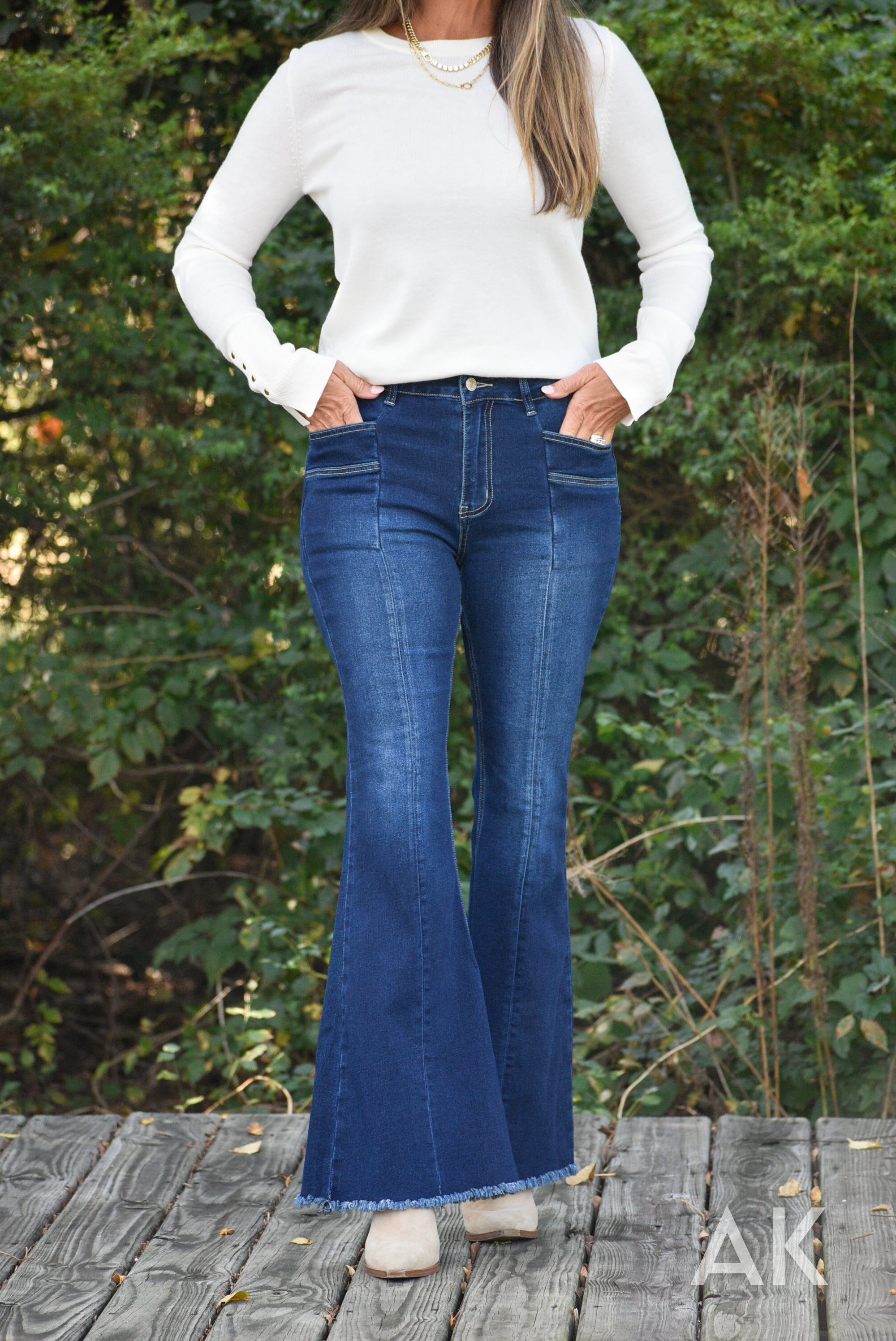 These trendy flared jeans are so cute and super flattering. The dark wash, raw hem and cute pocket details are absolutely perfect. It has the fun center seam down each leg. Grab the Eva jeans for a strut worthy look!