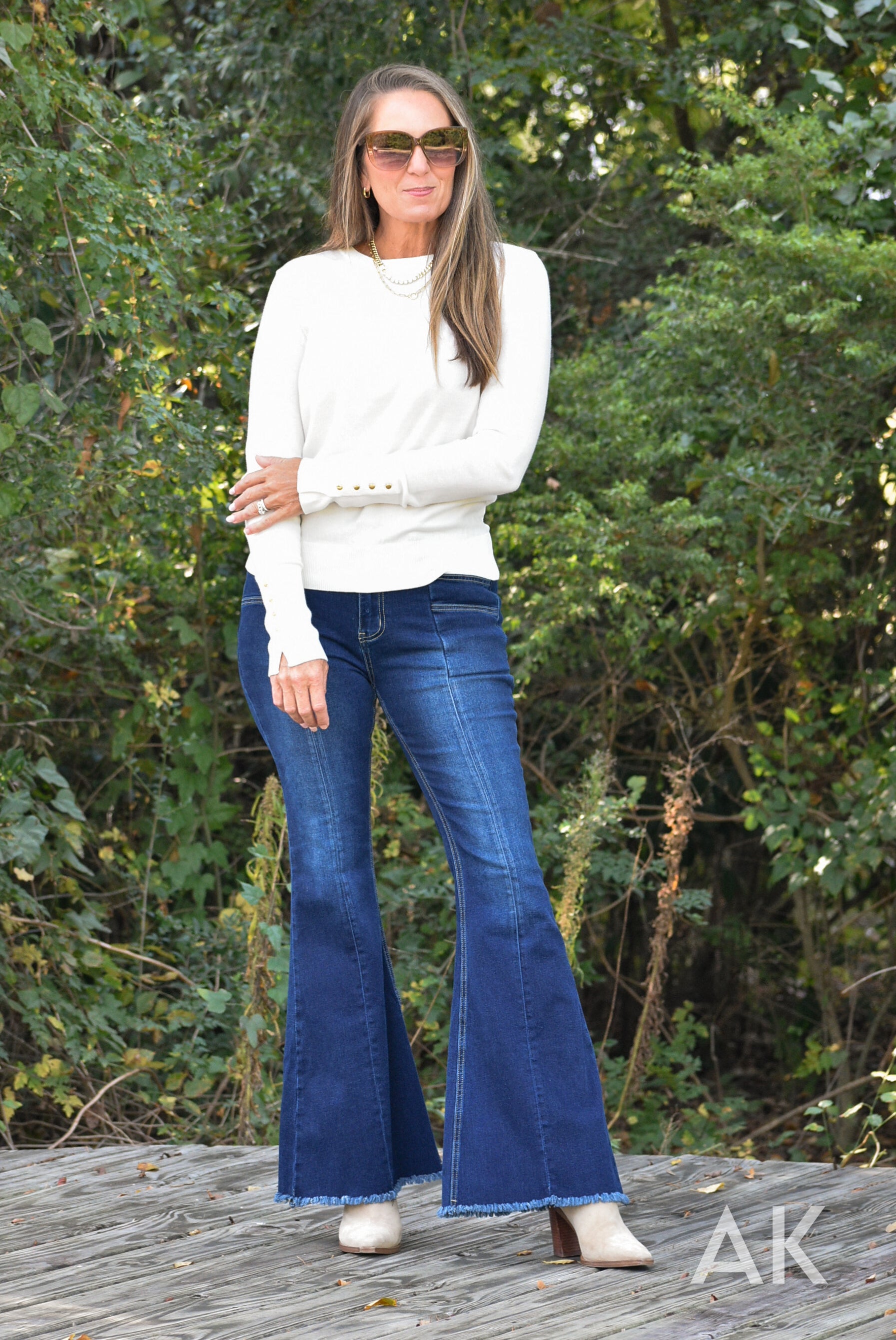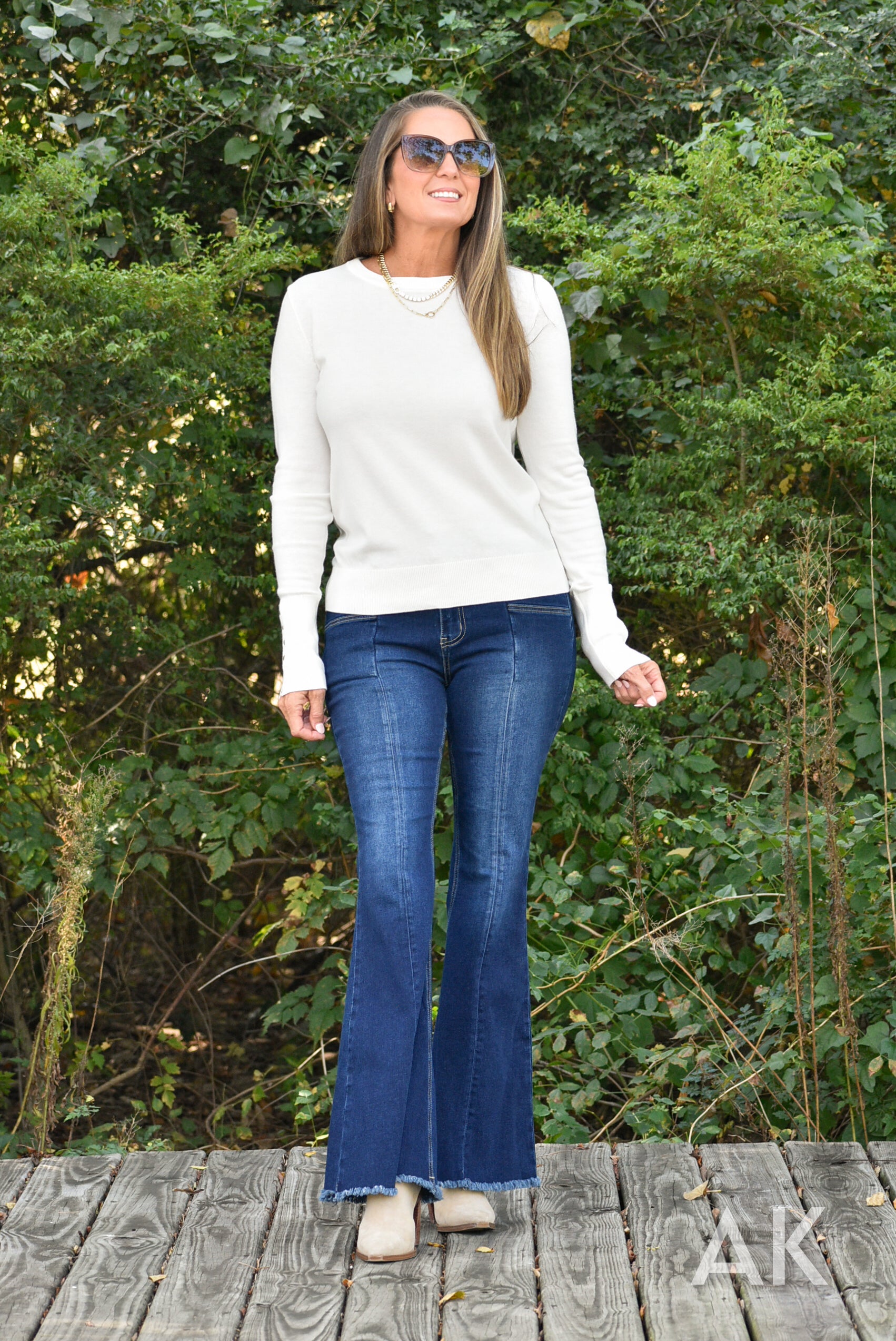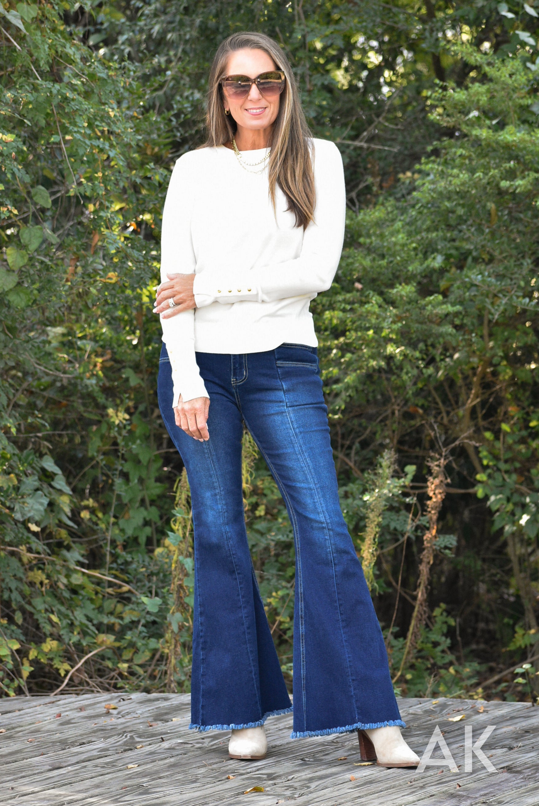 These trendy flared jeans are so cute and super flattering. The dark wash, raw hem and cute pocket details are absolutely perfect. It has the fun center seam down each leg. Grab the Eva jeans for a strut worthy look!