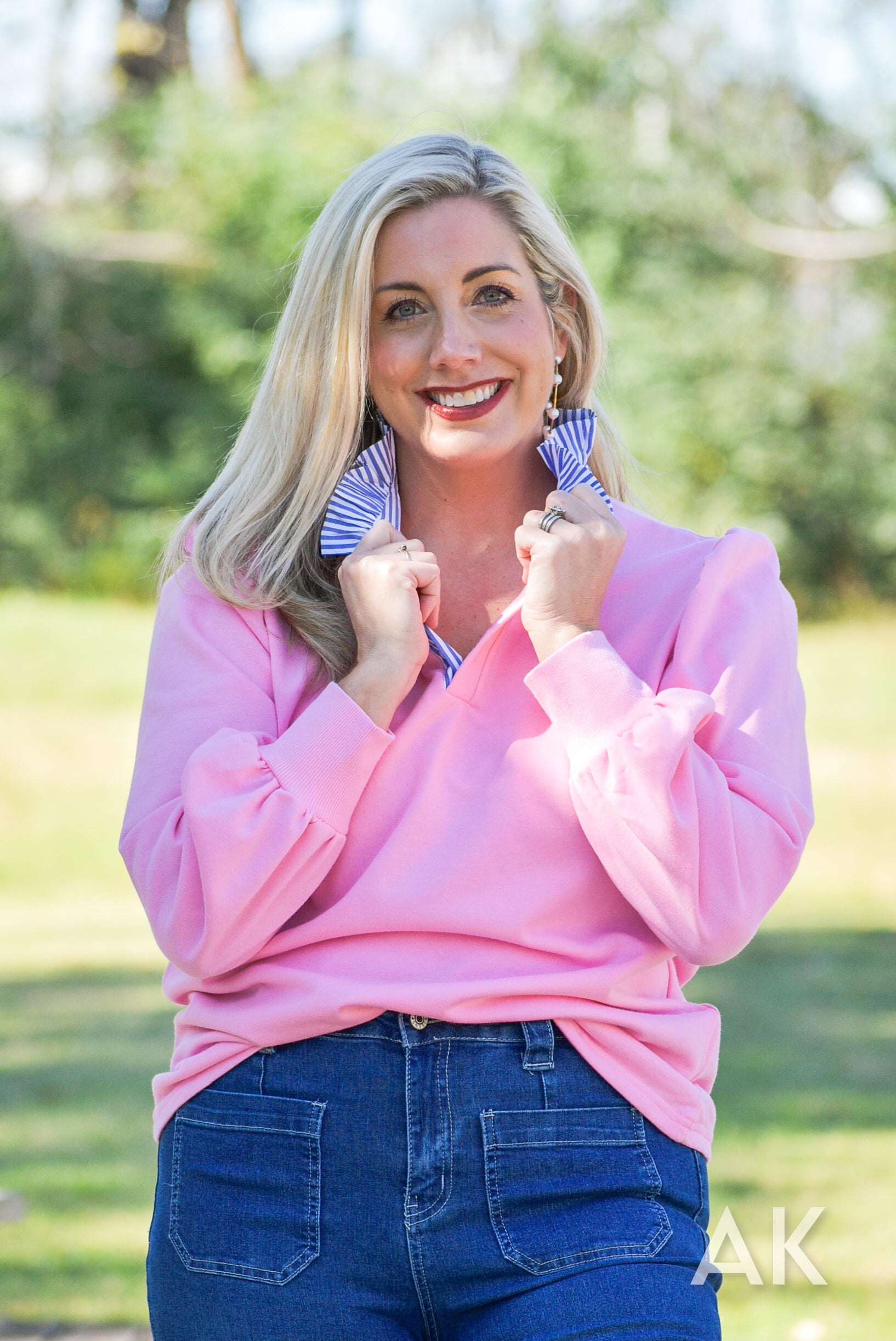 Mayci is a soft knit top in a candy pink. It features a classic collared neck in a contrasting blue and white stripe with buttons. The gently puffed sleeves give it a feminine touch and the relaxed fit makes it easy to dress up or down!