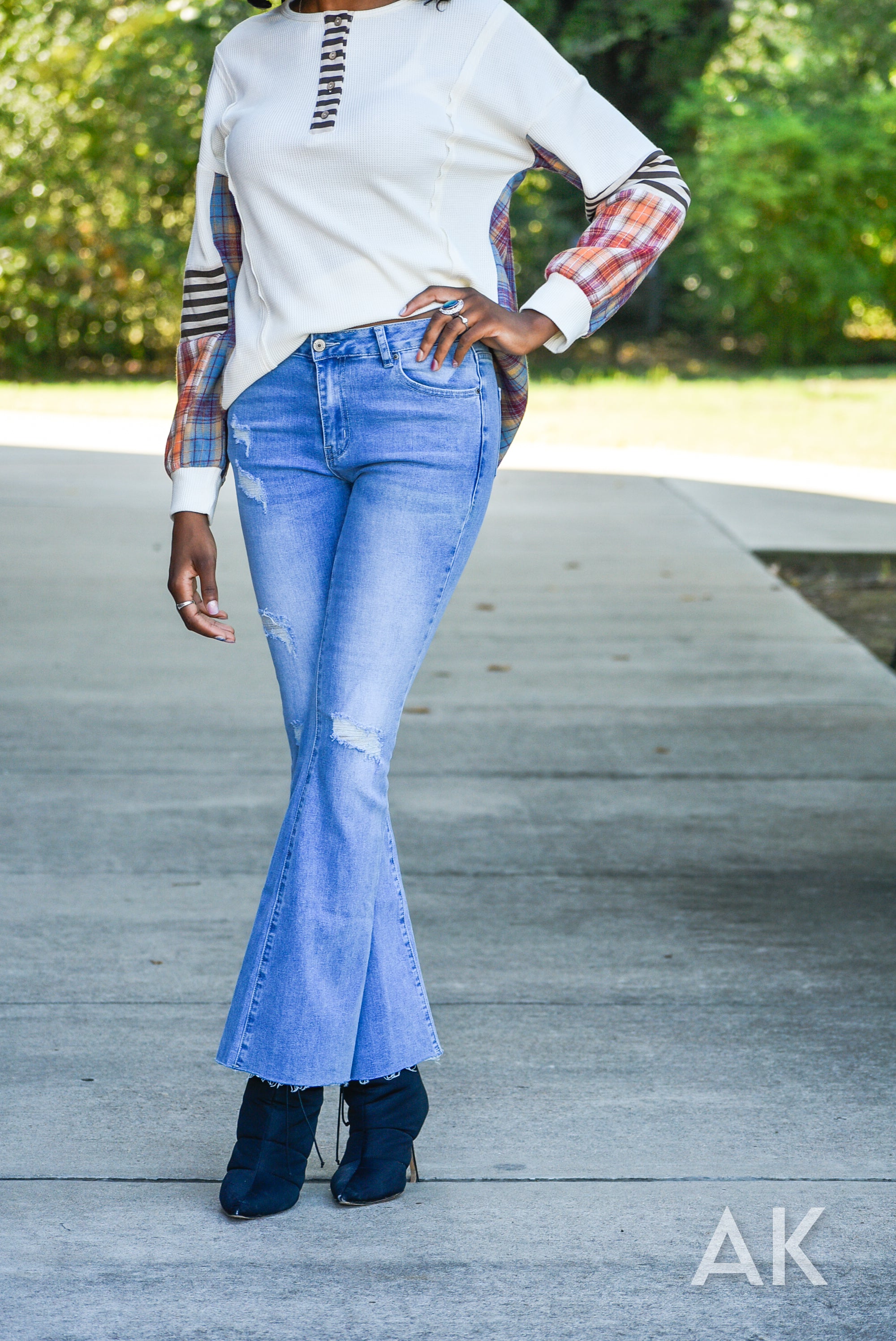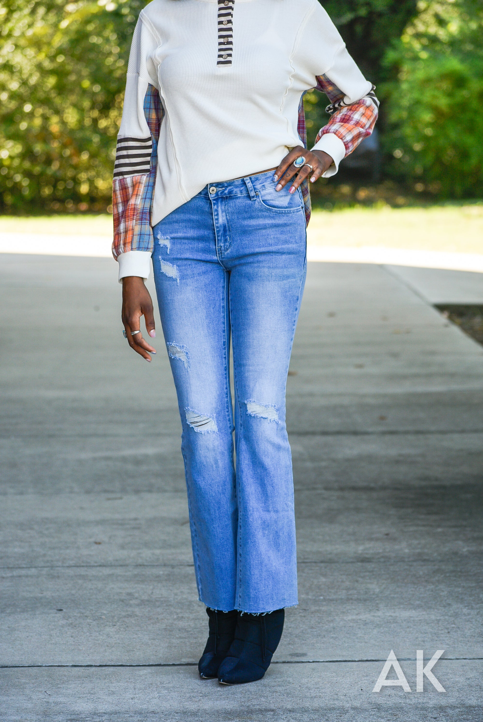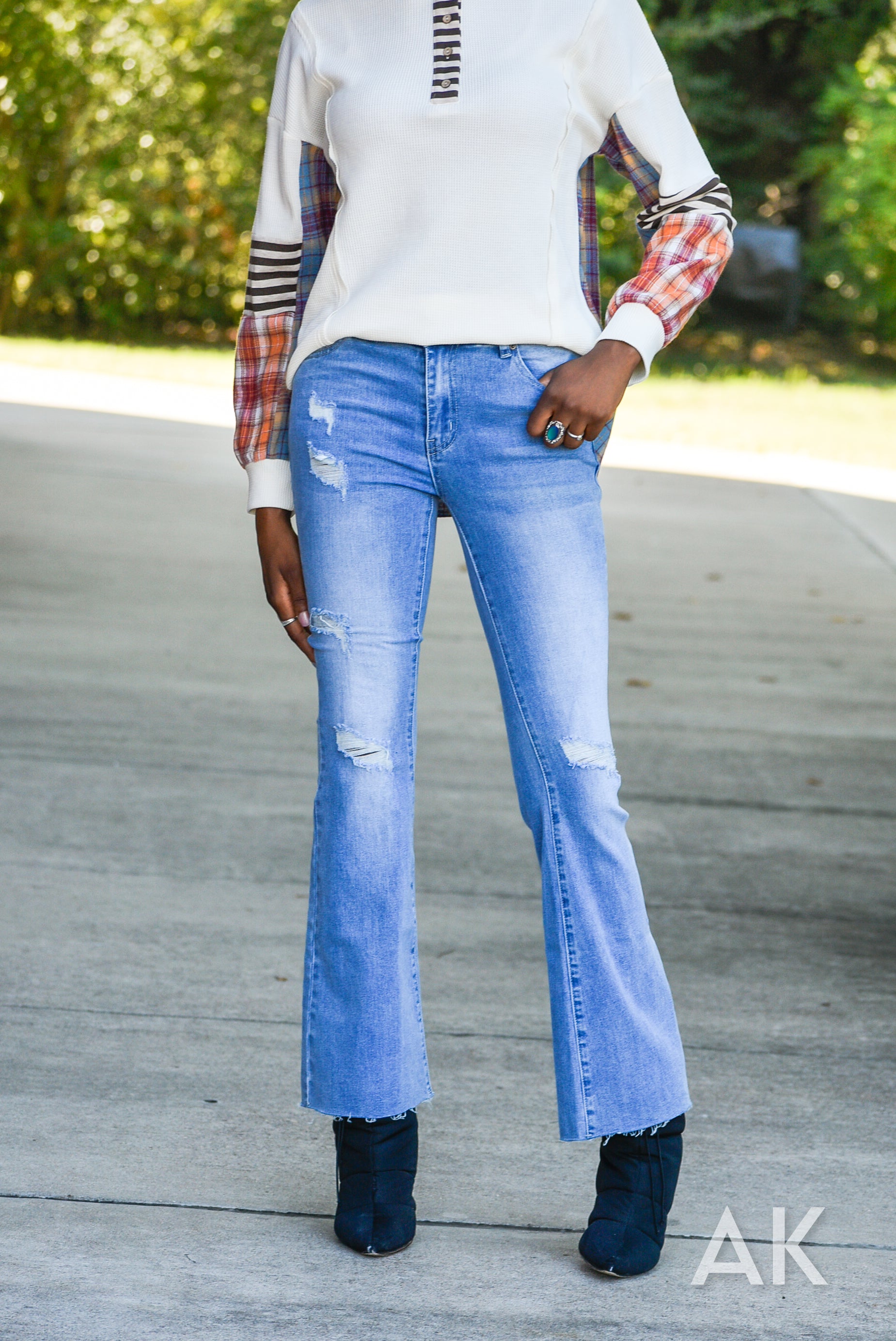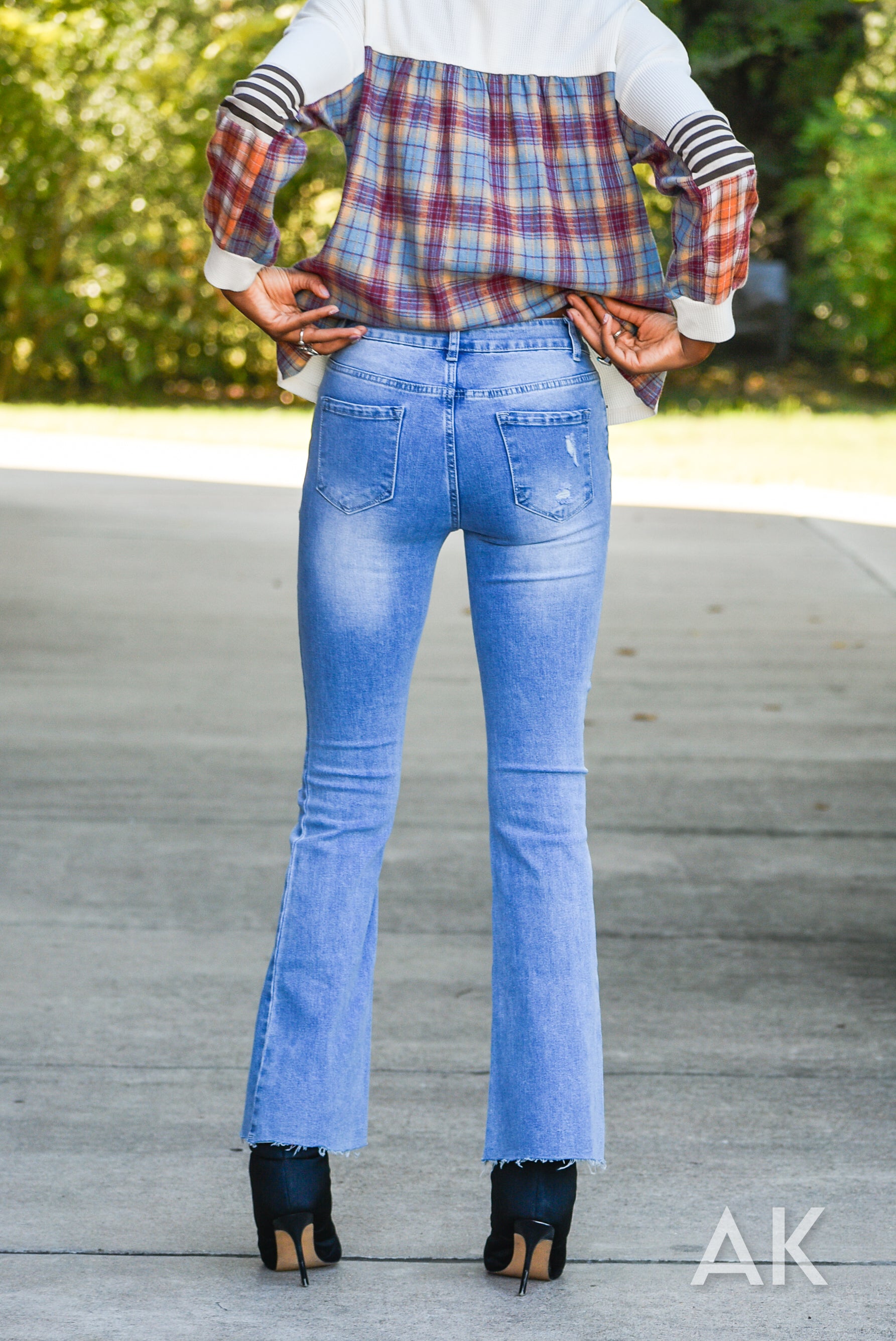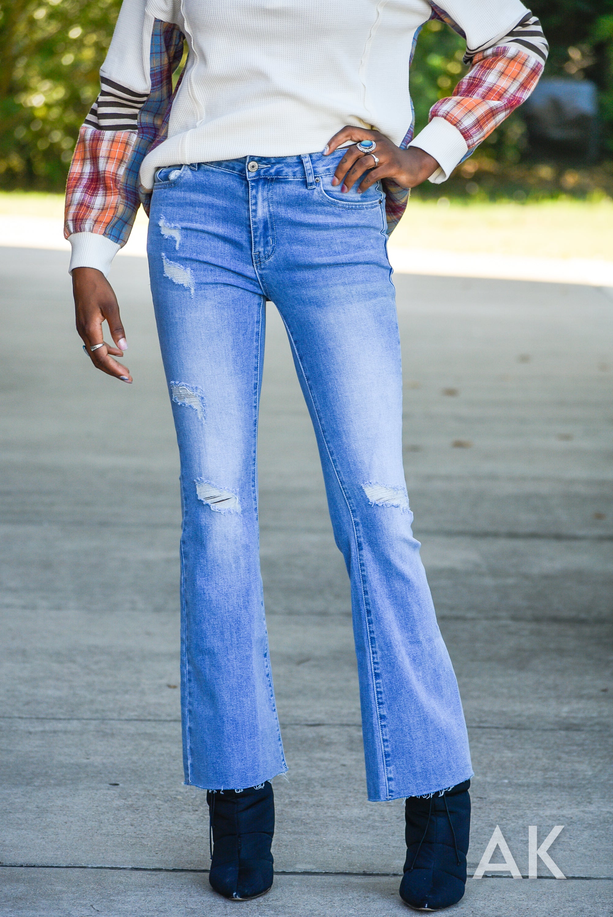 Everyone needs a good pair of light wash jeans for this season and the Wynn is the perfect pair. These flared jeans feature a mid rise, some distressing and a raw hem. They have good stretch for a comfy and super flattering fit. Pair these with all your fave tops!