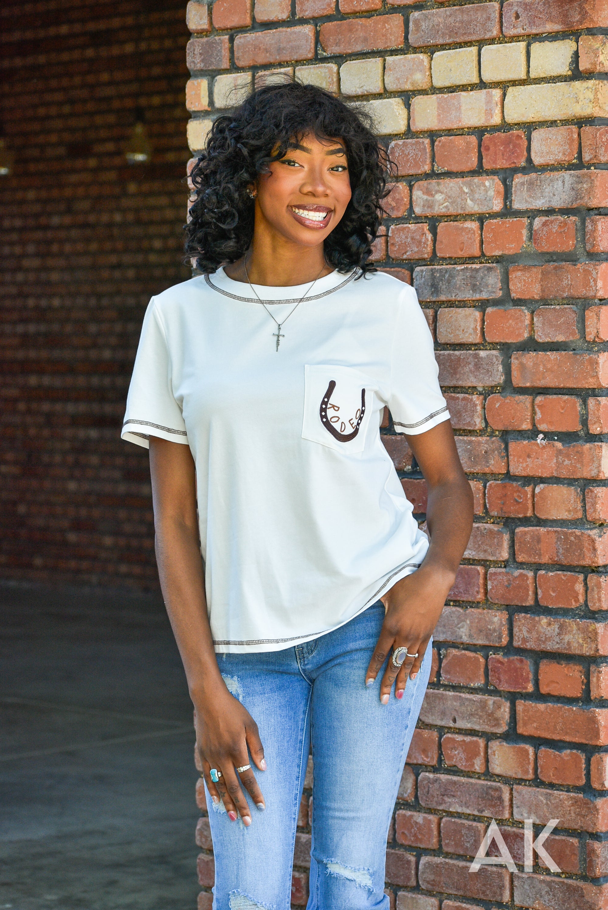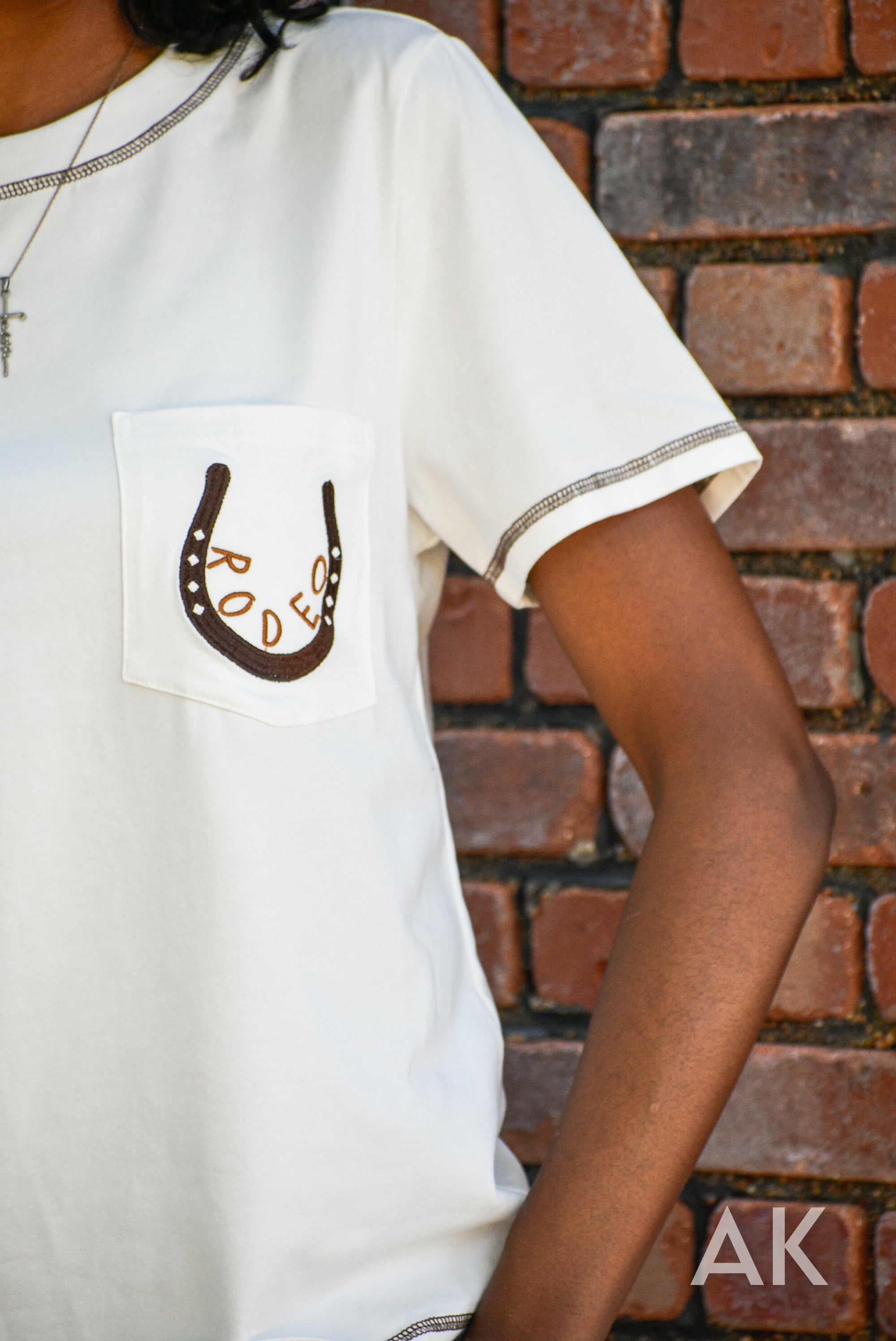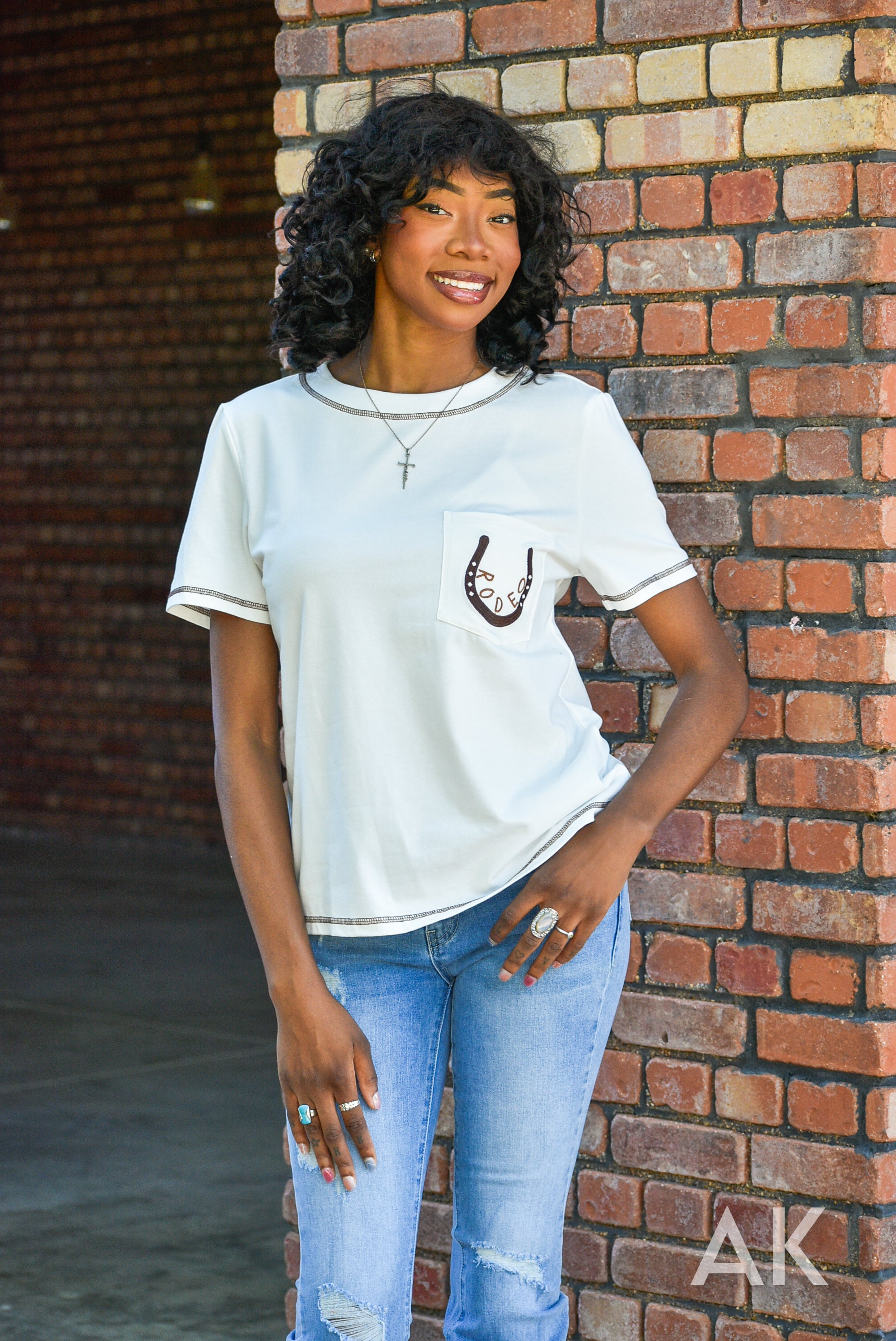 Jane is the perfect top for heading to the rodeo! This white, super soft tee features stitching details at the neck and sleeves, along with a fun horseshoe design and the word 'rodeo' on the pocket. Grab your boots and go!