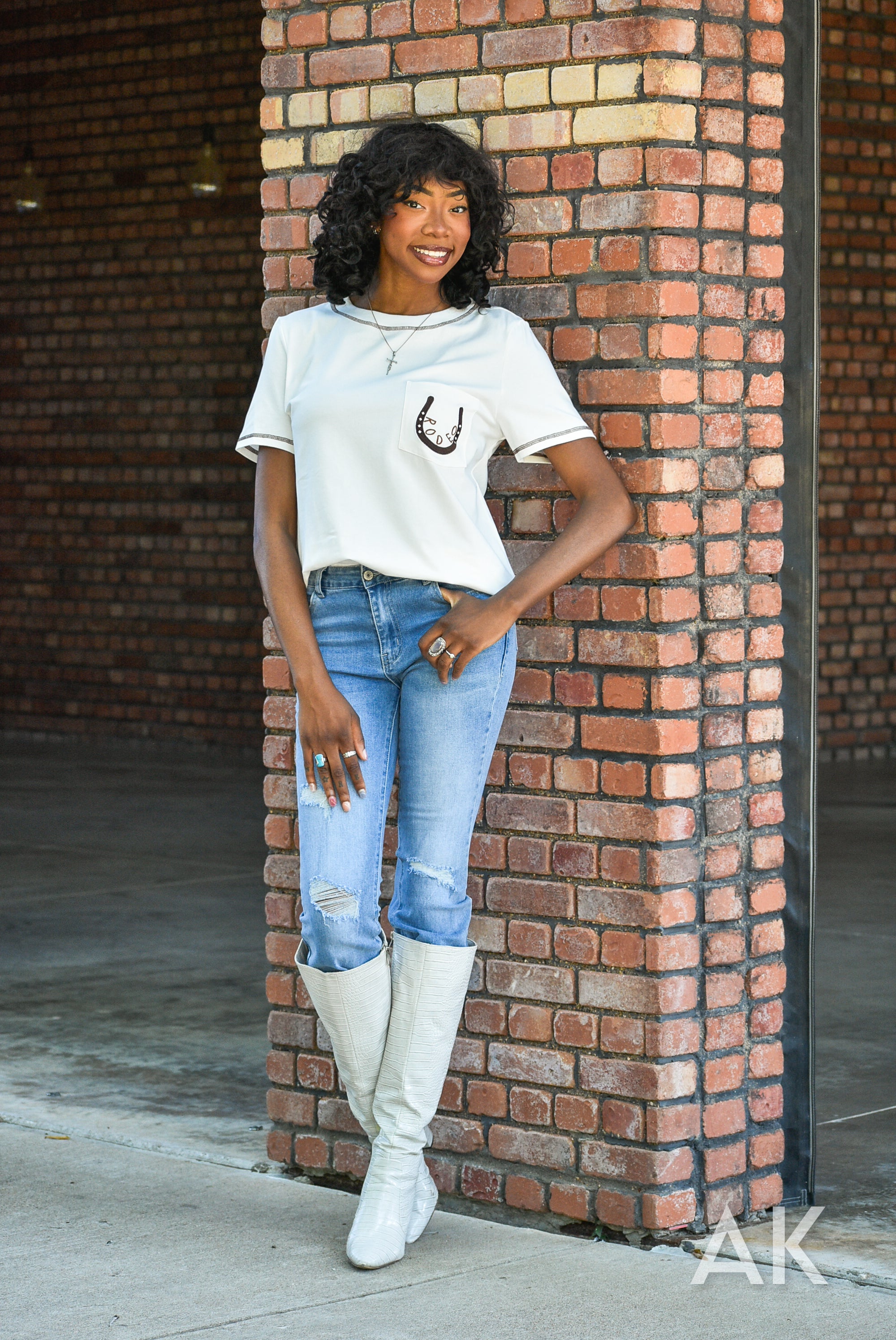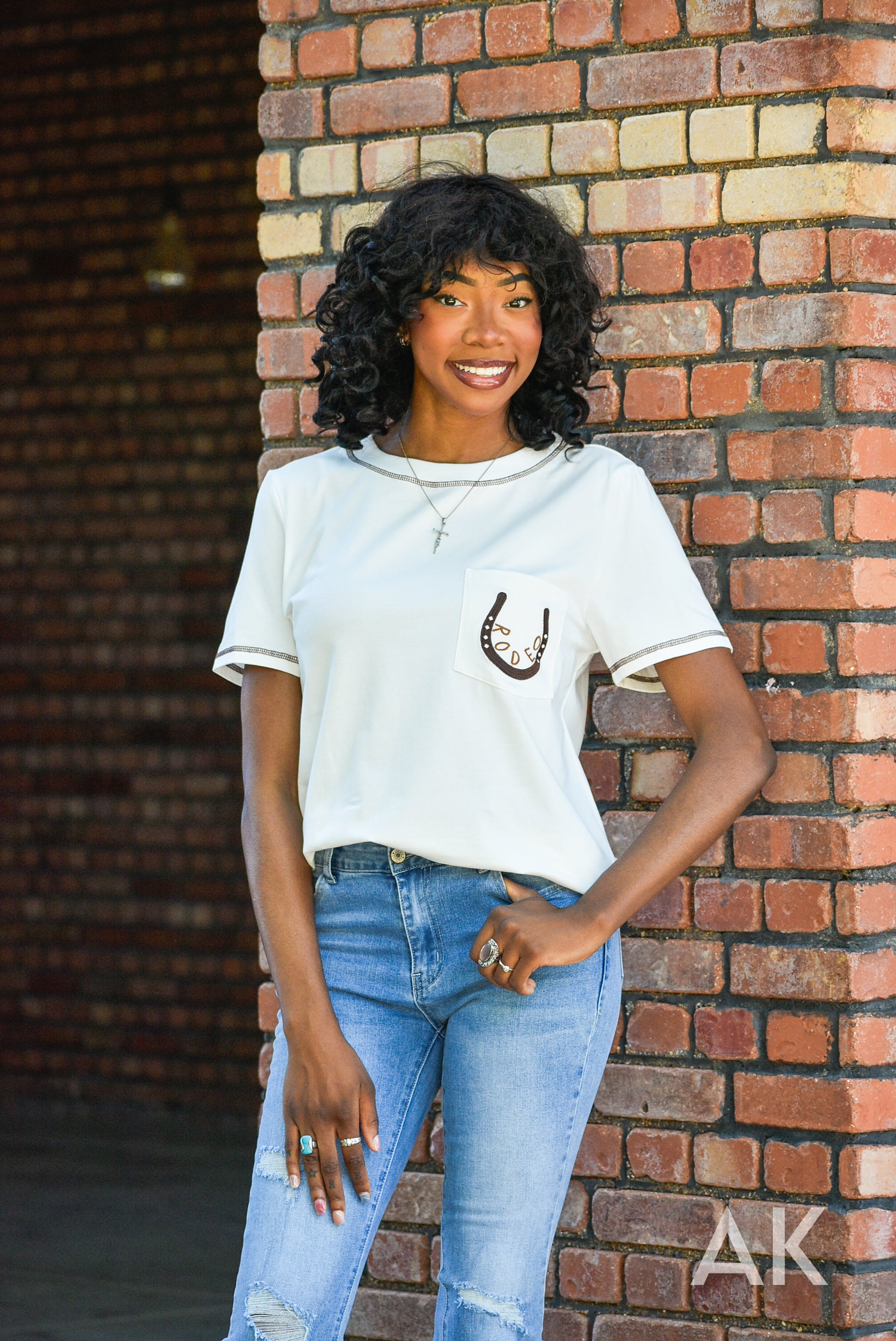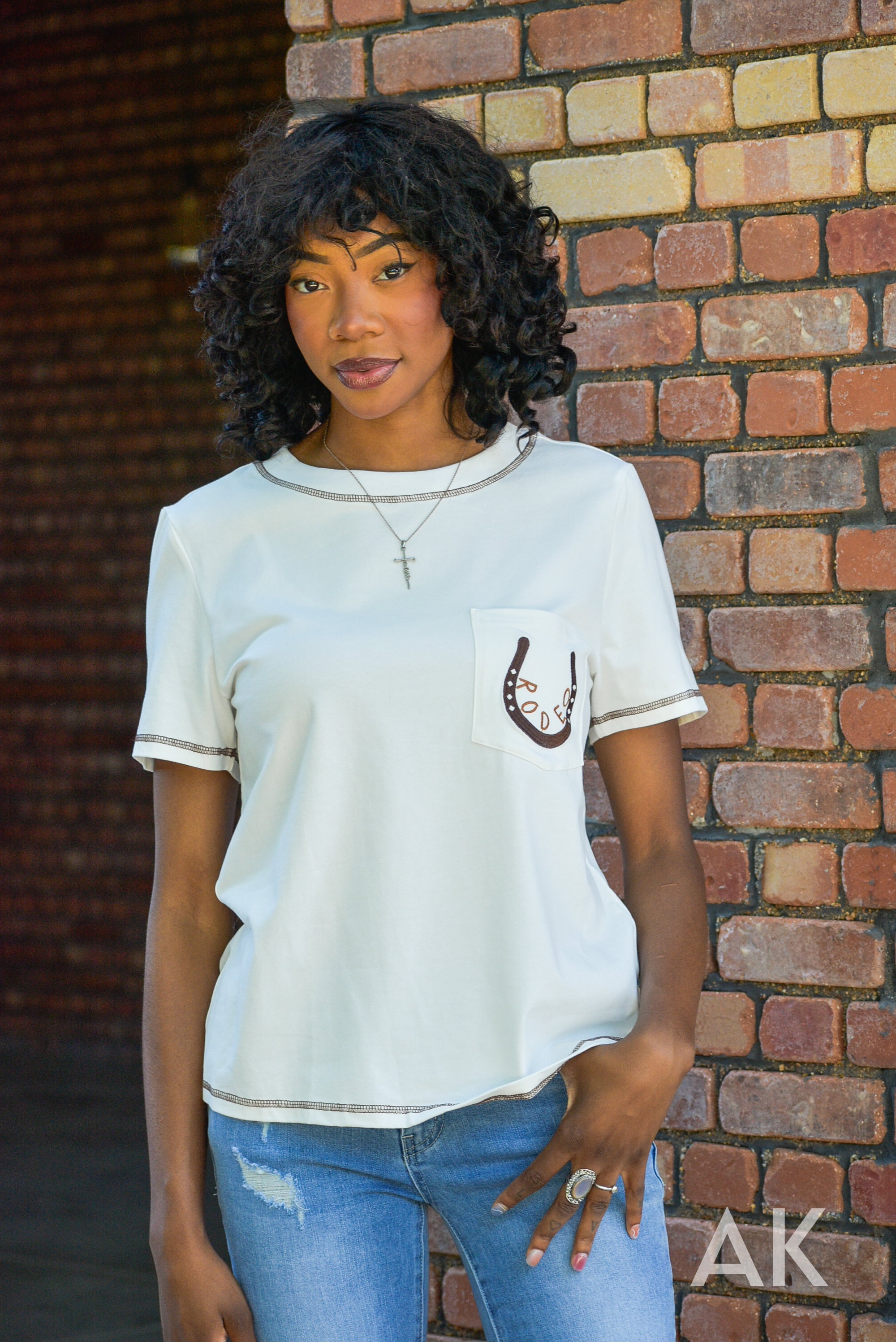 Jane is the perfect top for heading to the rodeo! This white, super soft tee features stitching details at the neck and sleeves, along with a fun horseshoe design and the word 'rodeo' on the pocket. Grab your boots and go!