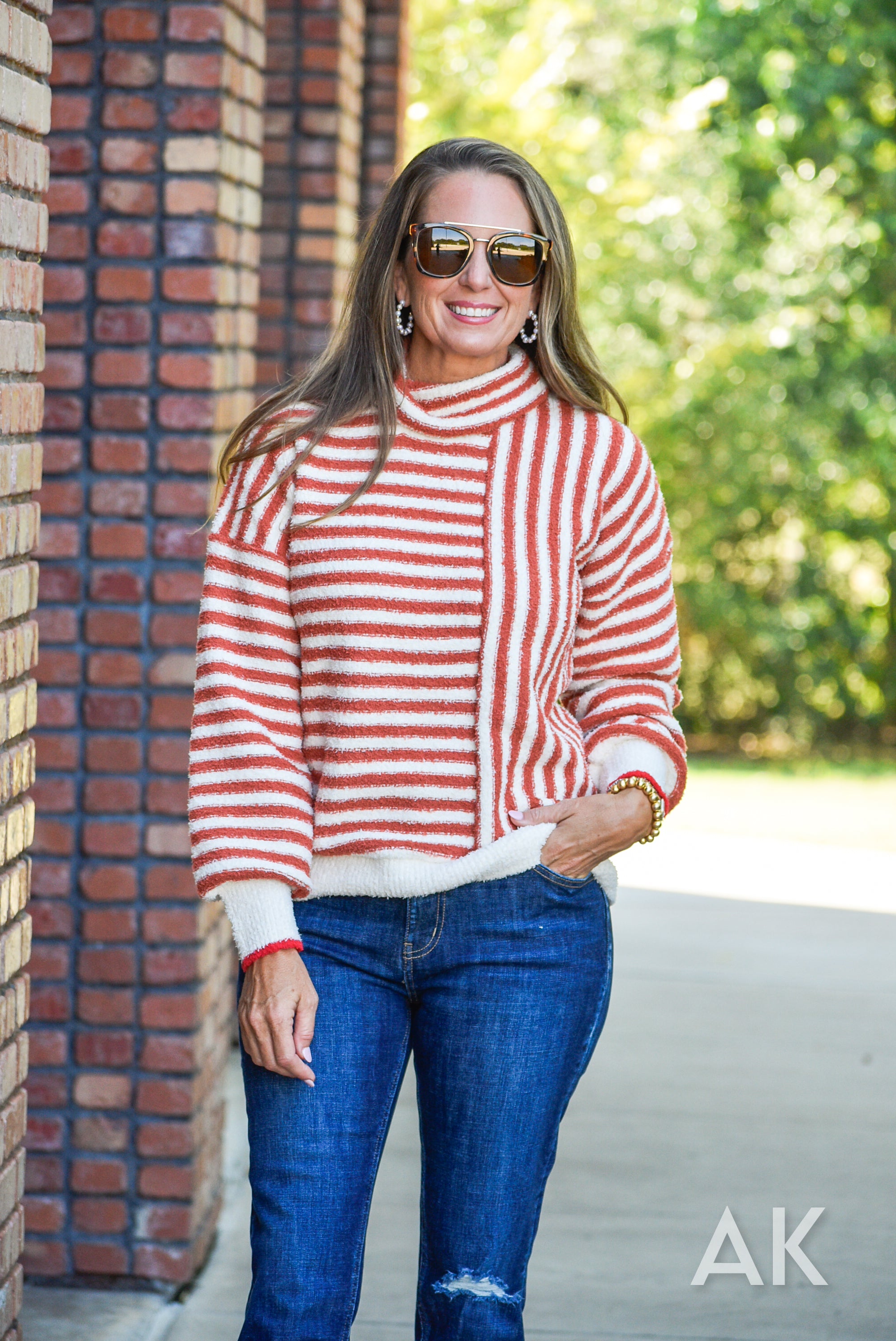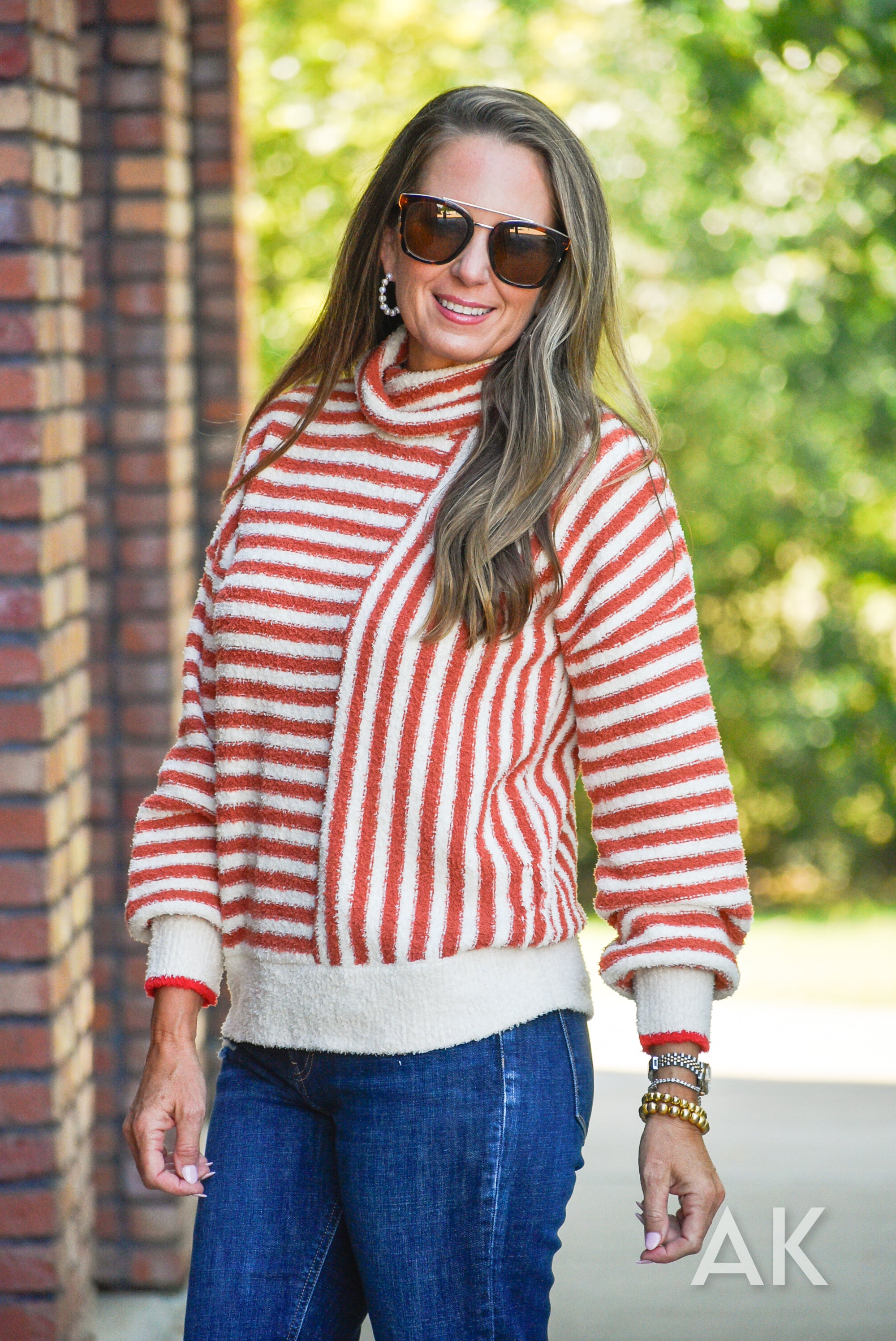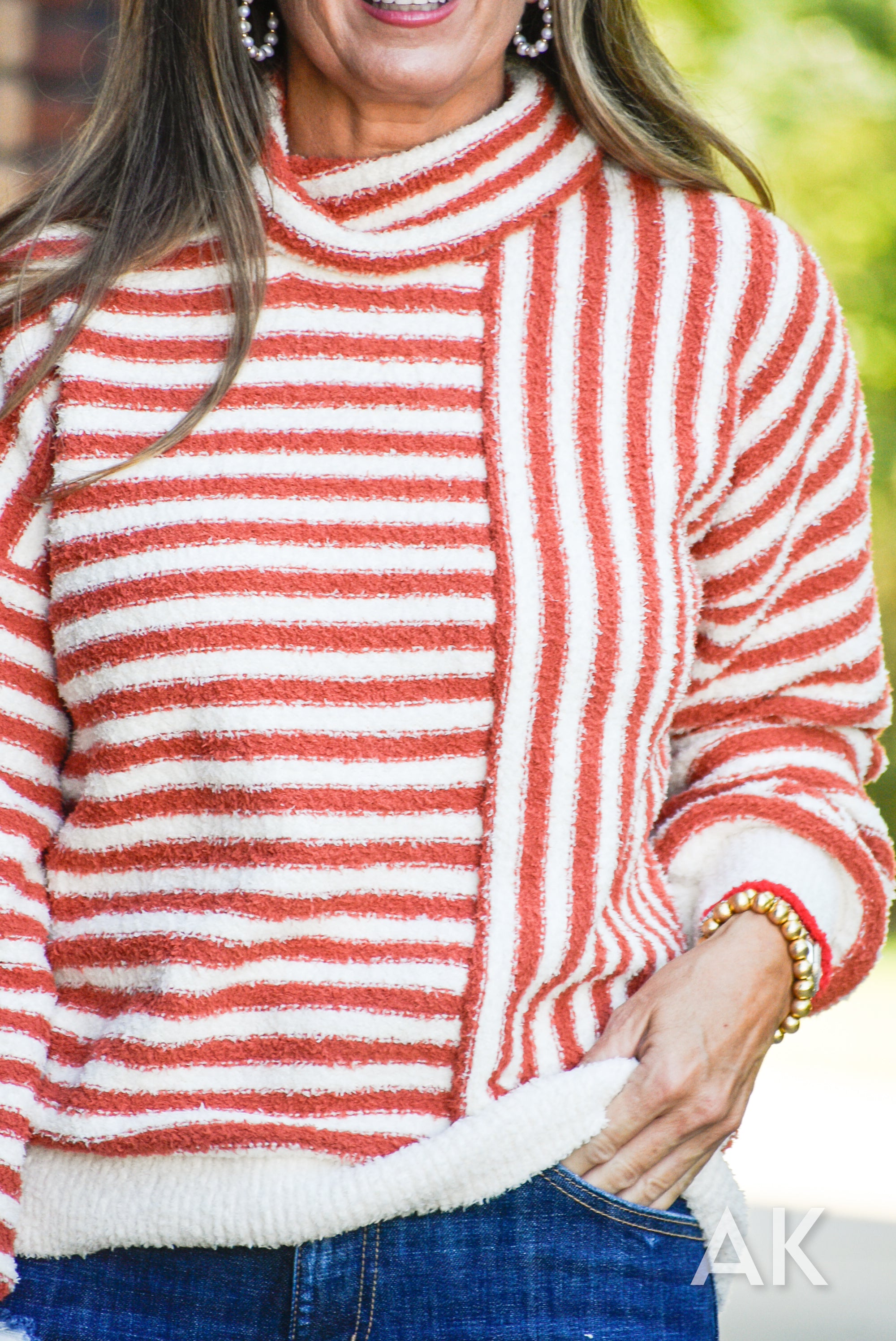 Reston is like being wrapped in a cozy blanket by the fire! The cowl neck design is paired with striped caramel and cream colors with a fun pop of red at the edge of the sleeve. The drop shoulder makes it comfortable and relaxed.
