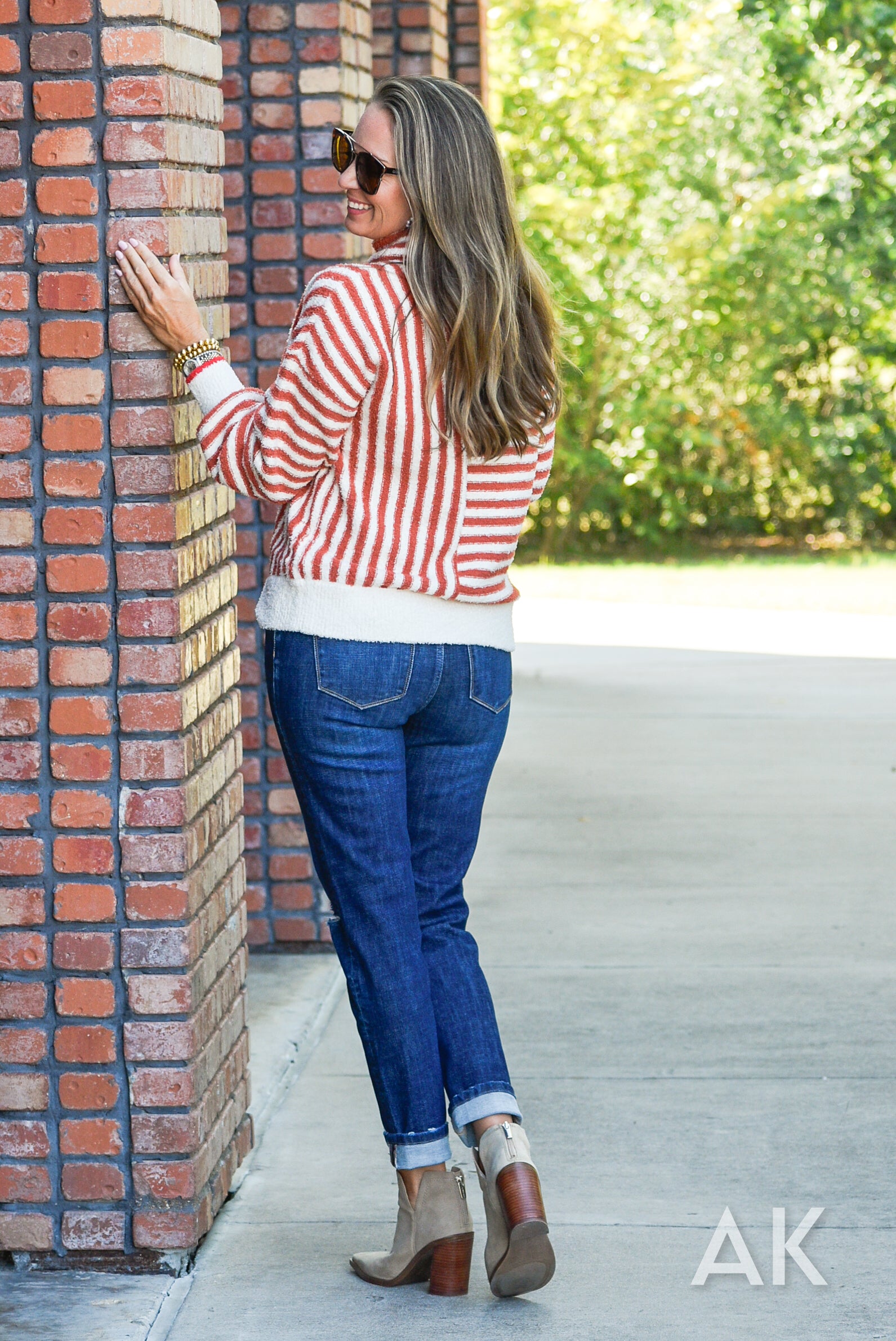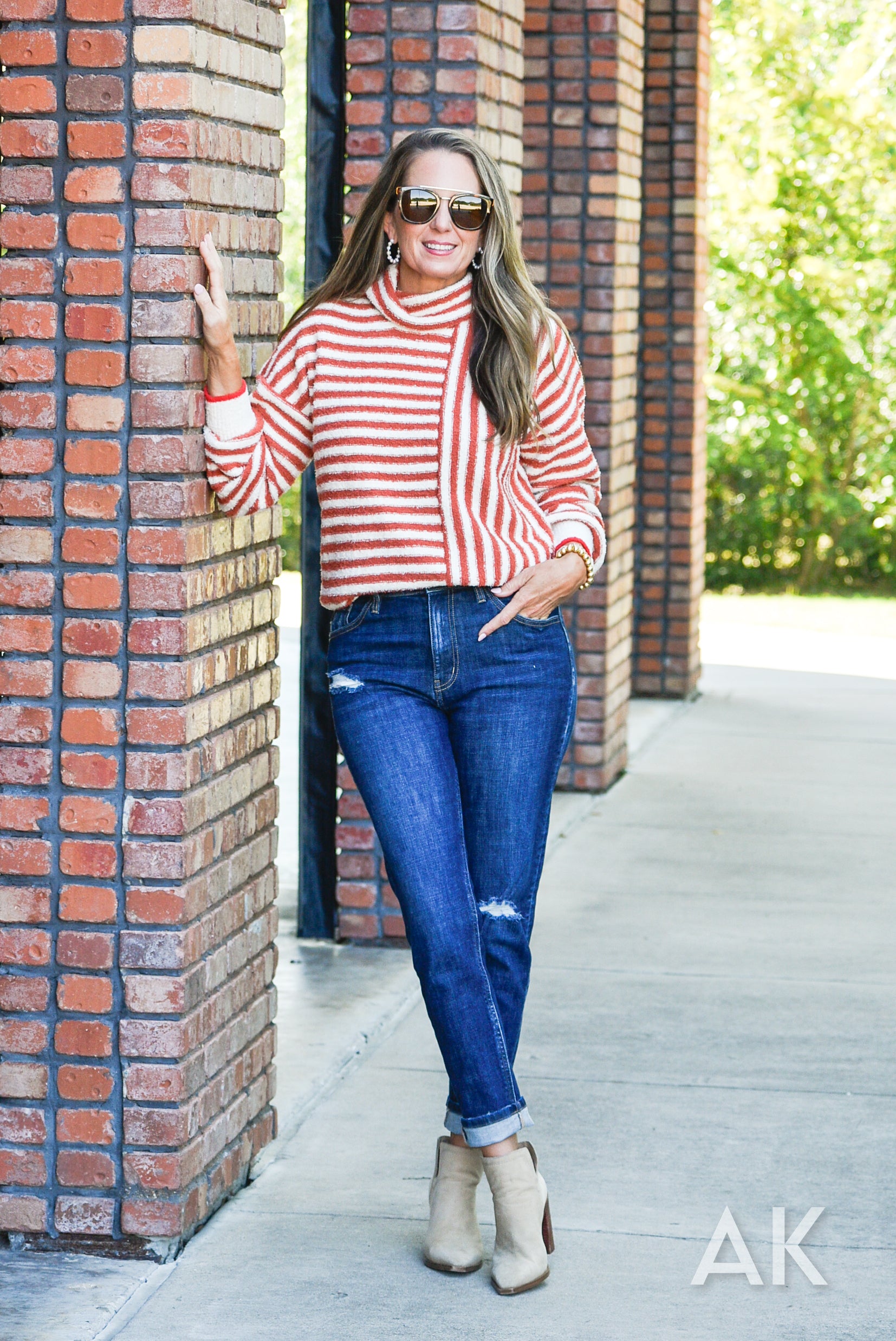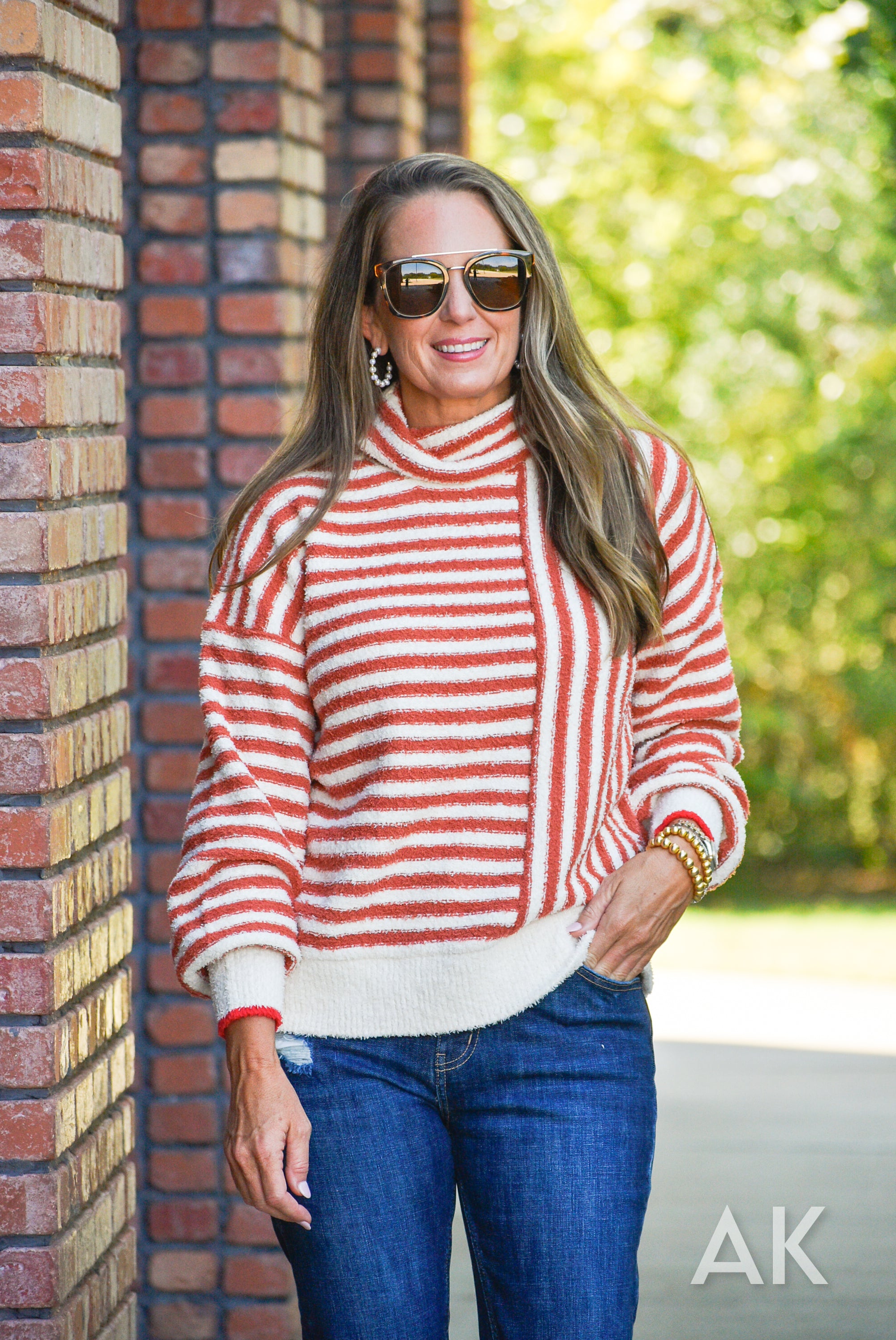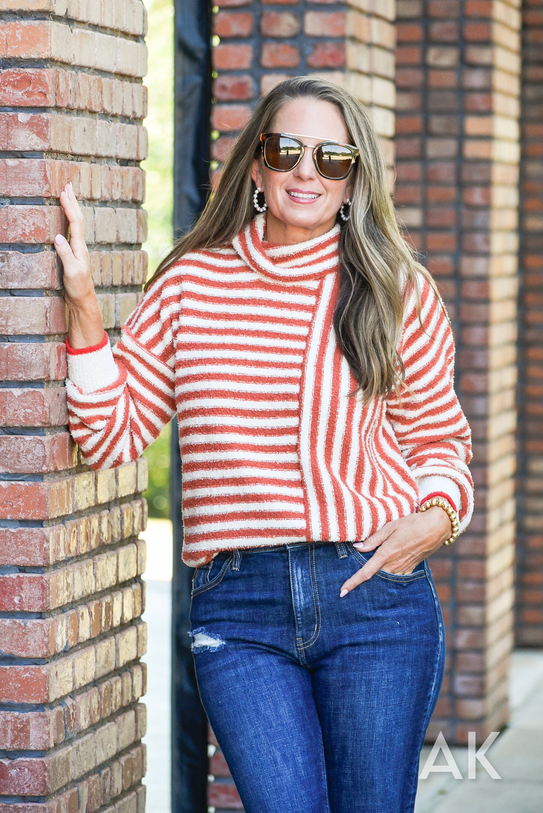 Reston is like being wrapped in a cozy blanket by the fire! The cowl neck design is paired with striped caramel and cream colors with a fun pop of red at the edge of the sleeve. The drop shoulder makes it comfortable and relaxed.