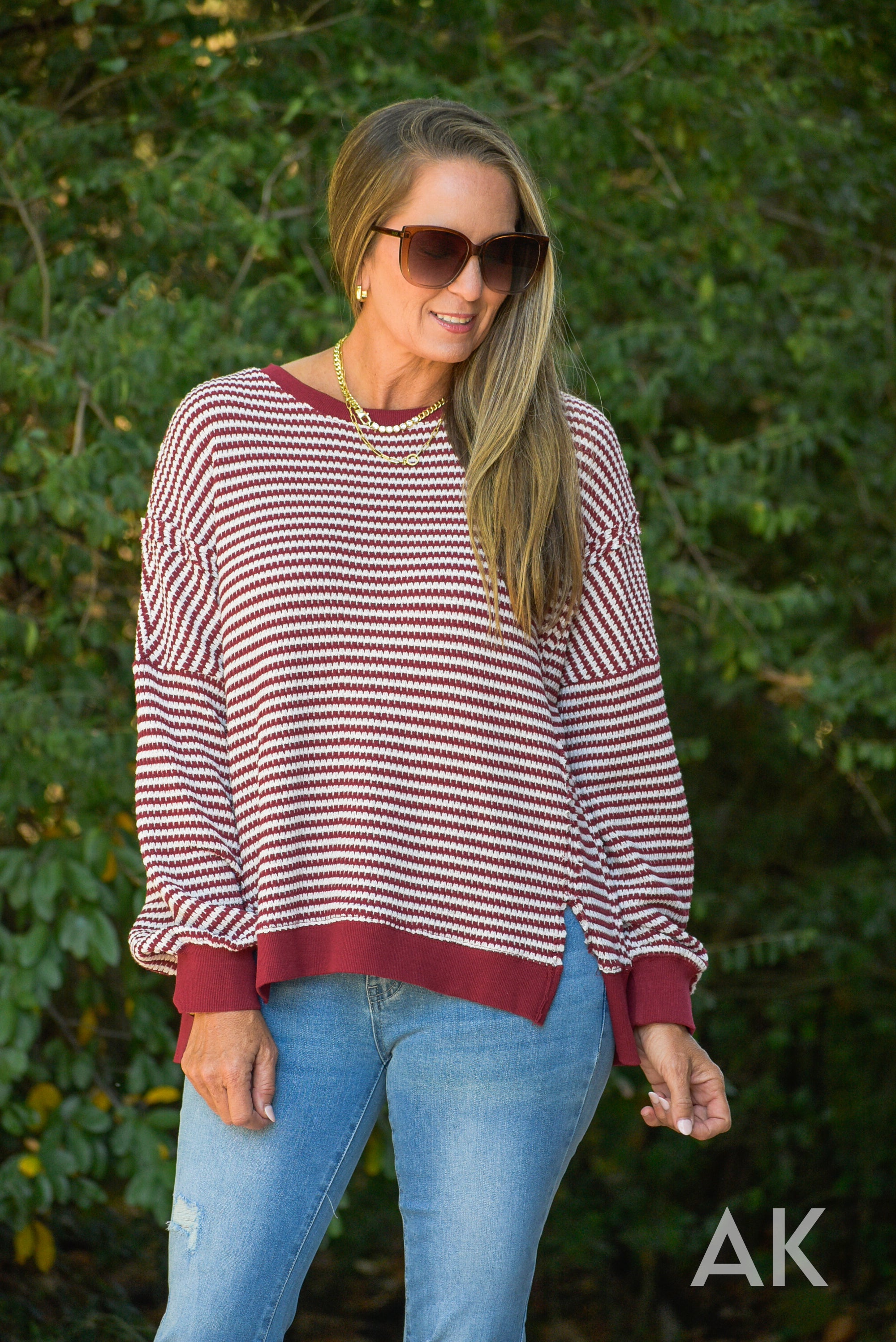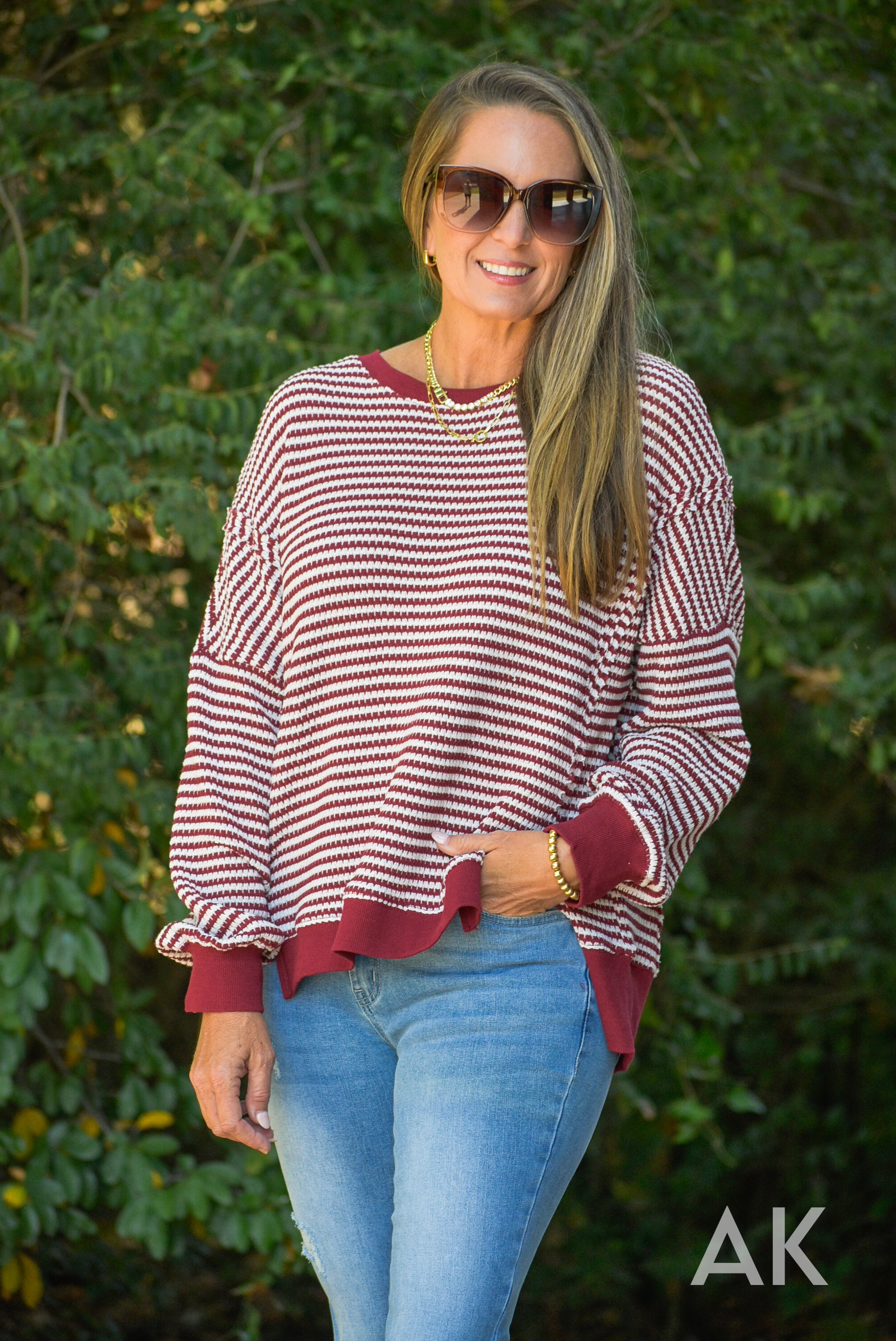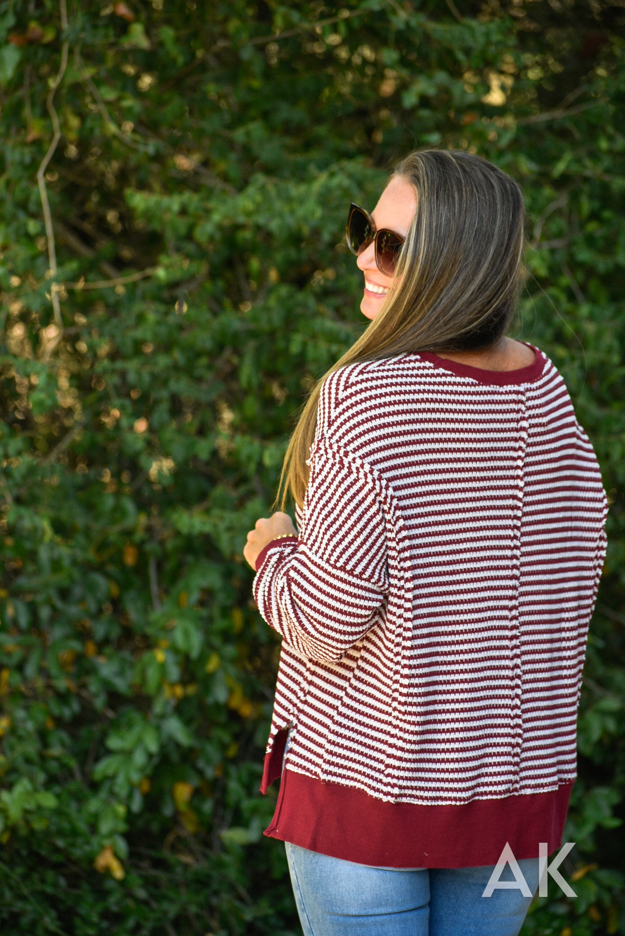 This maroon red striped knit top is so soft and easy to wear. We love the textured fabric and exposed hems that give it a unique look!