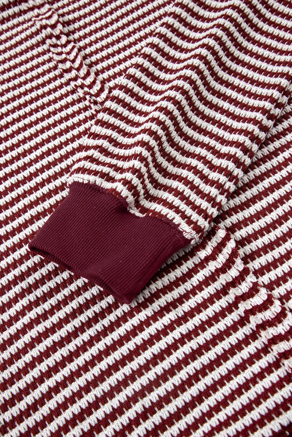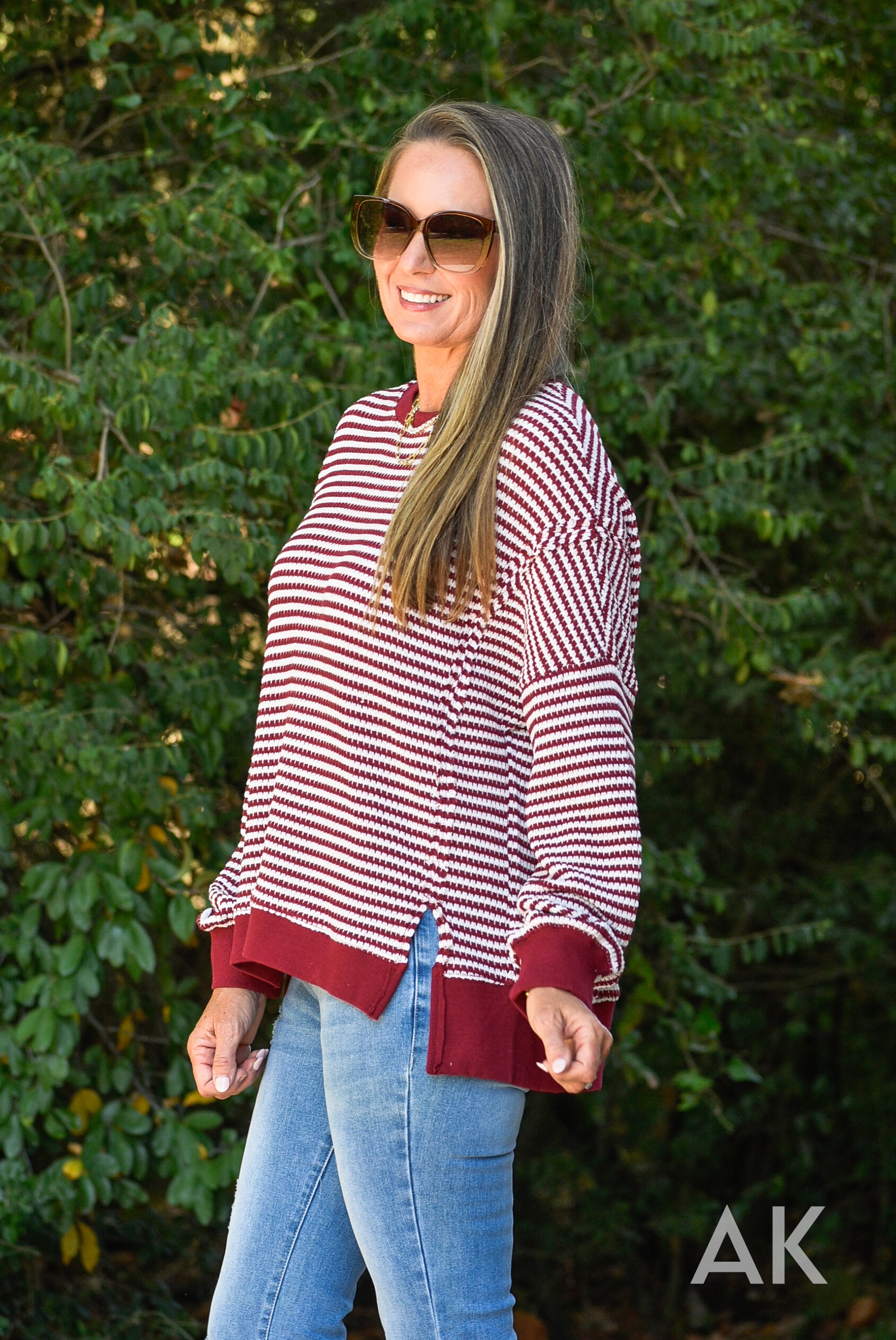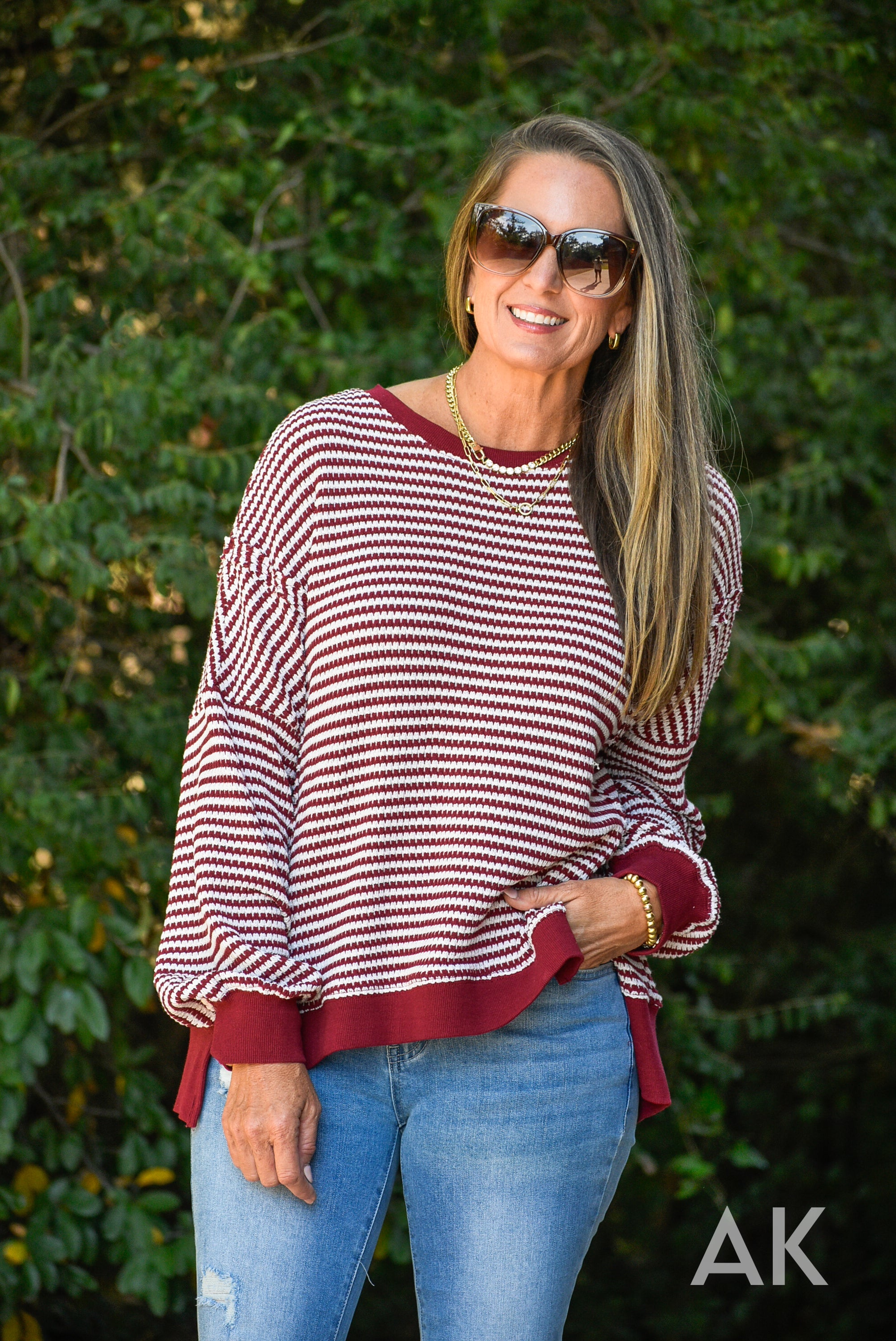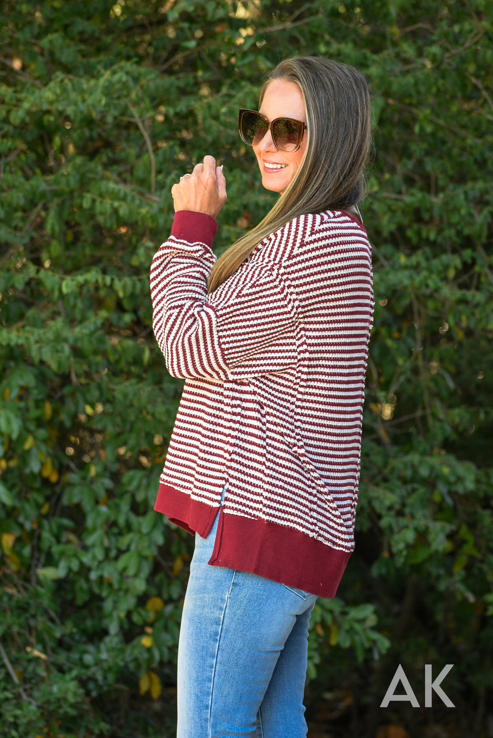 This maroon red striped knit top is so soft and easy to wear. We love the textured fabric and exposed hems that give it a unique look!