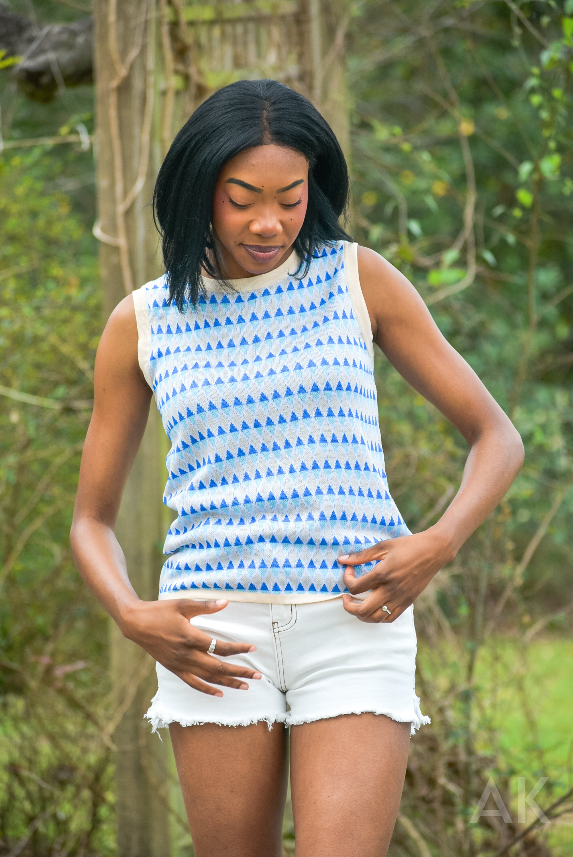 An easy top you'll reach for again and again! Avery is a sleeveless knit top featuring a blue and white geometric pattern and classic crew neckline for a fun, casual look. Looks great with denim shorts, jeans, or white denim.