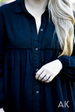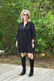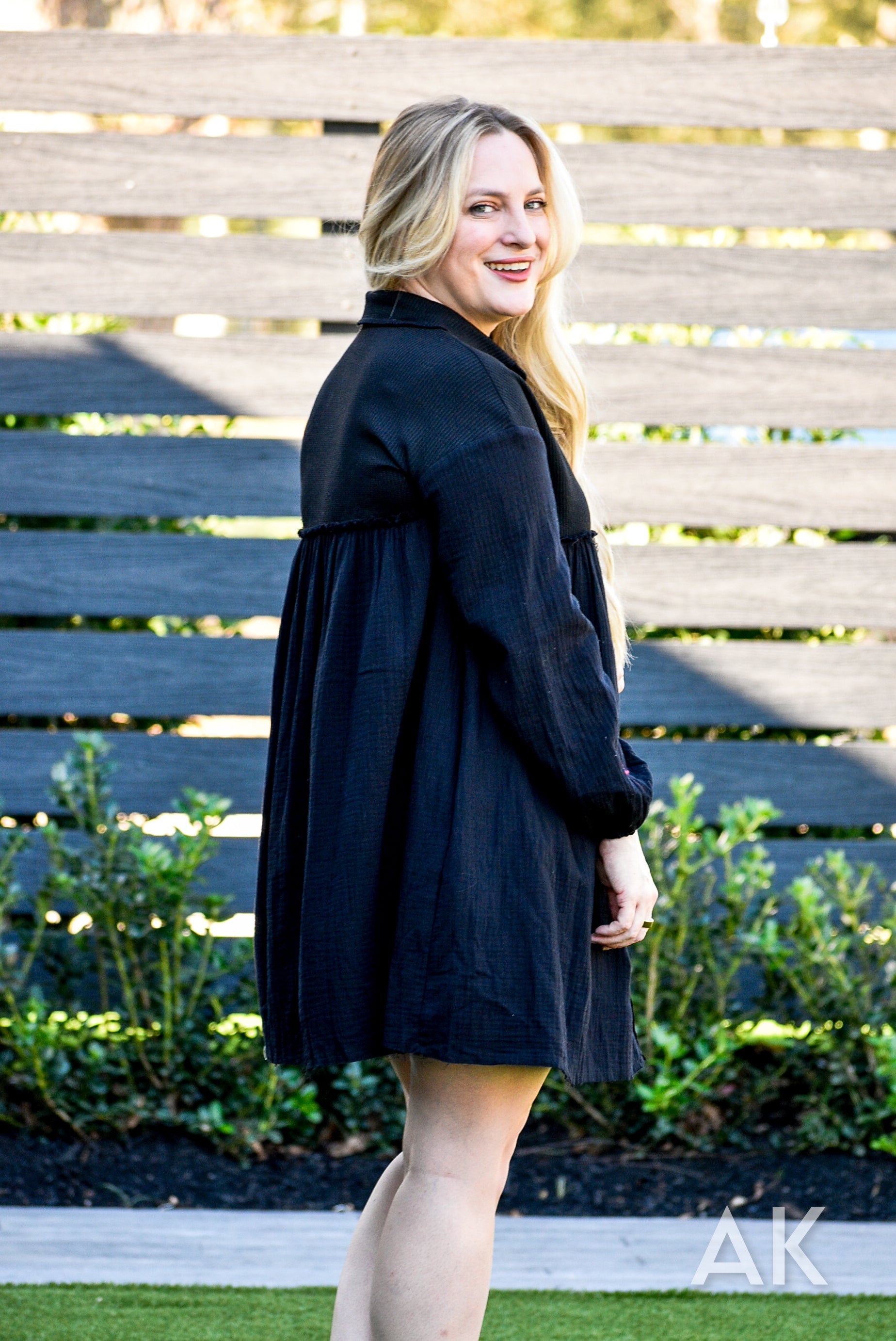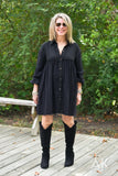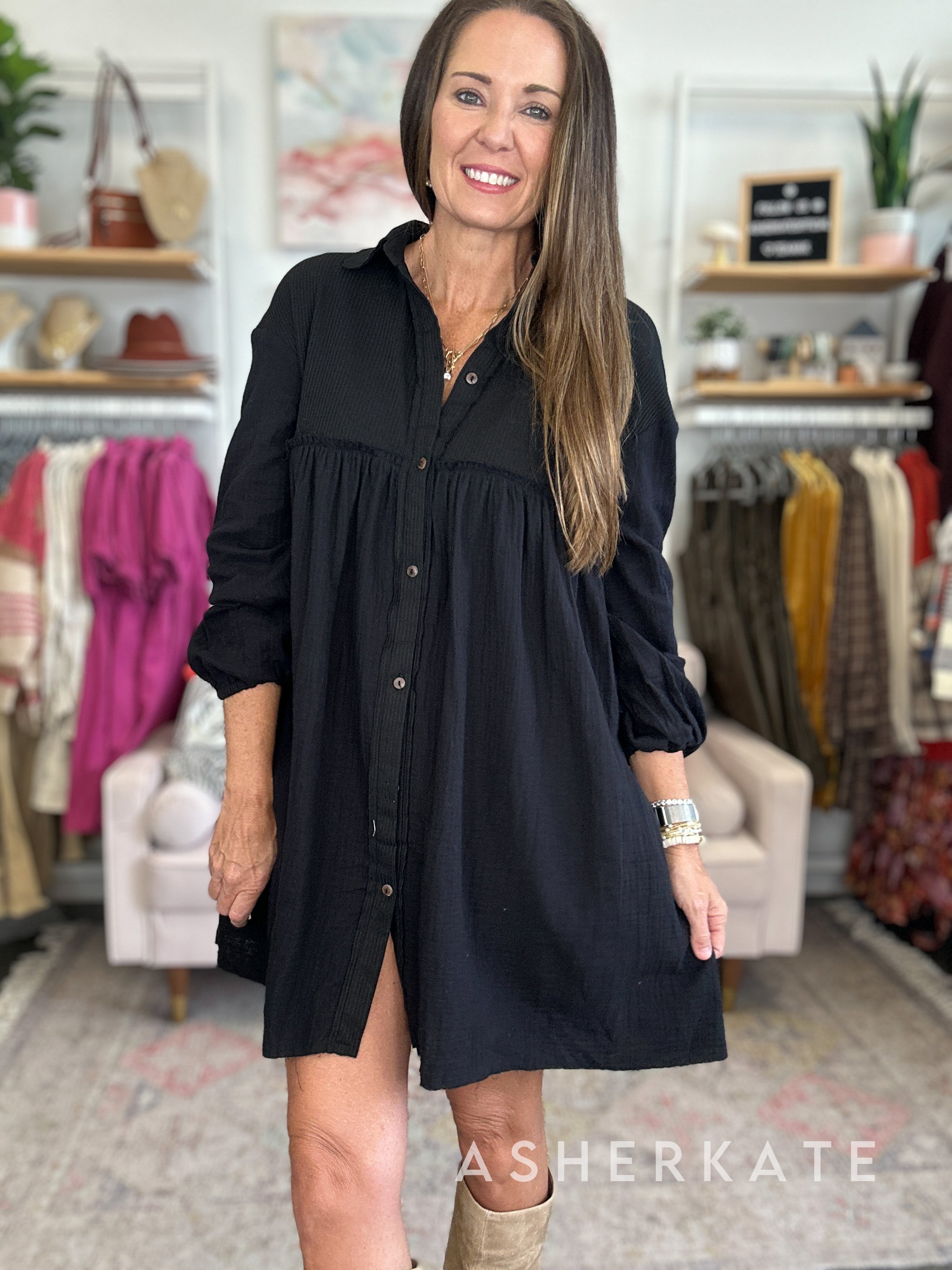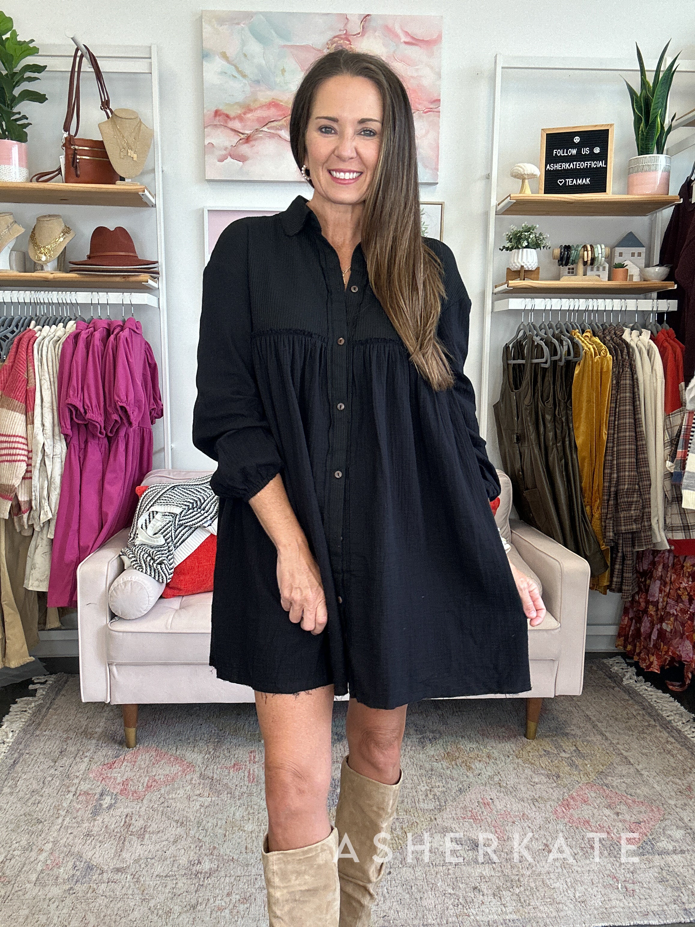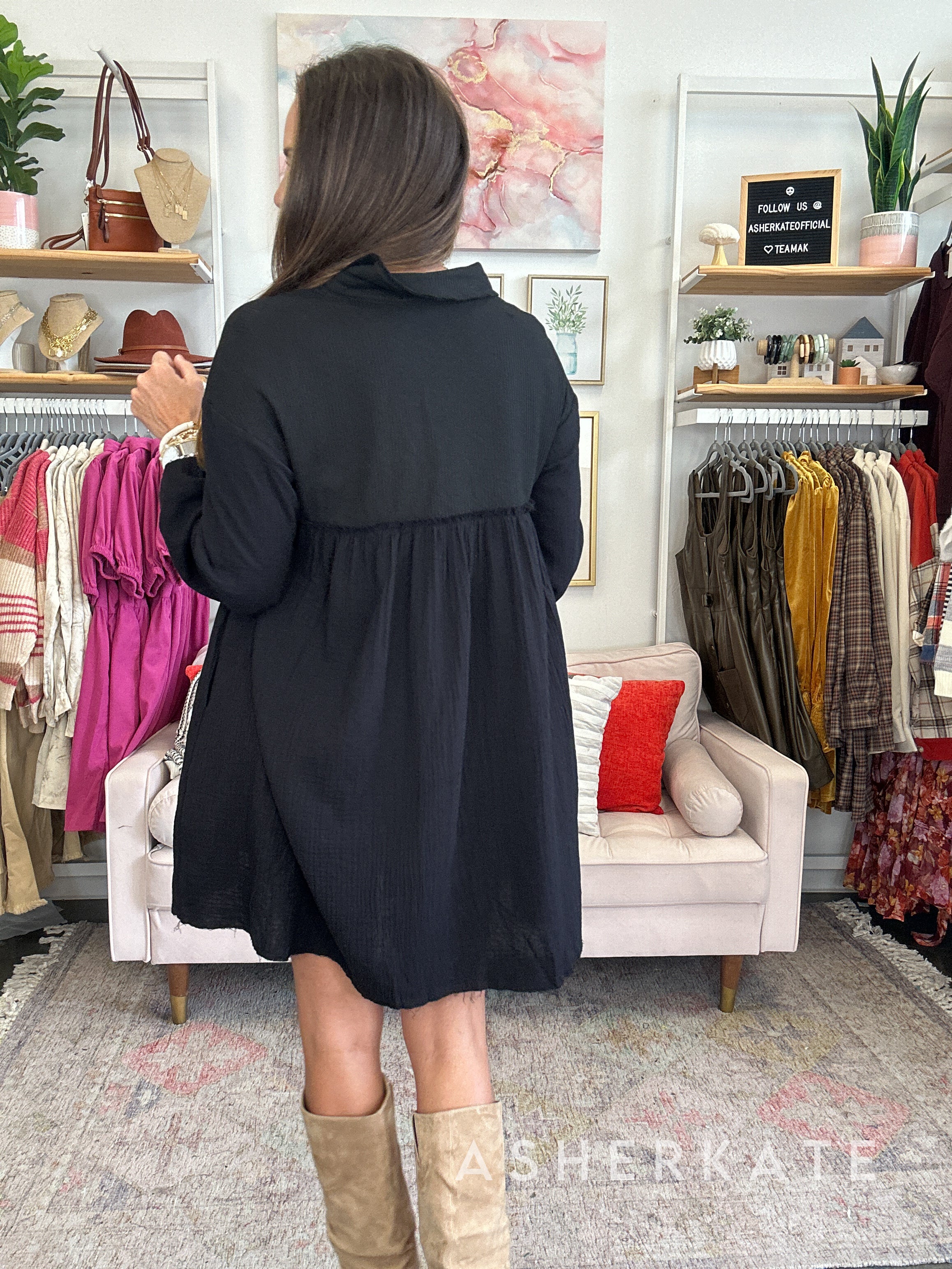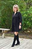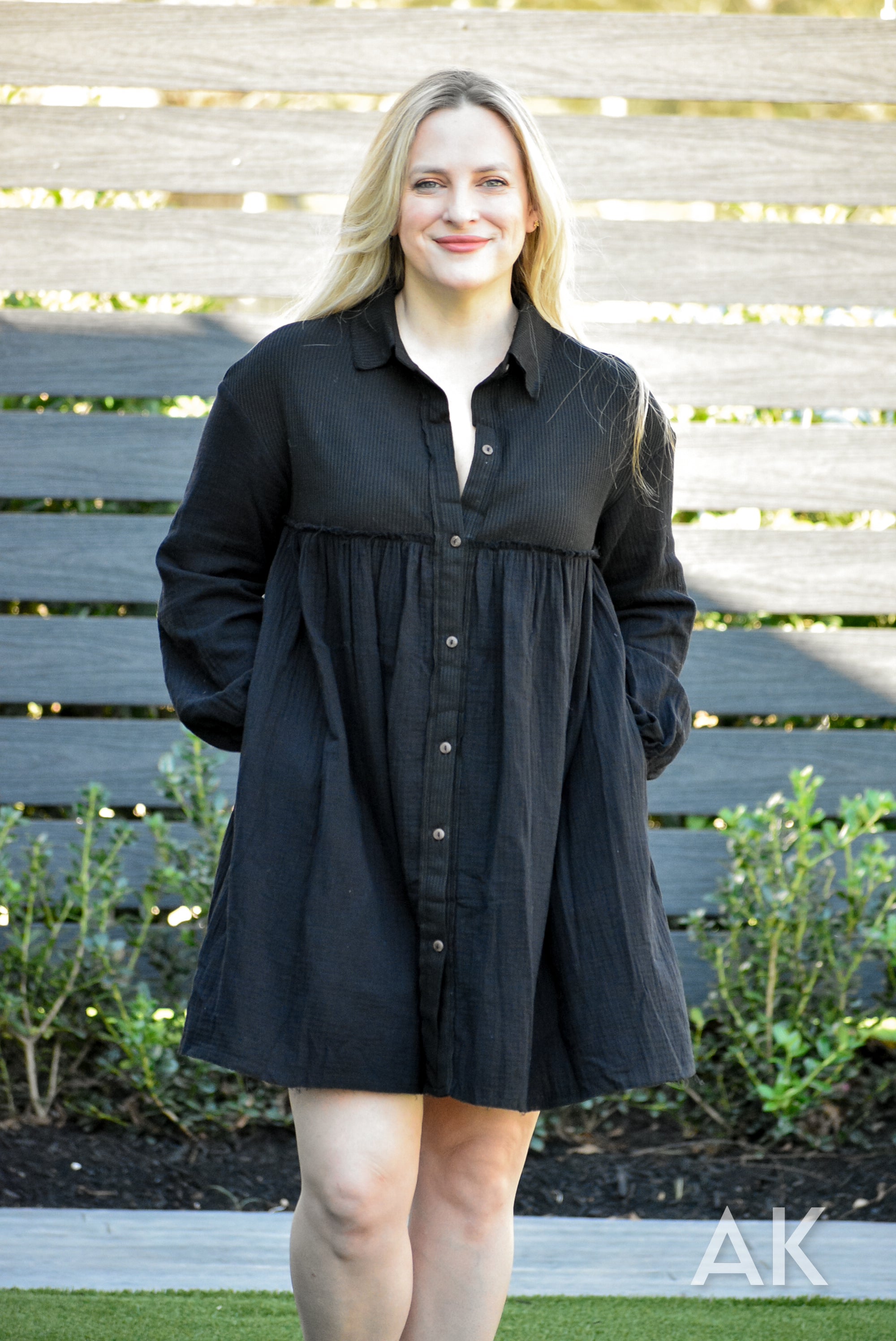 How cute is this Beck dress?! This black flowy dress has a super fun mix of fabrics. The chest and upper back feature a thermal fabric while the bottom and sleeves have a cute crepe fabric. It features a functional button down front, pockets, collared neck and elastic cuffs. The raw hem and the adorable raw ruffle on chest add cute little details.