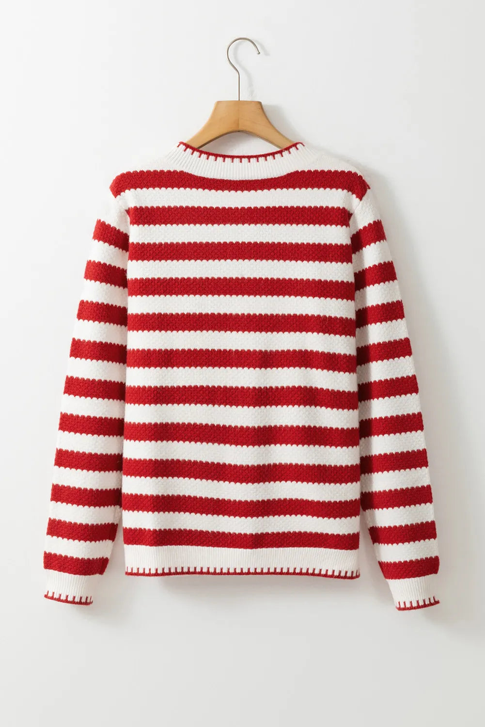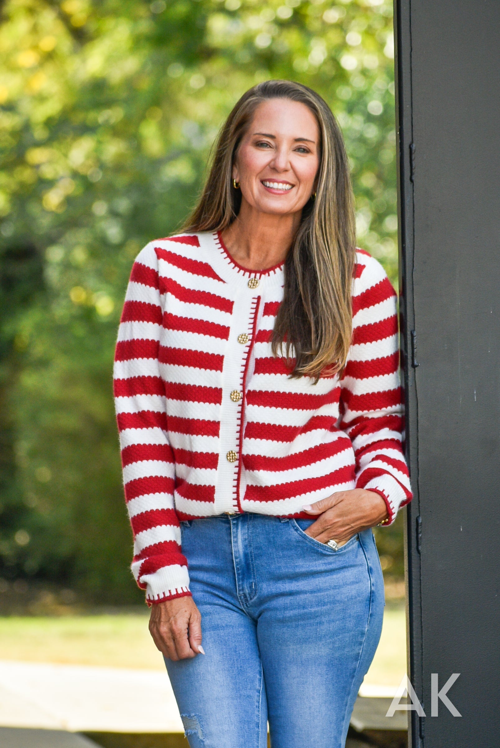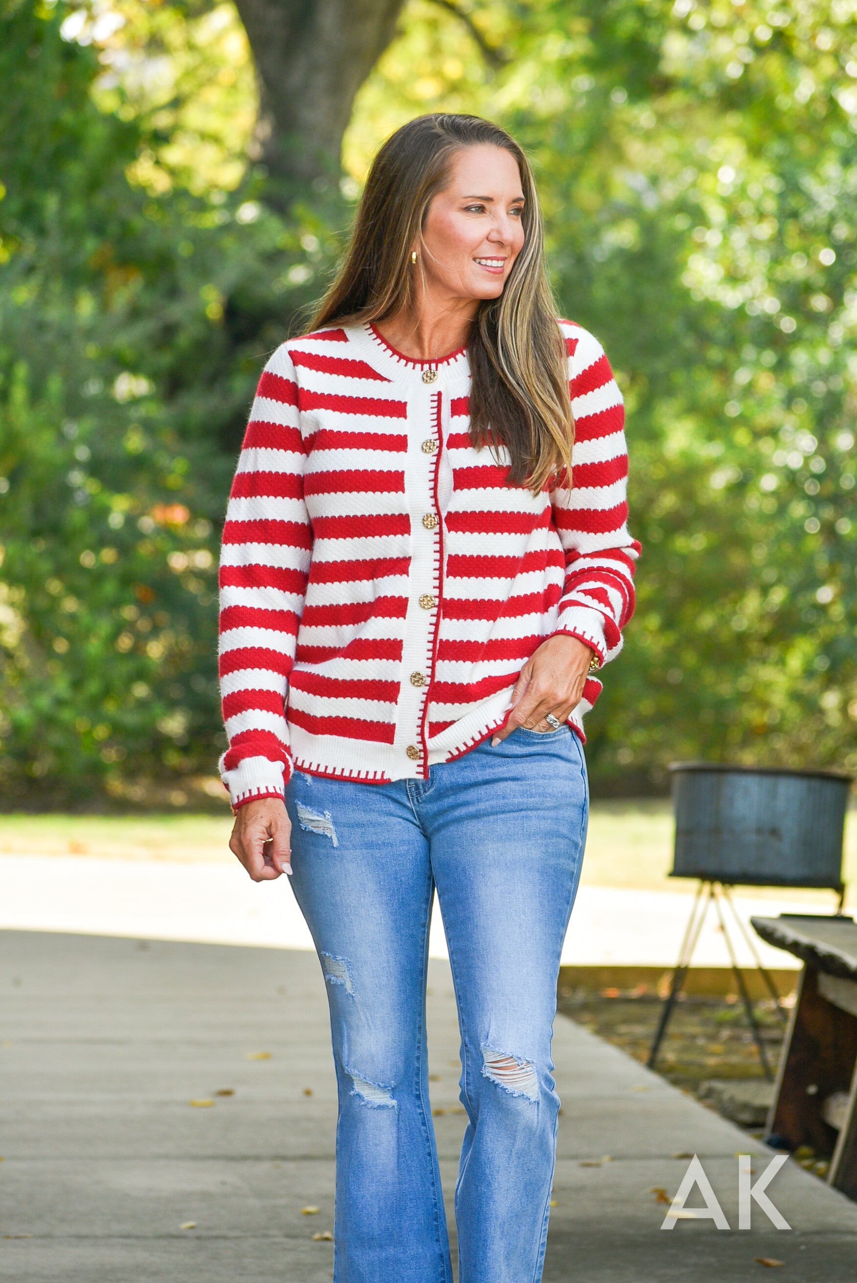 We love this red and white striped cardigan! It's ultra-soft and oh-so comfy. The hammered gold buttons give it a fancy touch.