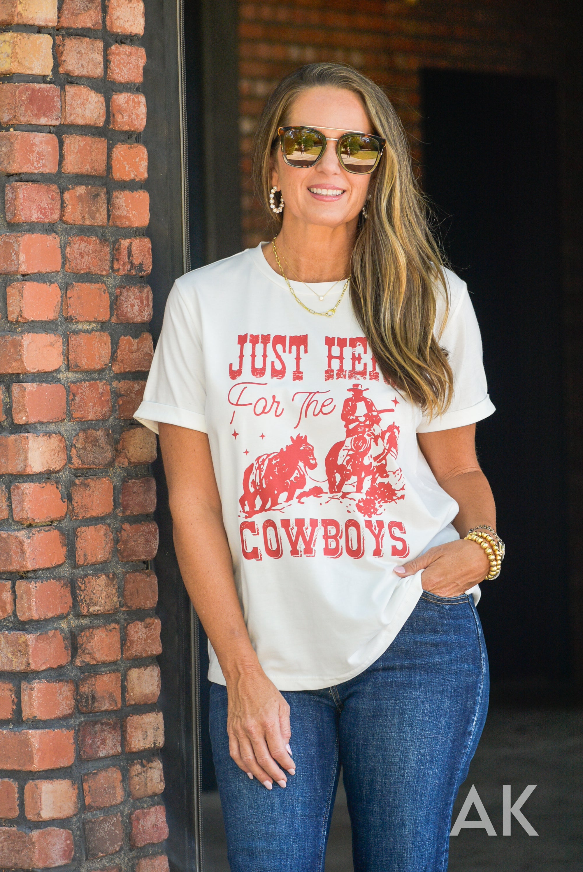 How fun is this tee? It's stretchy and cute with tacked short sleeves. The saying 'Just Here For The Cowboys' is so cute and flirty!