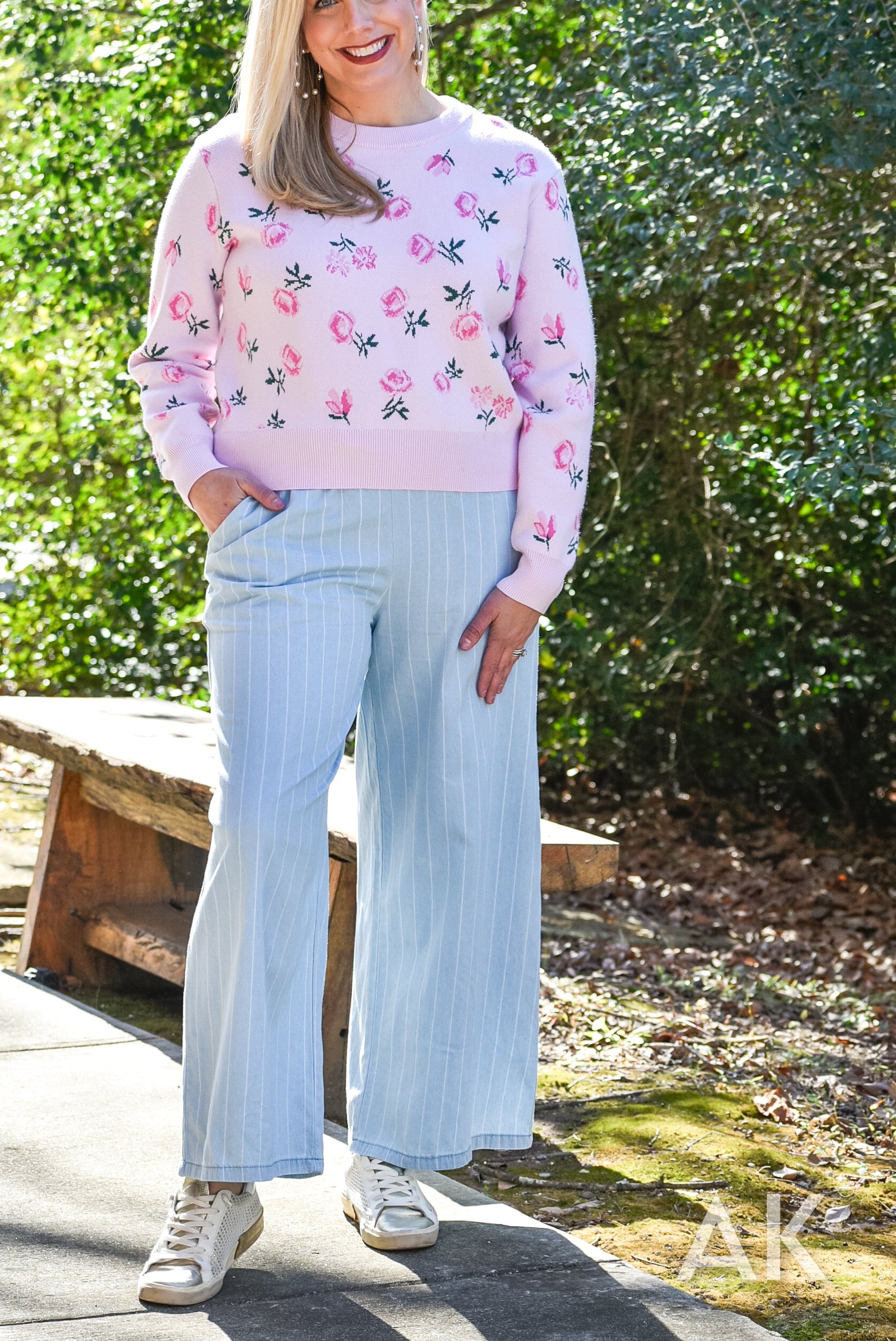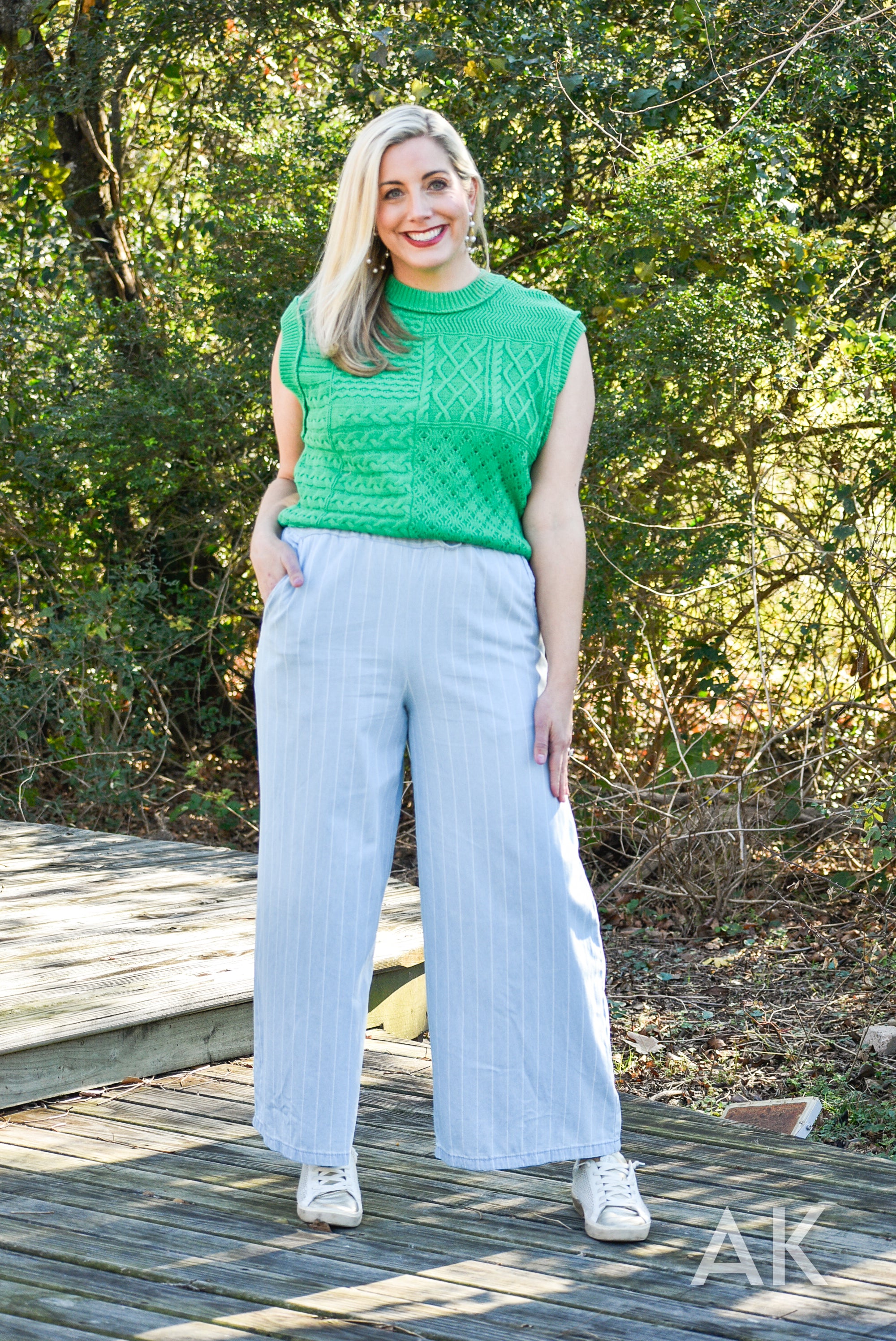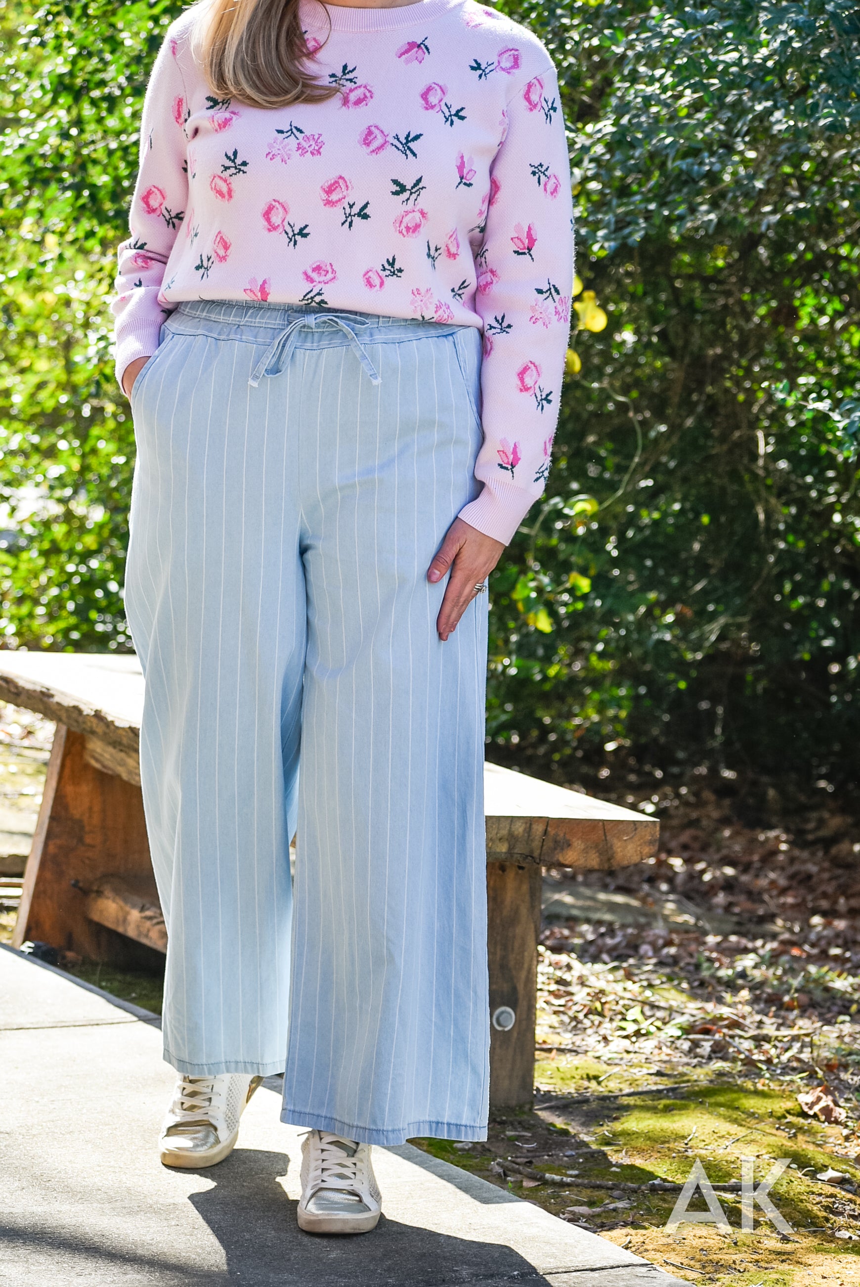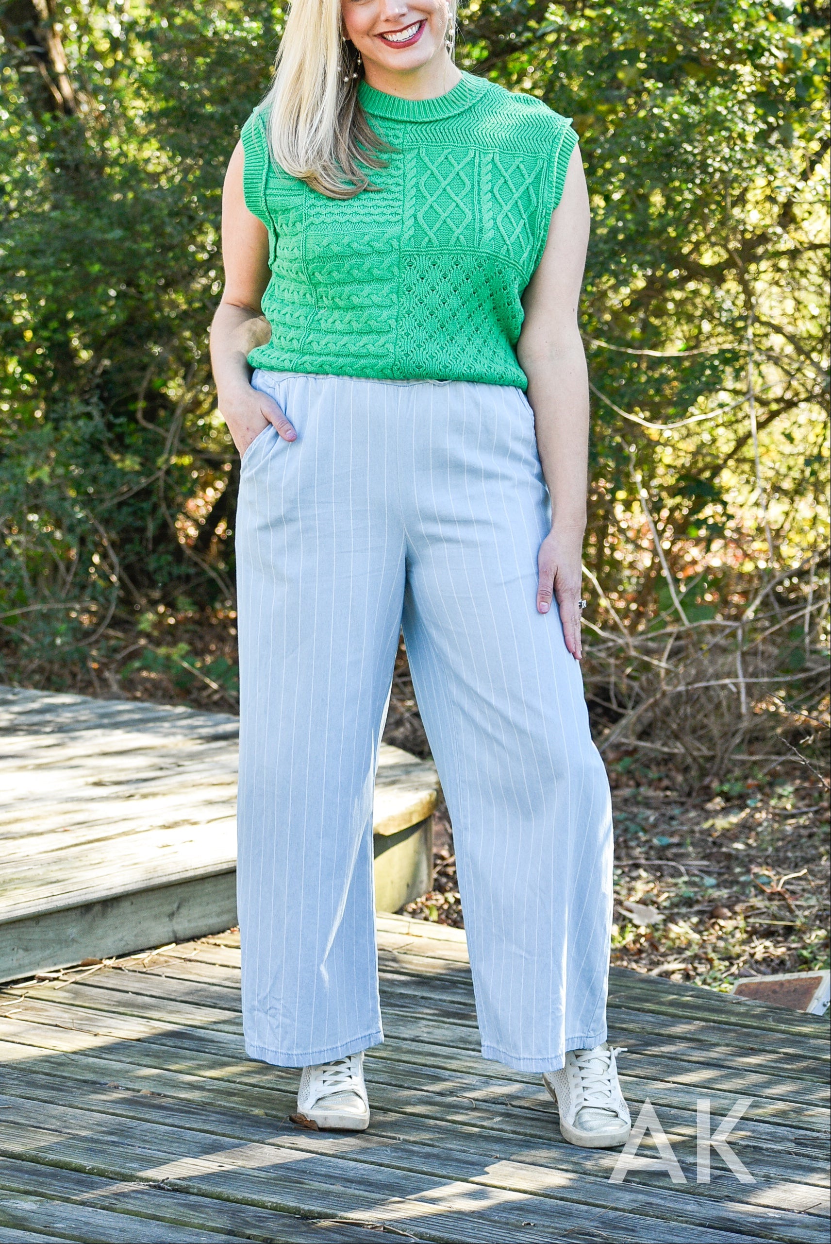 We love these easy going, wide leg trousers. The classic pinstripe design and tencel fabric paired with the elastic waist make these so easy to wear! If you're between sizes, we recommend sizing up.
