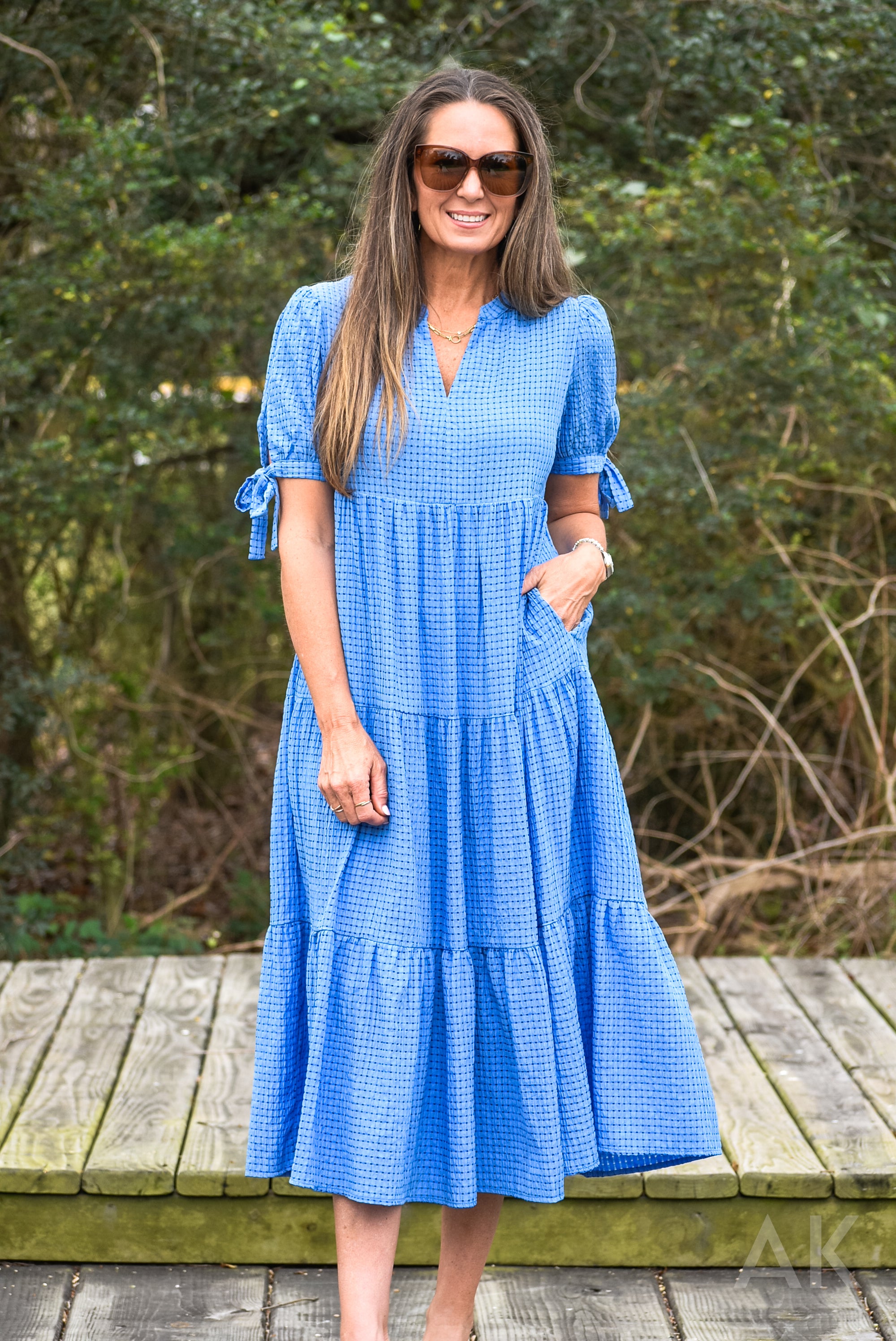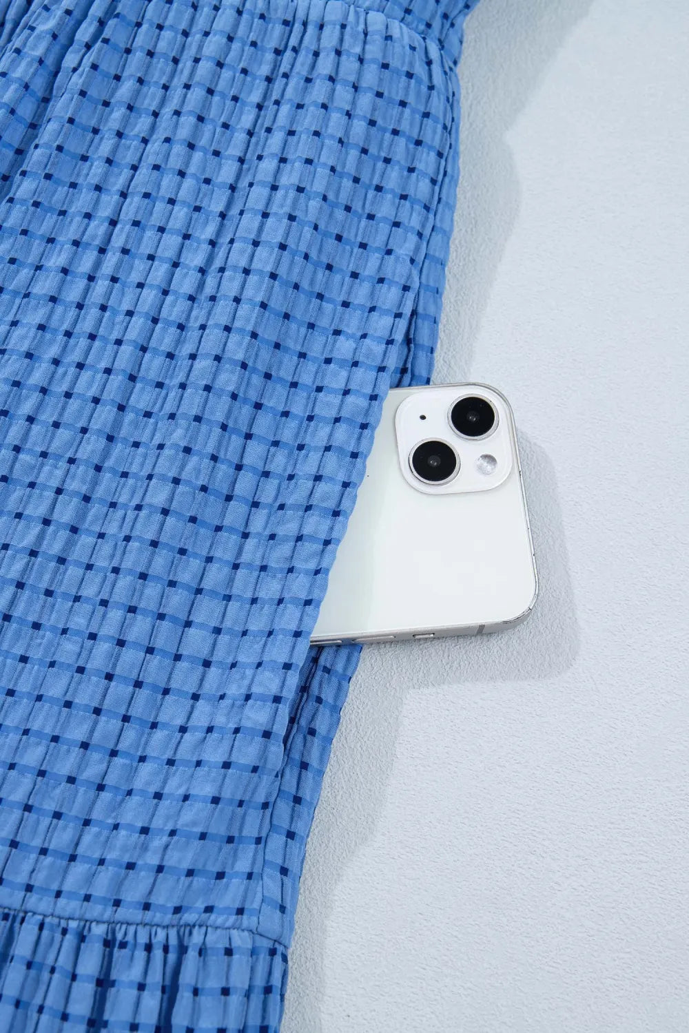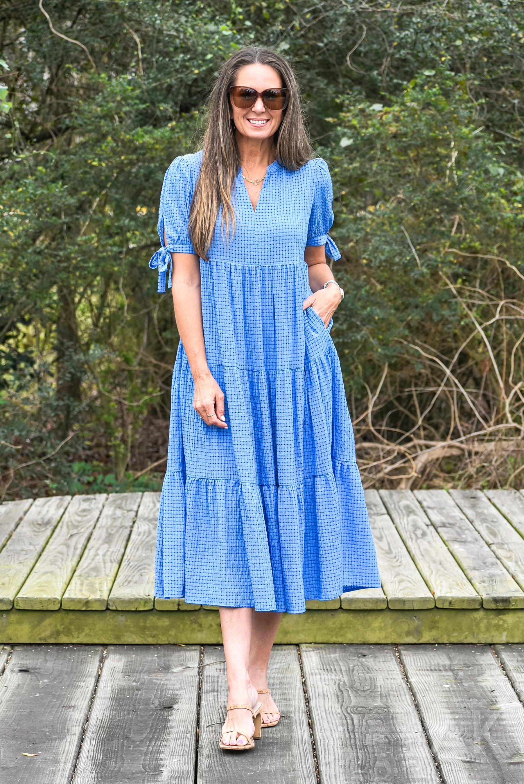 We love this blue gingham midi dress! It features a tiered skirt, flattering V-neckline, and short flutter sleeves for a sweet, feminine look. It includes side pockets and a relaxed flowy fit, making it perfect for everyday wear, brunch, travel, or casual summer outings. Pairs perfectly with sneakers, sandals, or wedges.