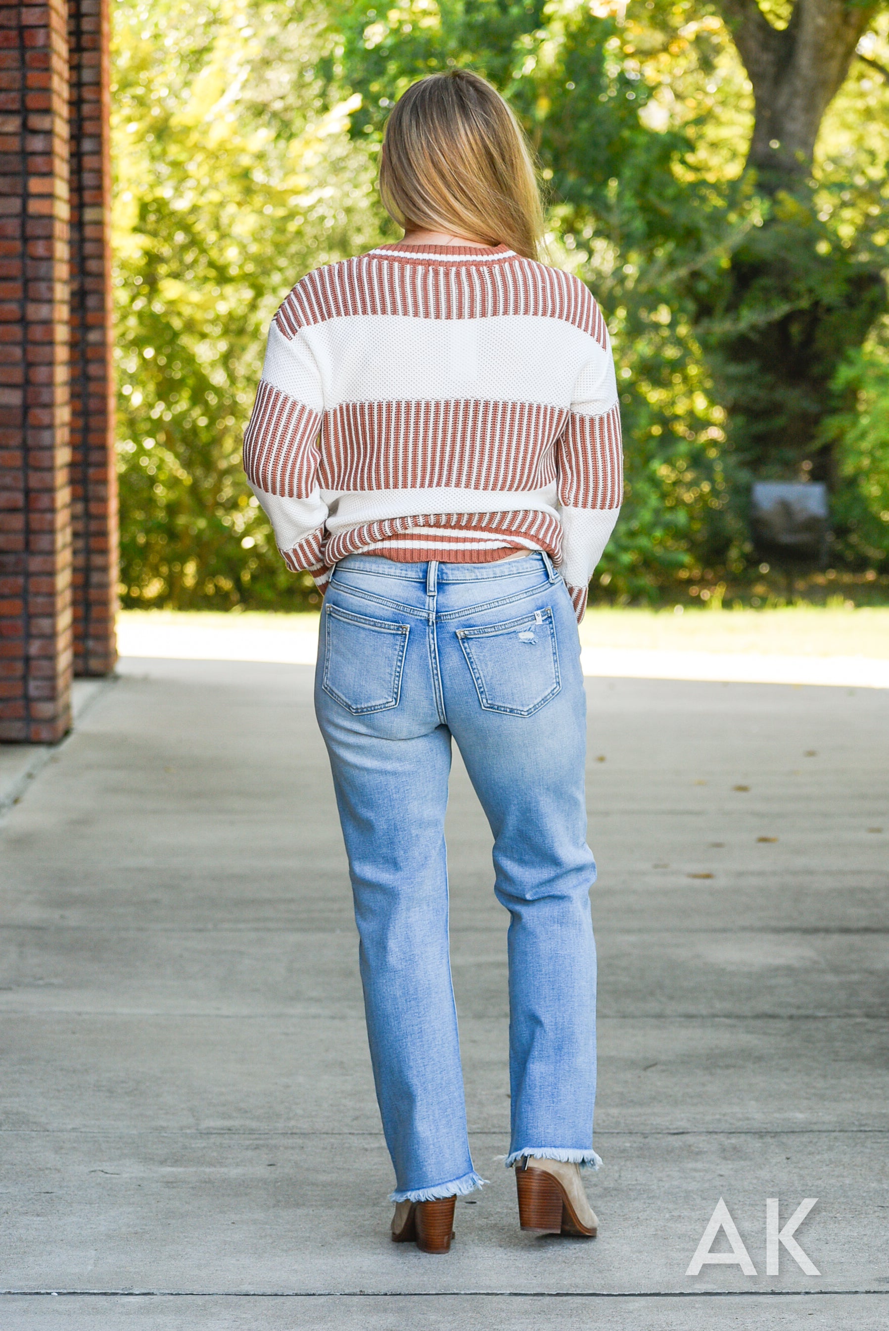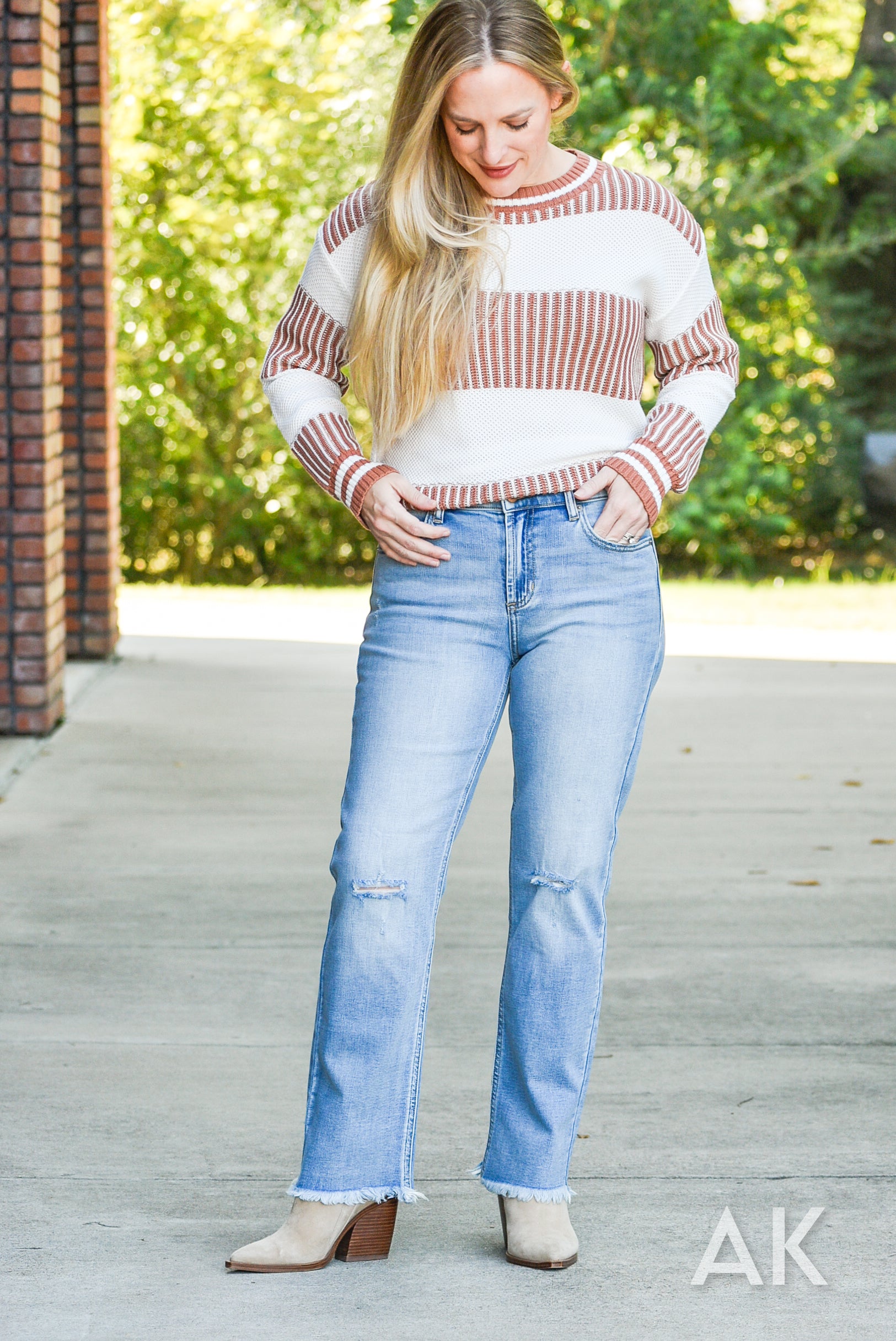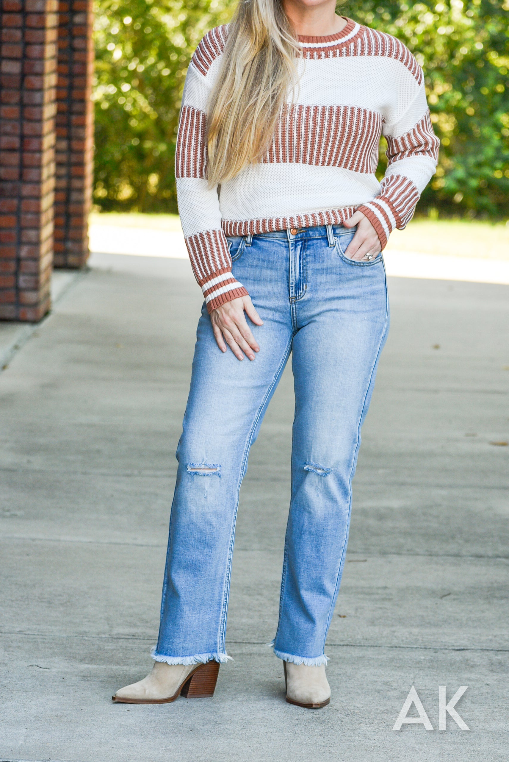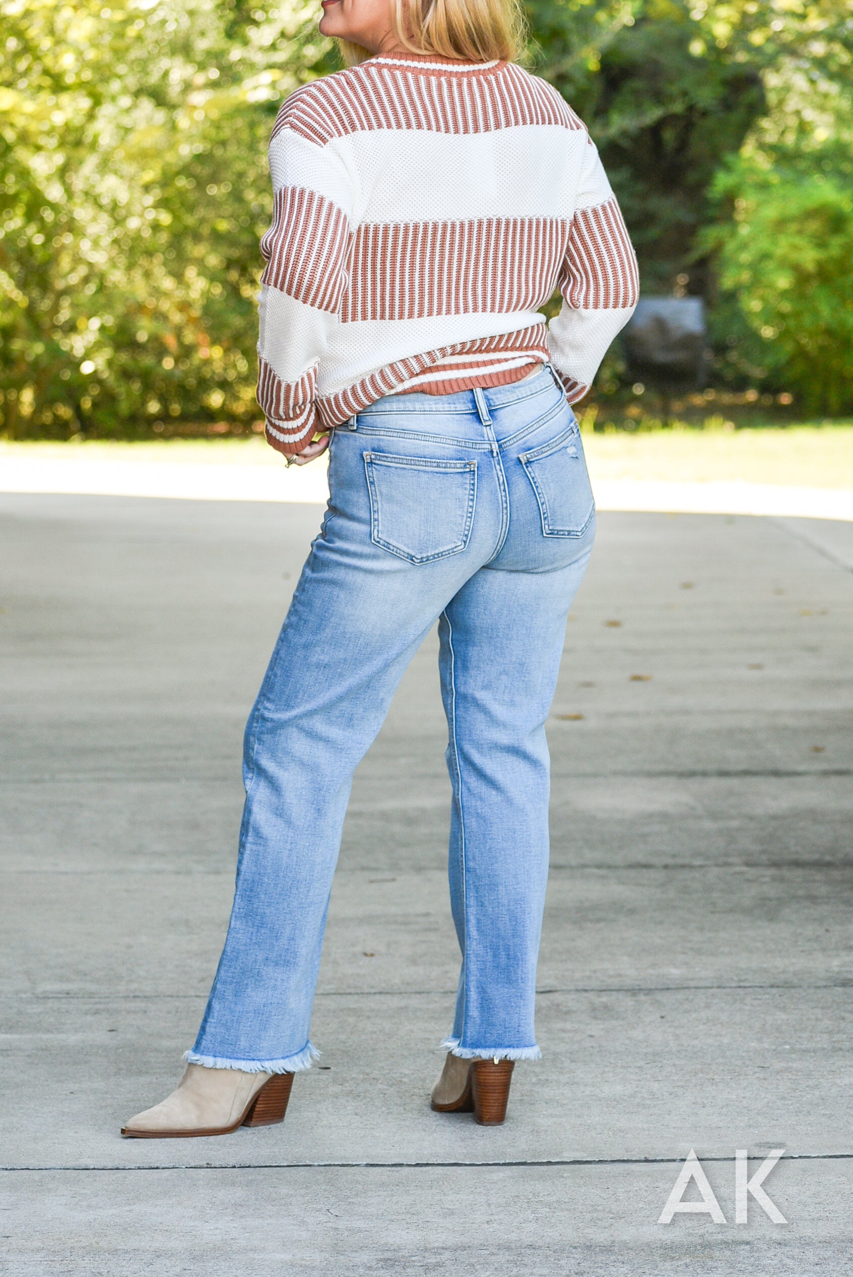 Make Kackie your go-to jeans! These cute light wash jeans feature a slim straight leg, distressing and a frayed hem. The mid rise and comfortable stretch give them a super flattering and comfortable fit. Take these jeans from season to season!