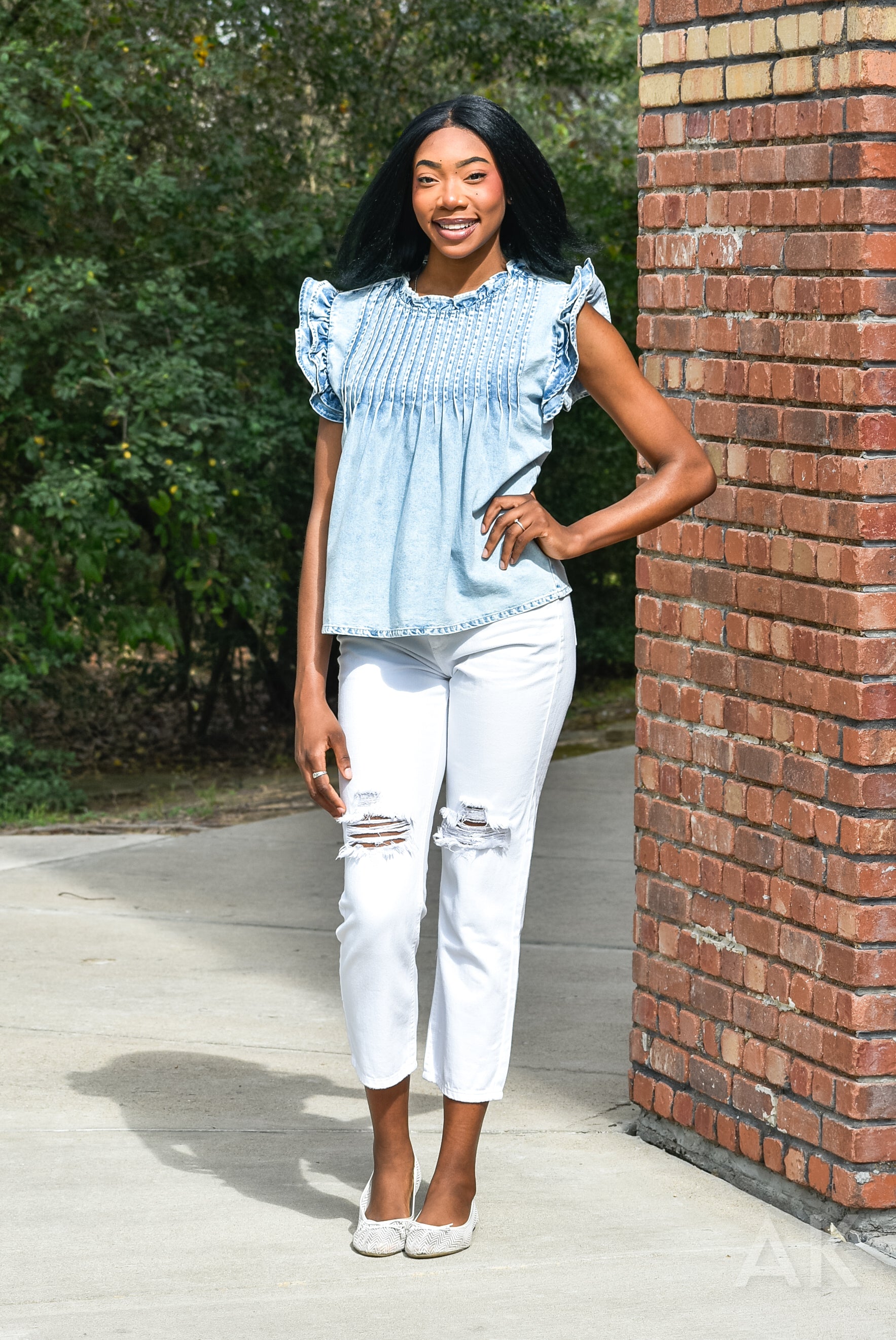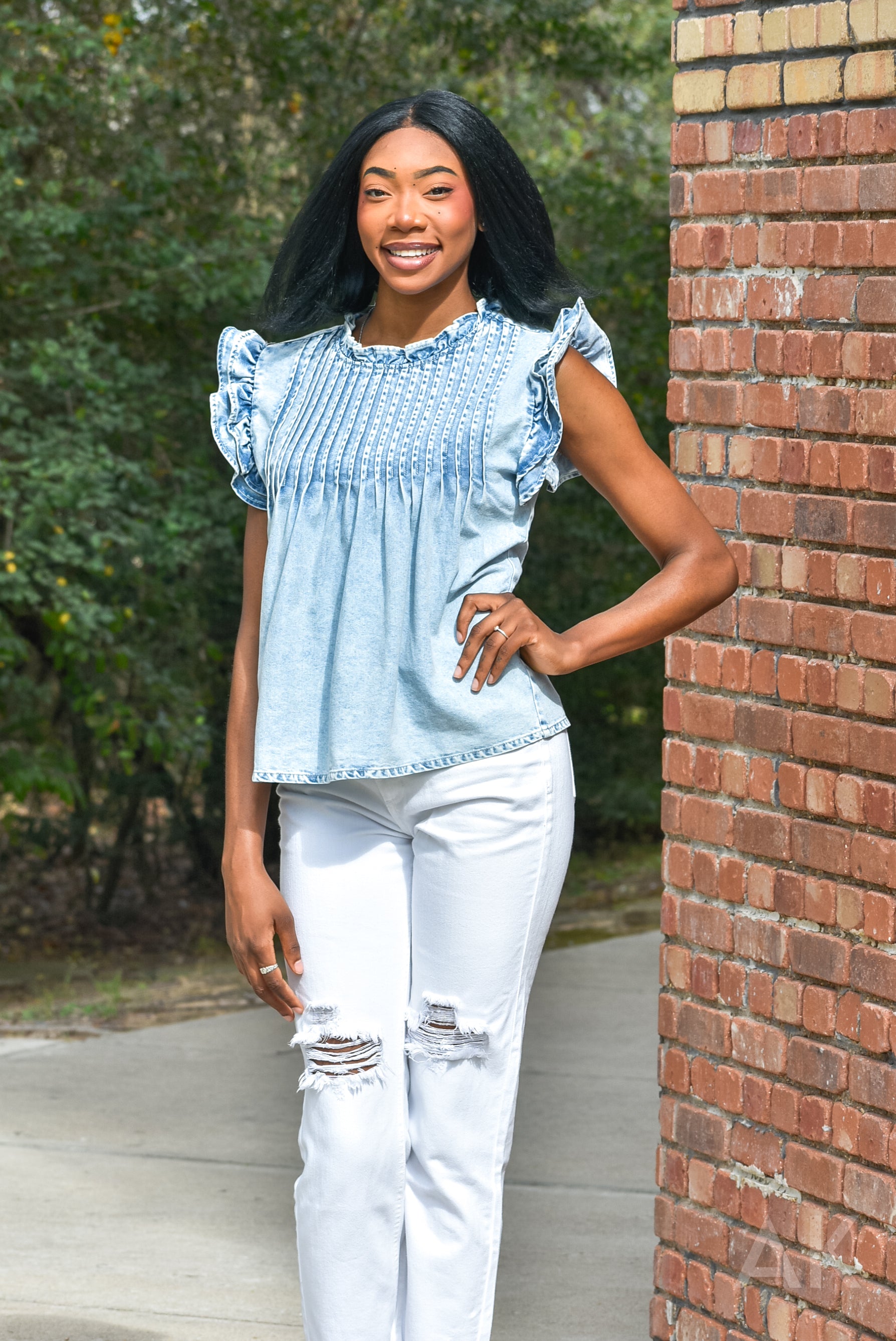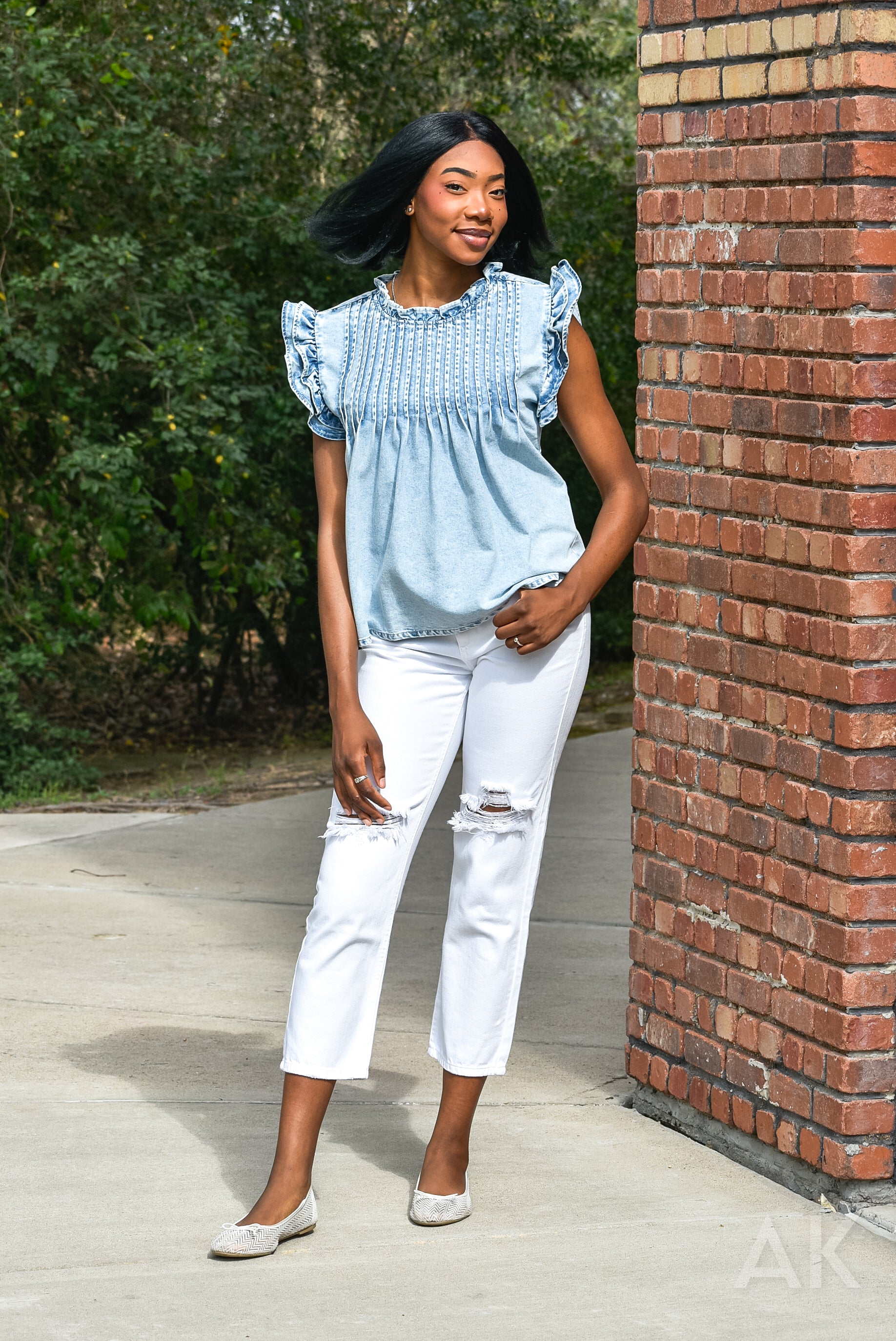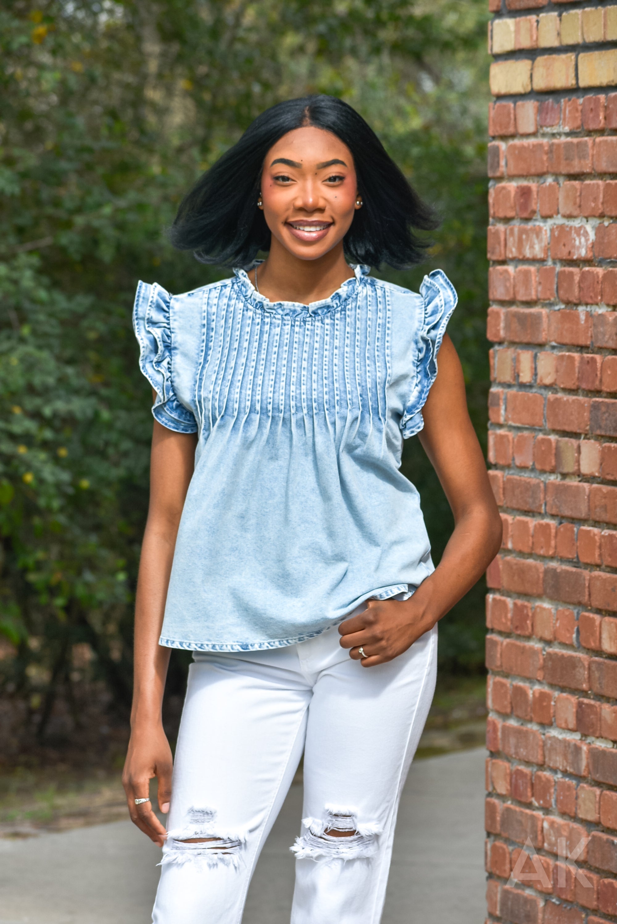 Denim tops are always a staff favorite! Margot is a light wash denim blouse featuring ruffle sleeves, a pleated front bodice, and a subtle ruffle neckline for a sweet, feminine look. This would look super cute with white or solid color bottoms!
