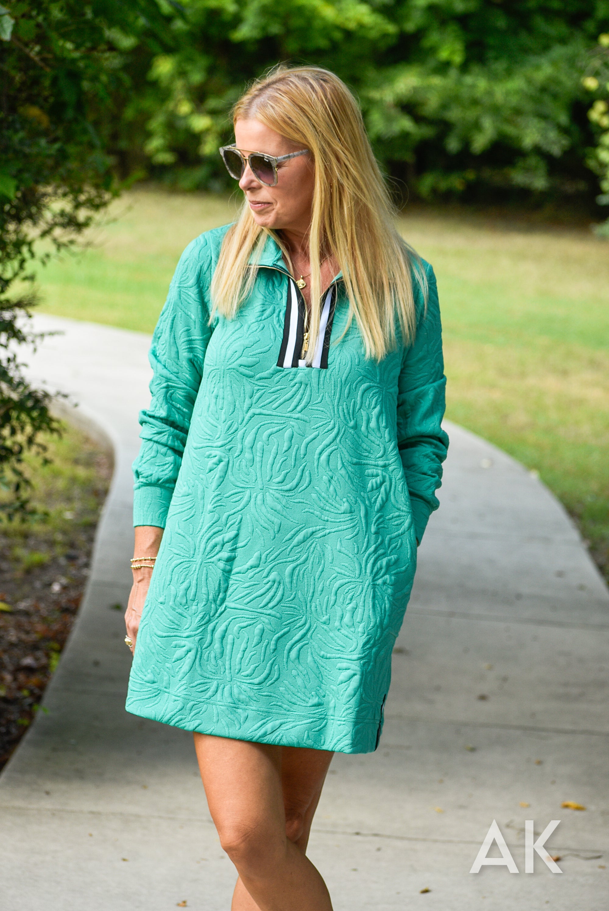 We have a huge crush on the Mila dress! We love the jacquard texture and the green color, along with the quarter zip and pockets. The black and white ribbon detail at the zipper neck and at the bottom make it truly unique! This looks great with boots or cute sneakers.