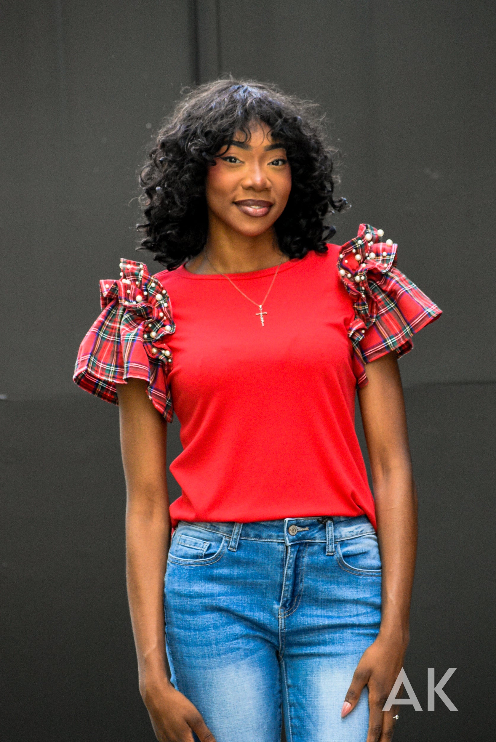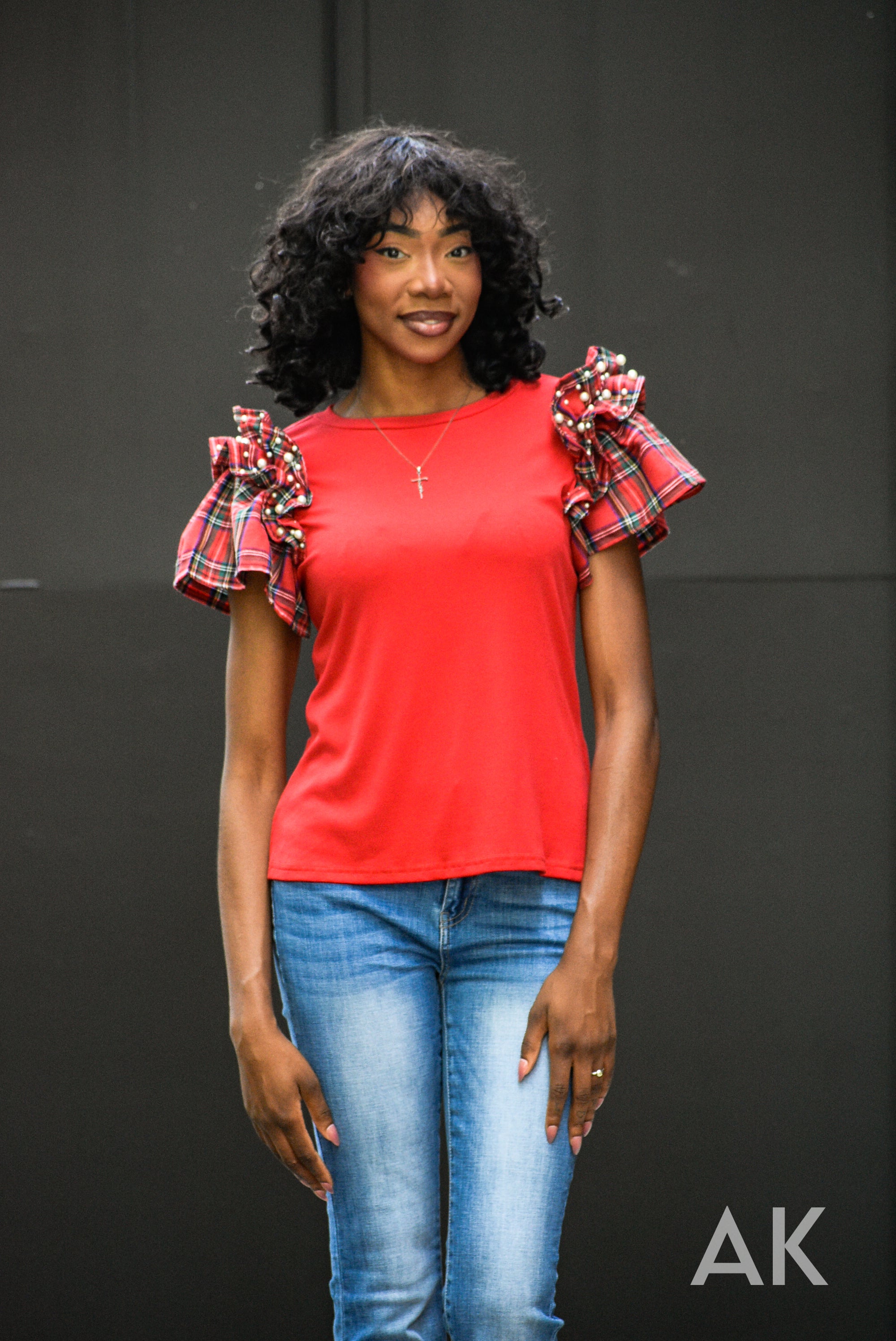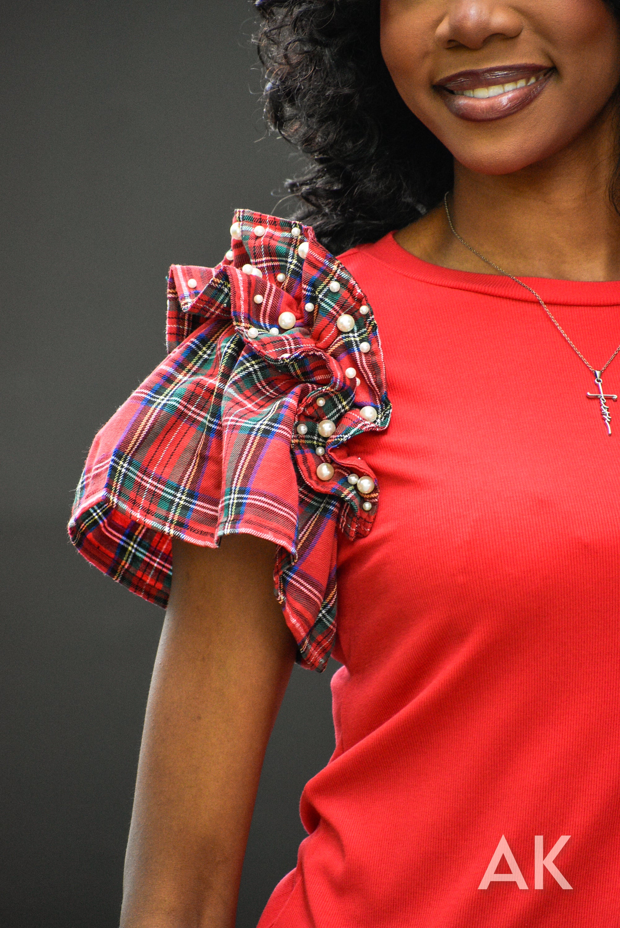 This top is absolutely perfect for your holiday get togethers! The bodice is a soft, stretchy red material and the sleeves are a beautiful Christmas plaid. The pearl details on the ruffle sleeves make this a holiday top you just can't pass up!
