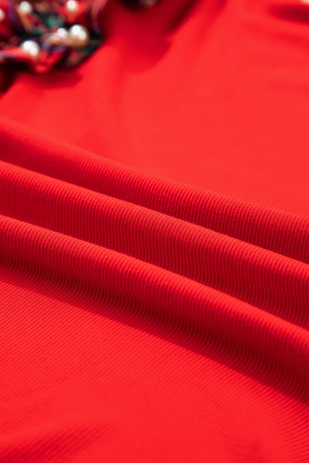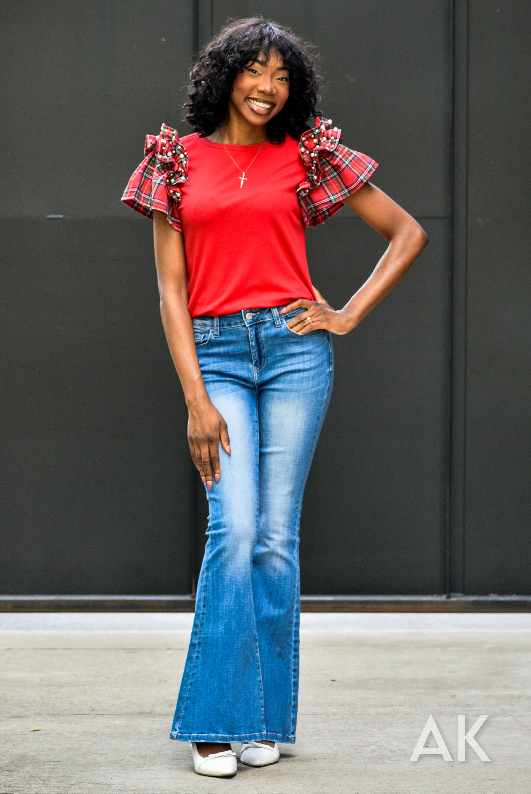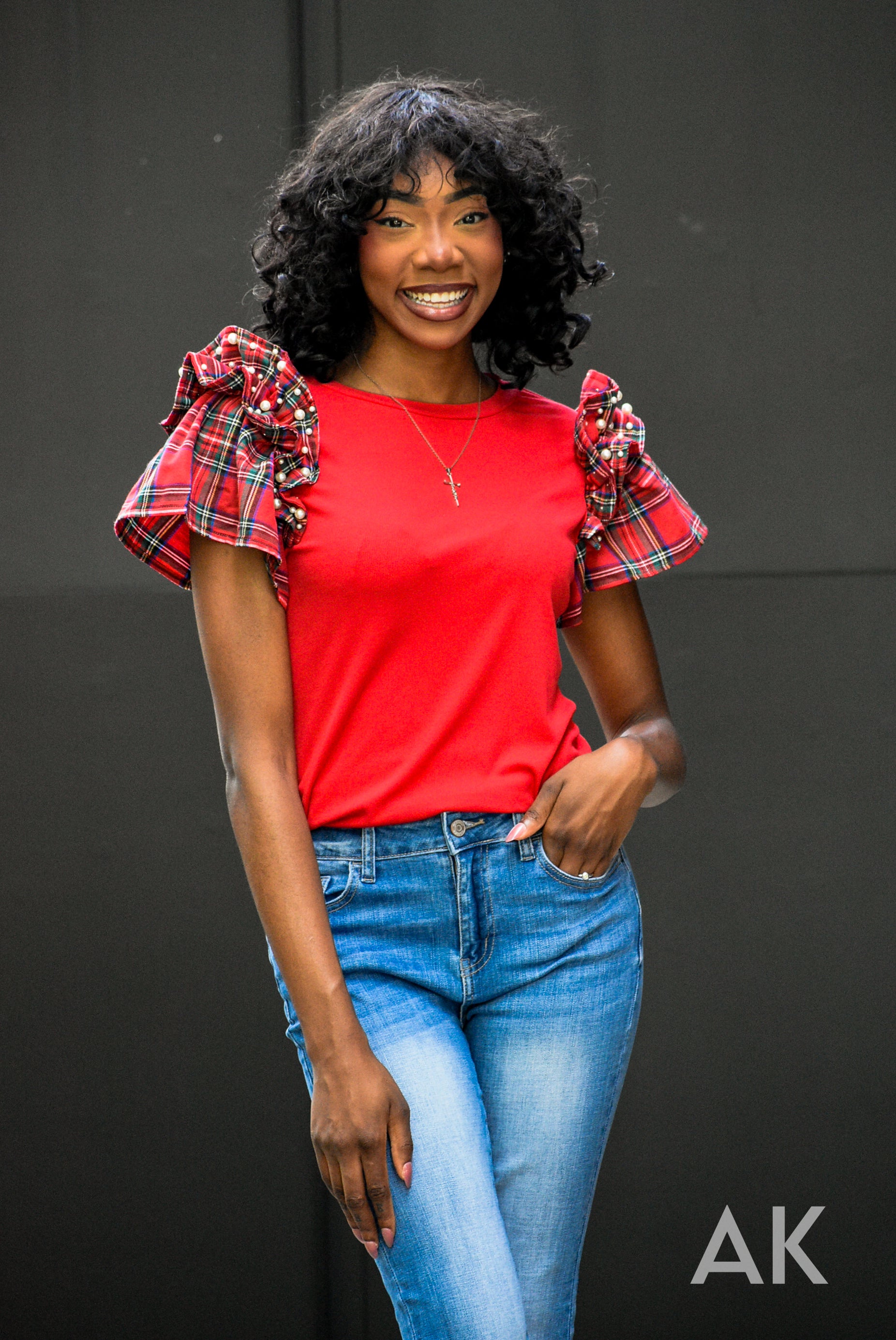 This top is absolutely perfect for your holiday get togethers! The bodice is a soft, stretchy red material and the sleeves are a beautiful Christmas plaid. The pearl details on the ruffle sleeves make this a holiday top you just can't pass up!