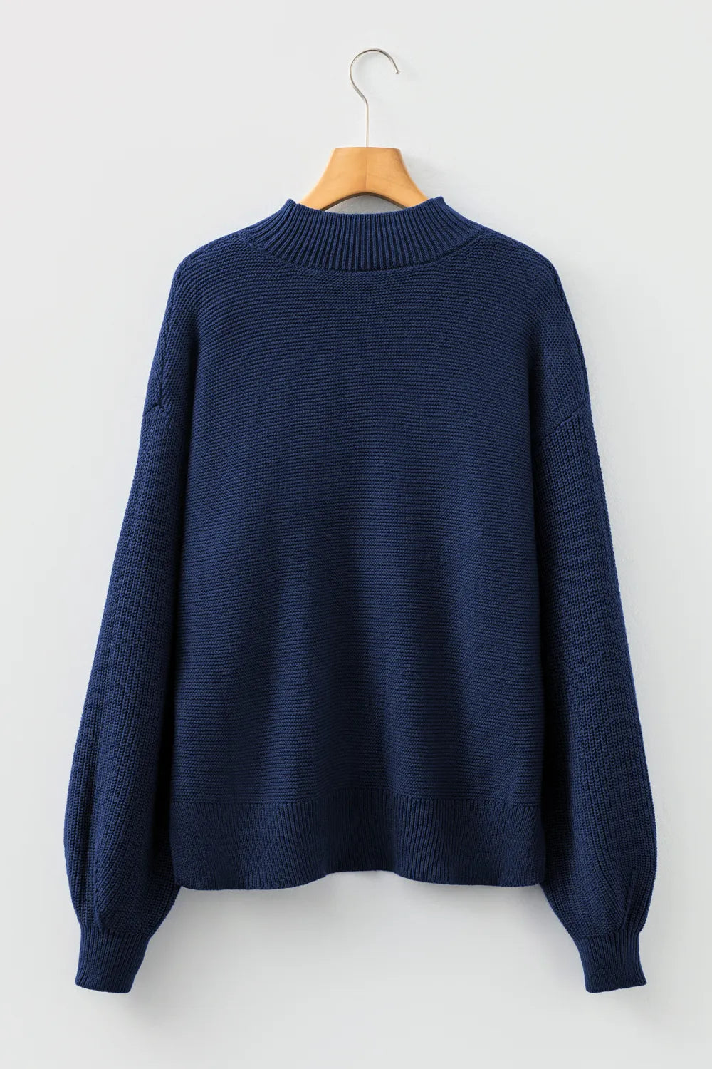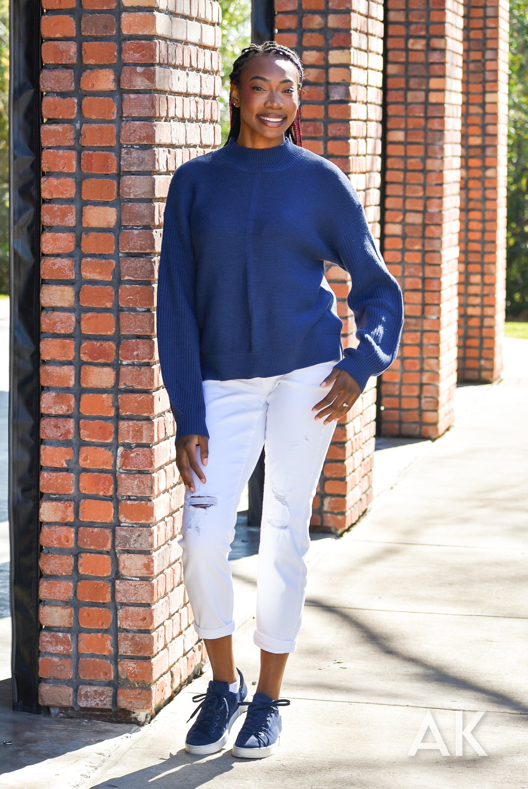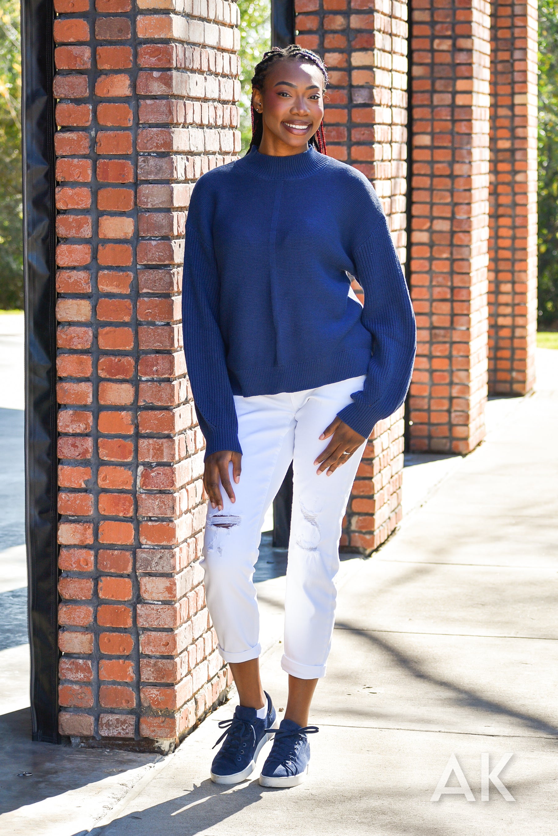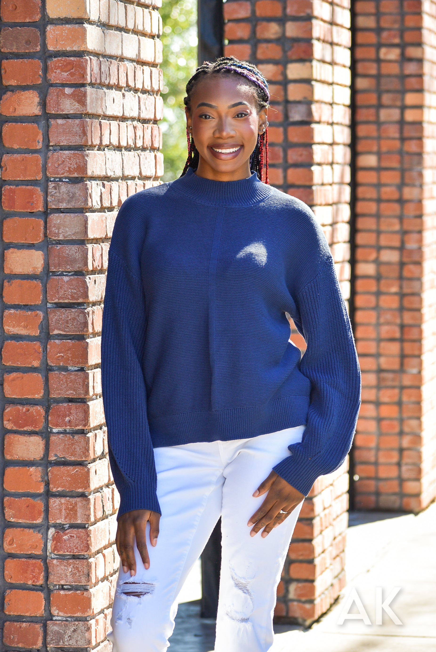 The navy Nova sweater is one of our favorites! It's super soft and comfy and has a beautiful relaxed fit. We love the contrasting knit patterns and the bubble sleeves! It's a gorgeous, high quality top.