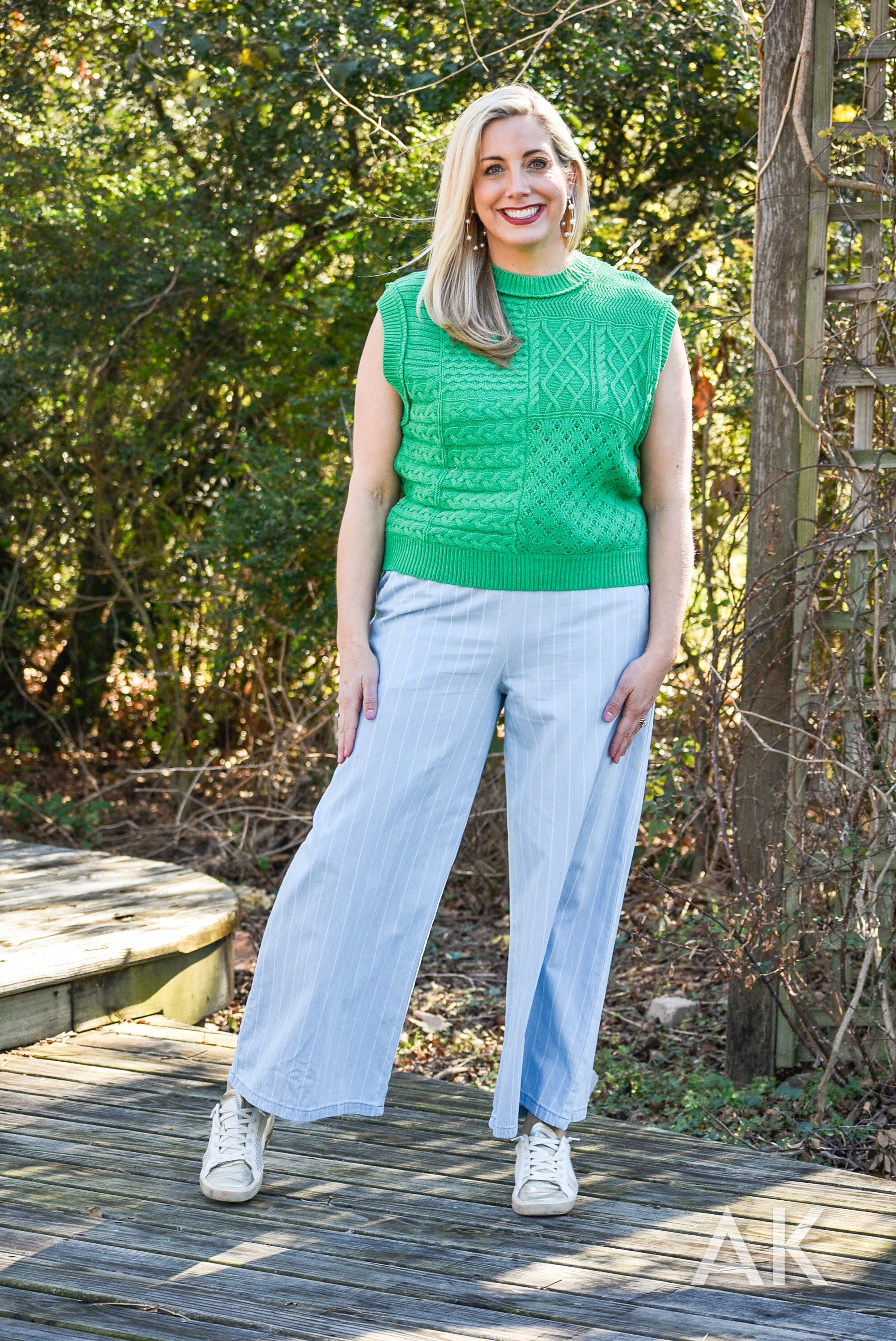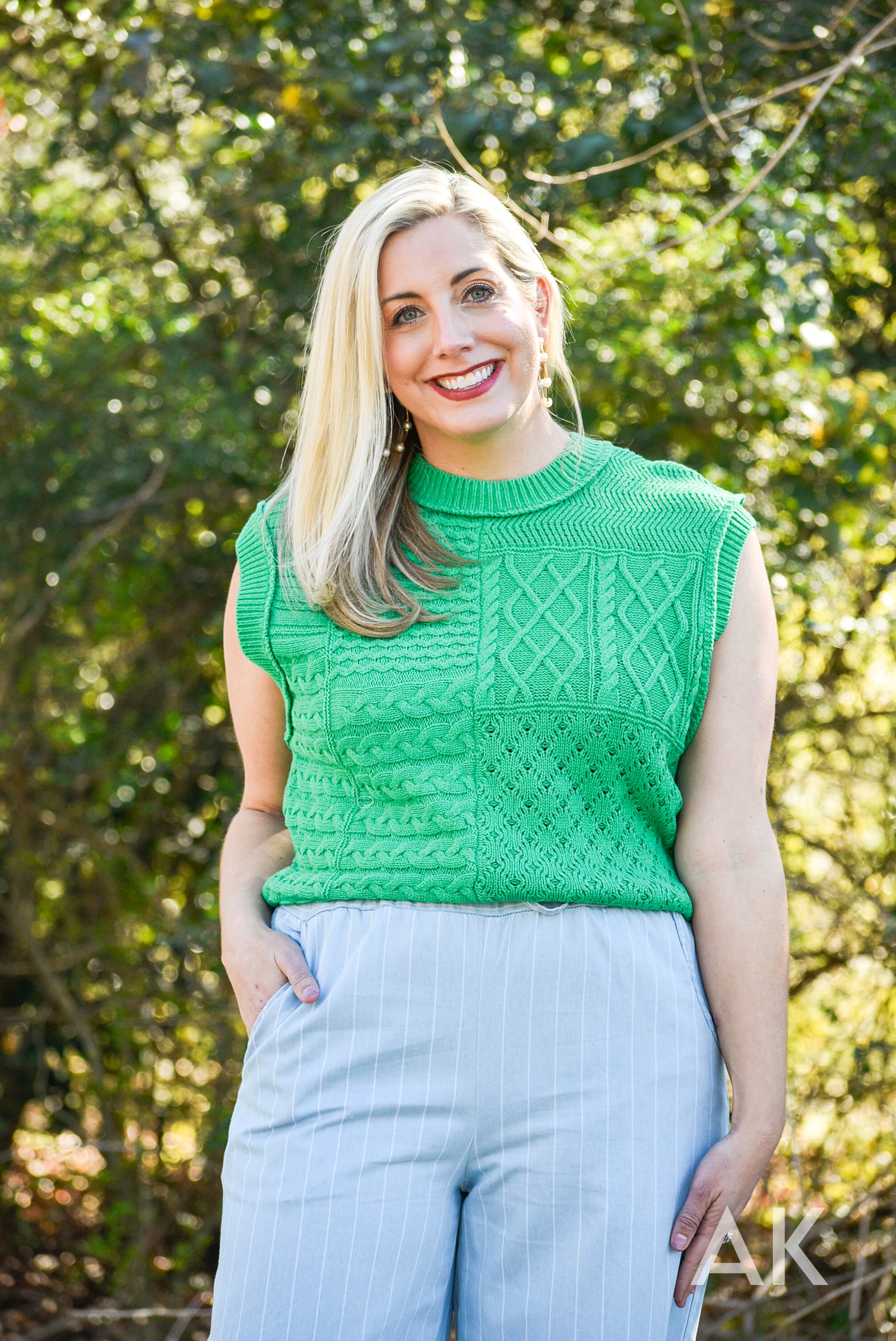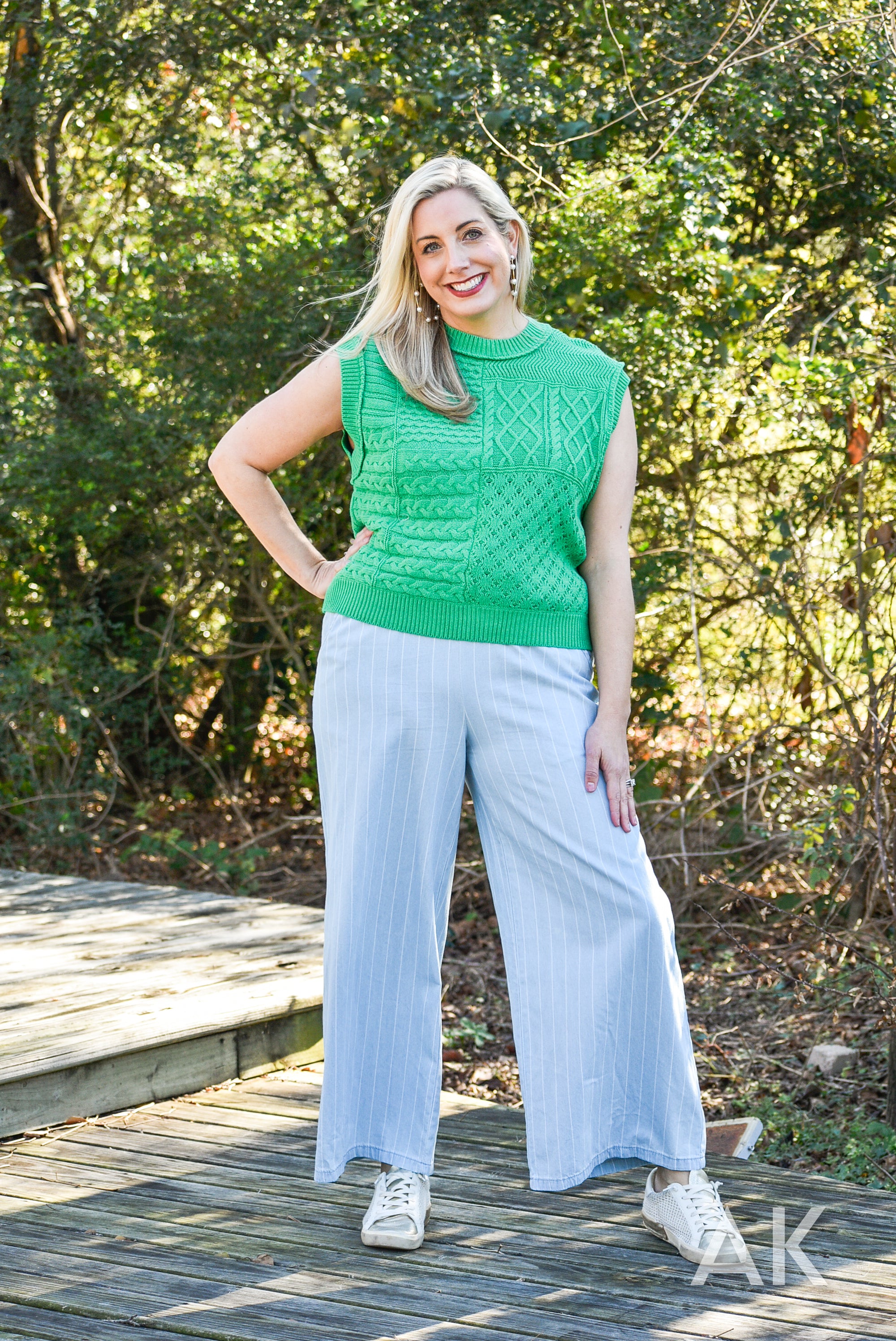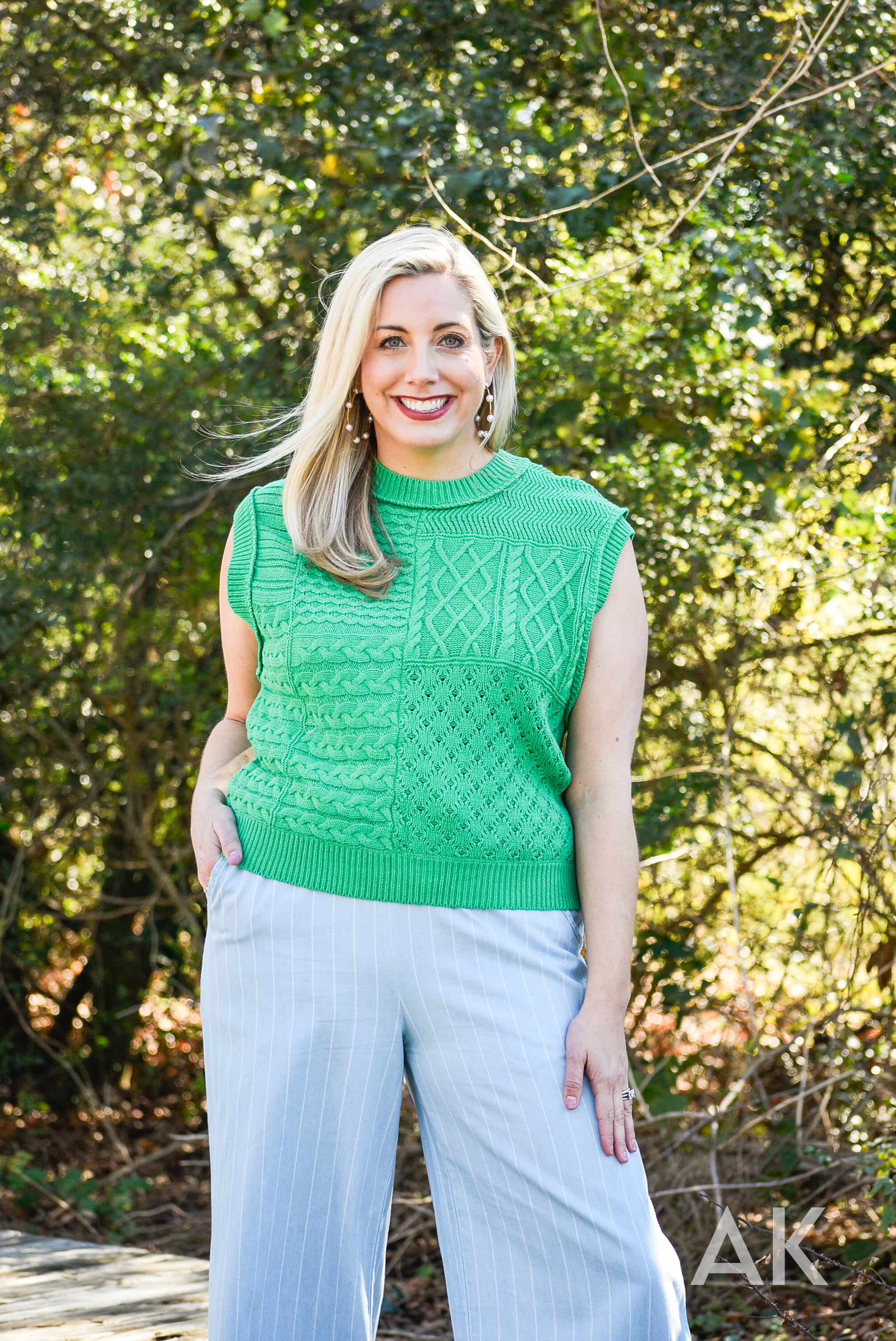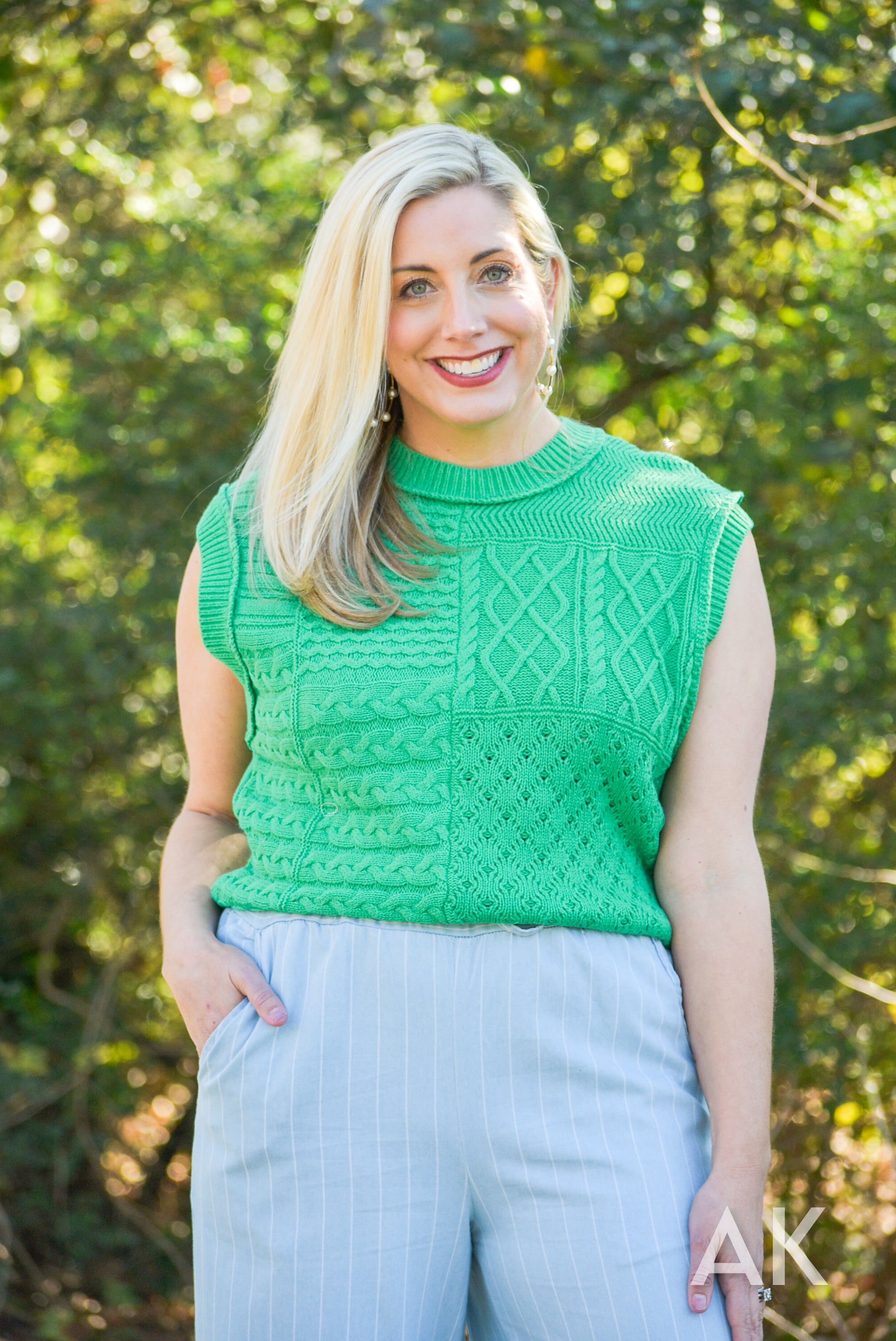 We love a good sleeveless sweater! This kelly green color is perfect for heading into warmer weather and we love the patchwork, contrasting knit patterns. Dolman armholes make this super easy to wear. This top pairs perfectly with our Demetria pants!
