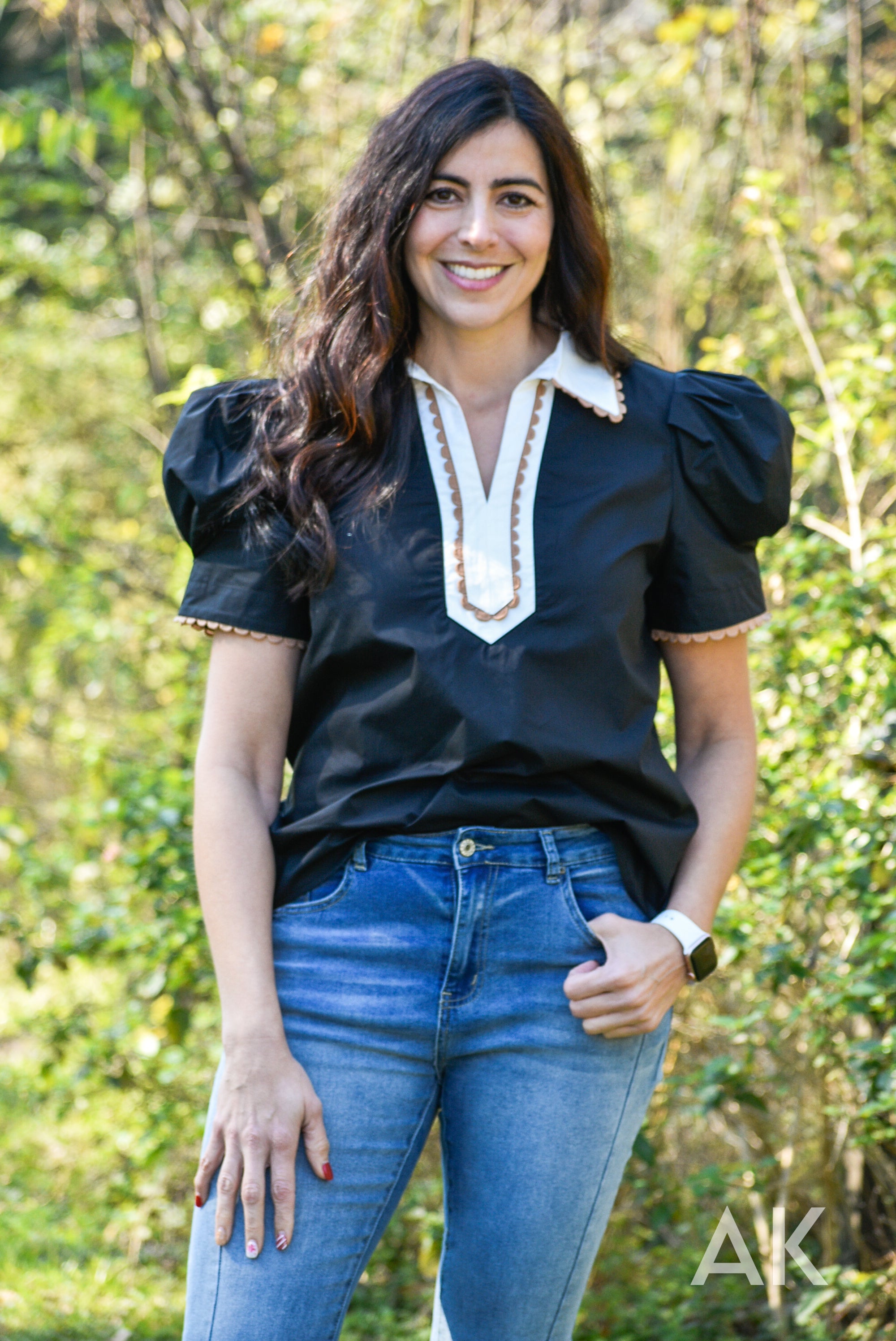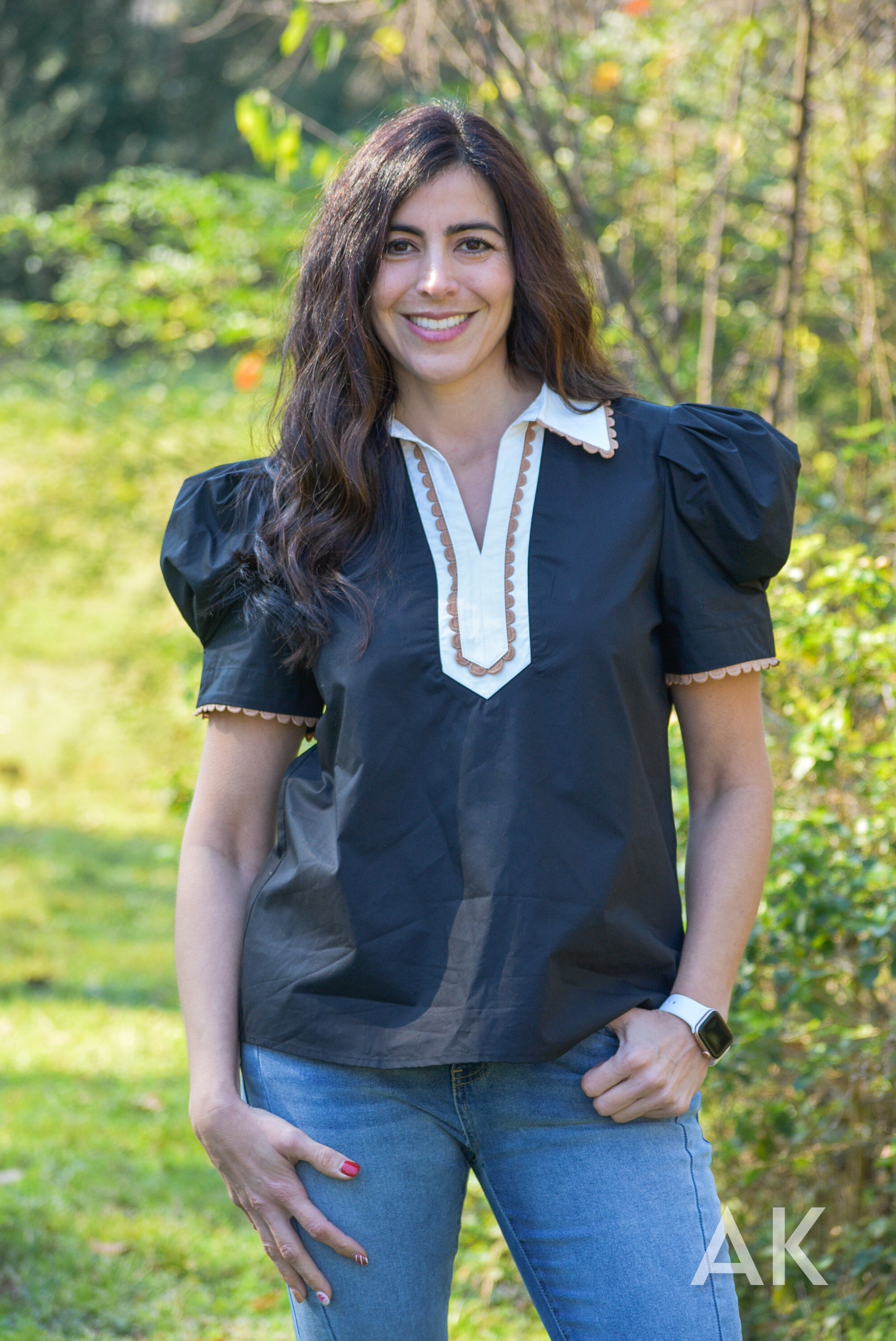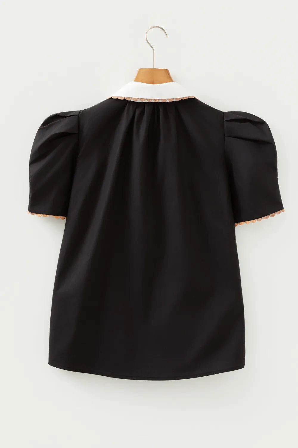 This black top features statement puff sleeves and a white contrasting neckline with tan ric rac trim detailing. The tailored details of Rubie elevate the look and it pairs perfectly with jeans or a skirt. The fabric is absolutely gorgeous and it feels very high end.