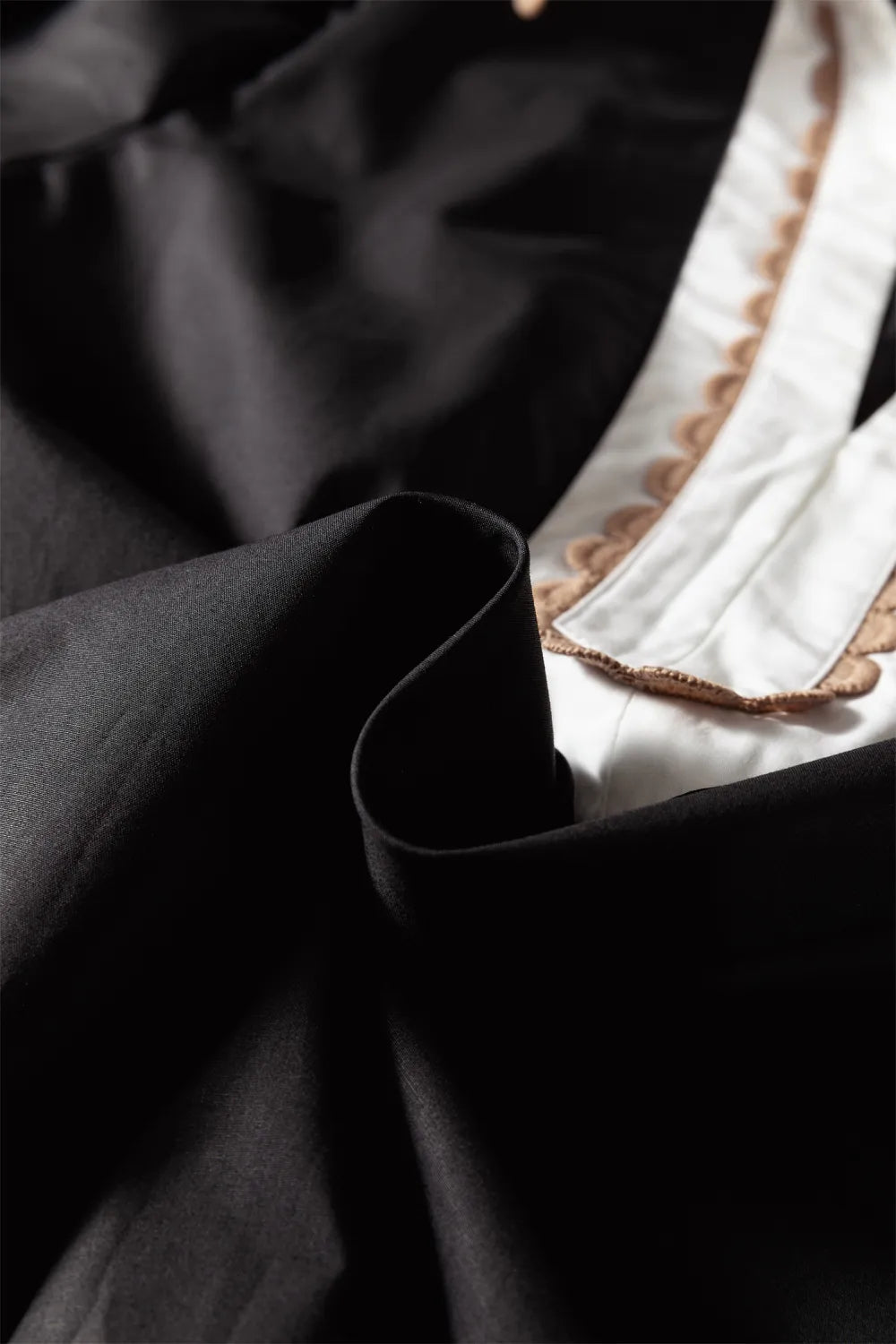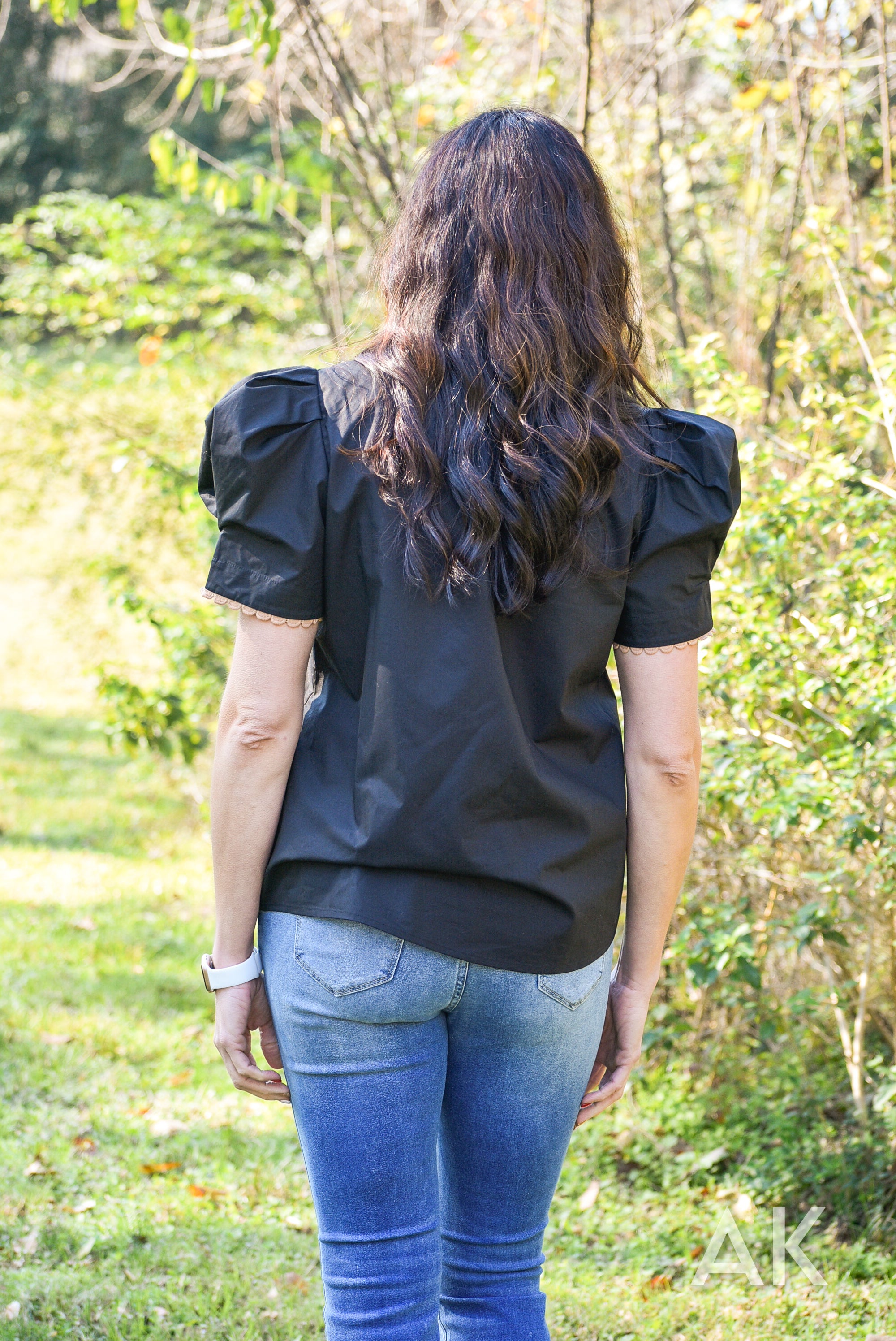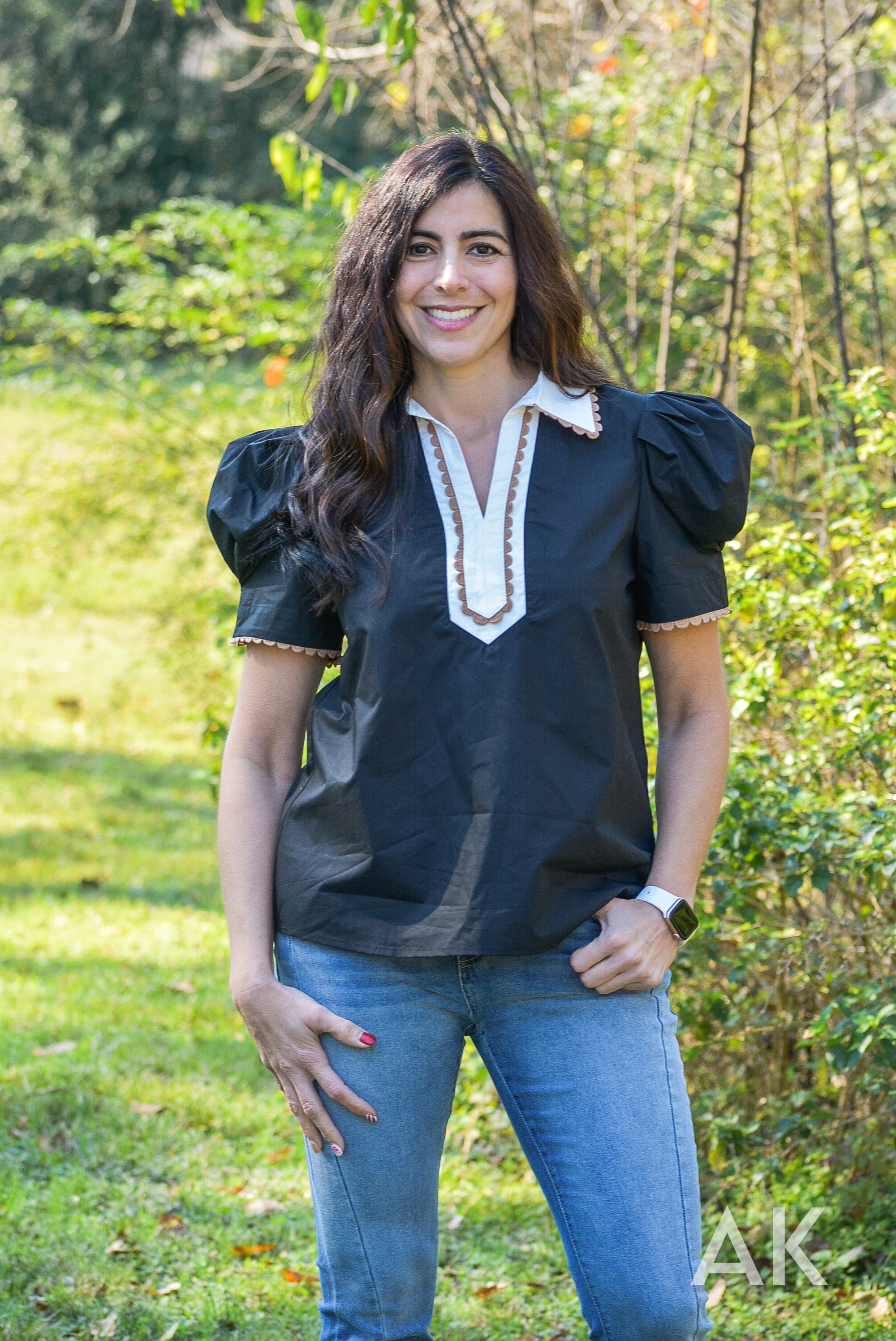 This black top features statement puff sleeves and a white contrasting neckline with tan ric rac trim detailing. The tailored details of Rubie elevate the look and it pairs perfectly with jeans or a skirt. The fabric is absolutely gorgeous and it feels very high end.