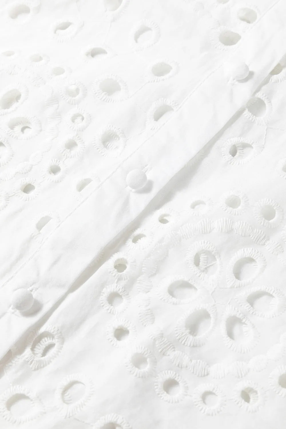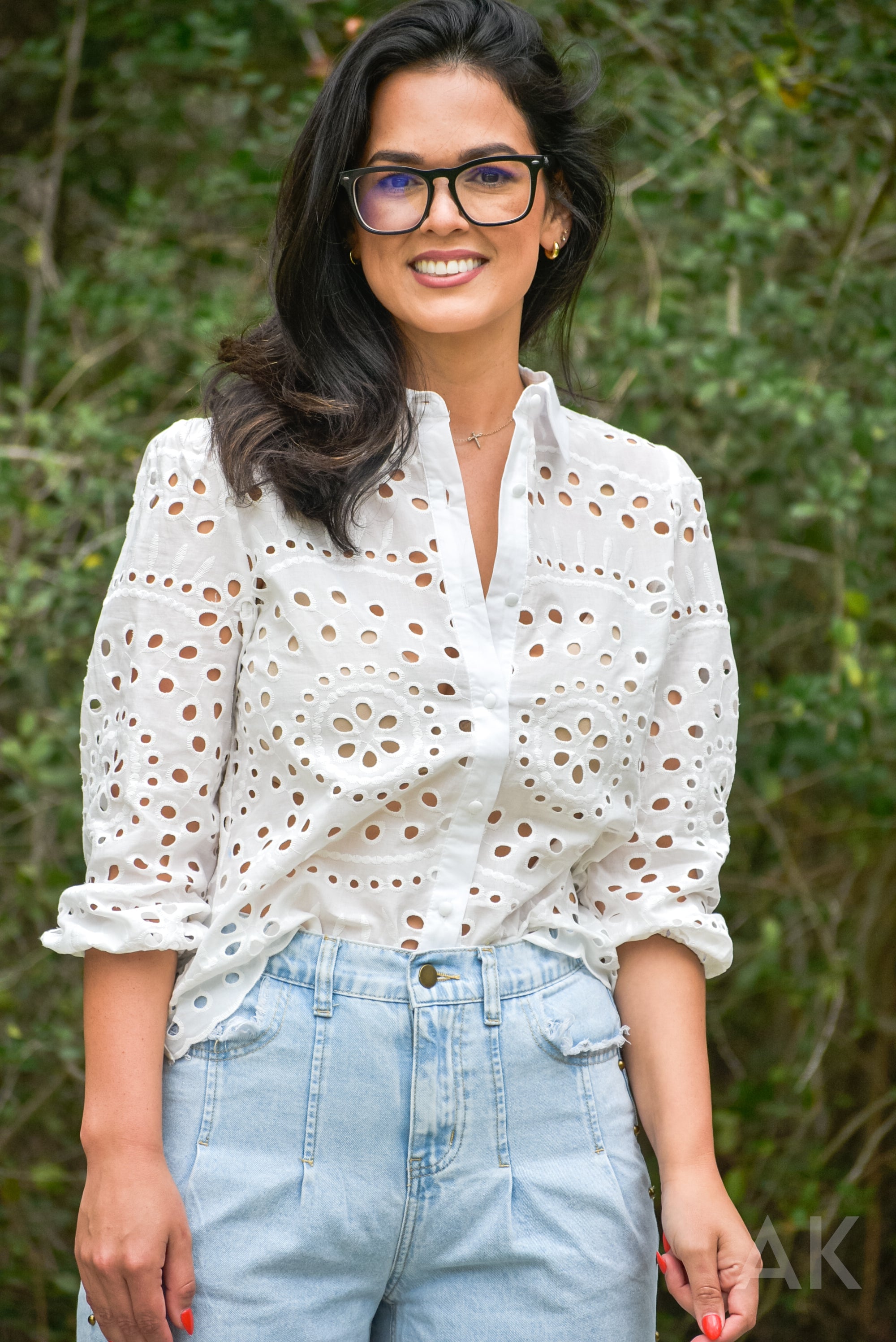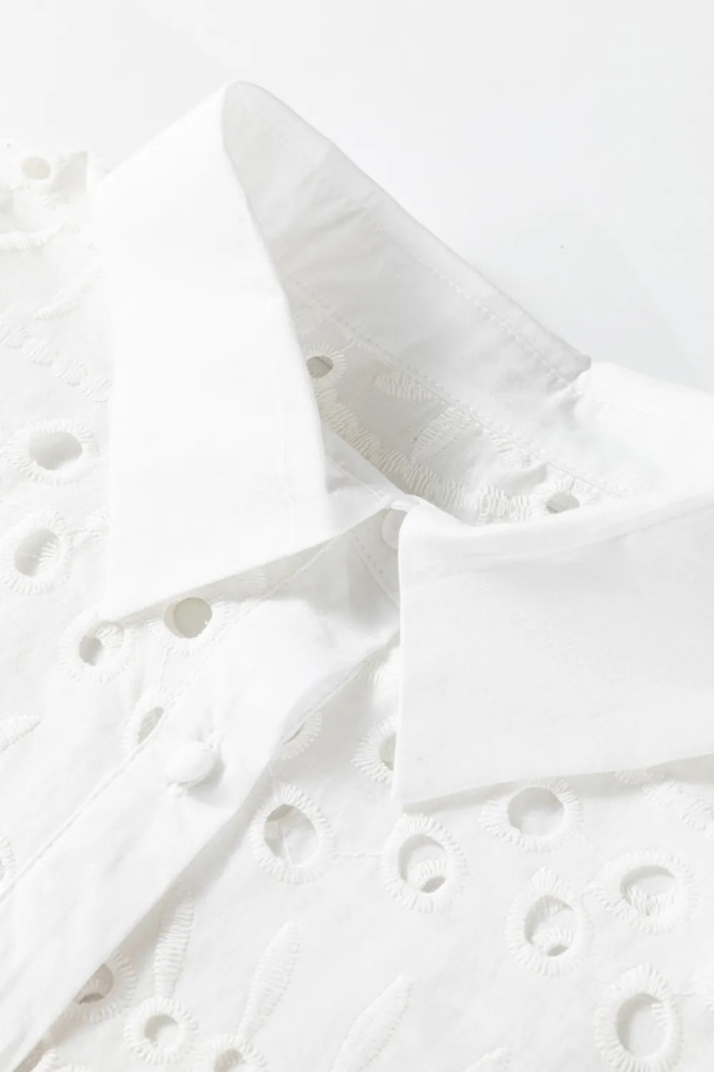 Every closet needs a classic white blouse! Sybil is a white eyelet button-front blouse featuring a collared neckline, delicate eyelet embroidery, and scalloped detailing for a timeless, feminine look. Looks great with denim, trousers, or skirts for an easy polished outfit.