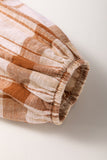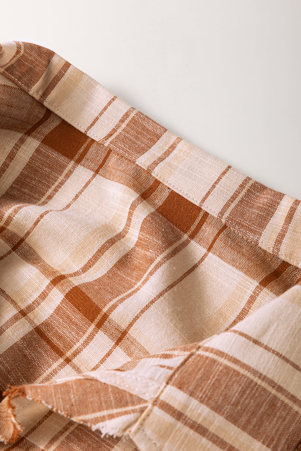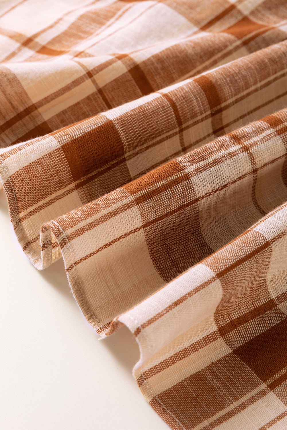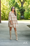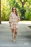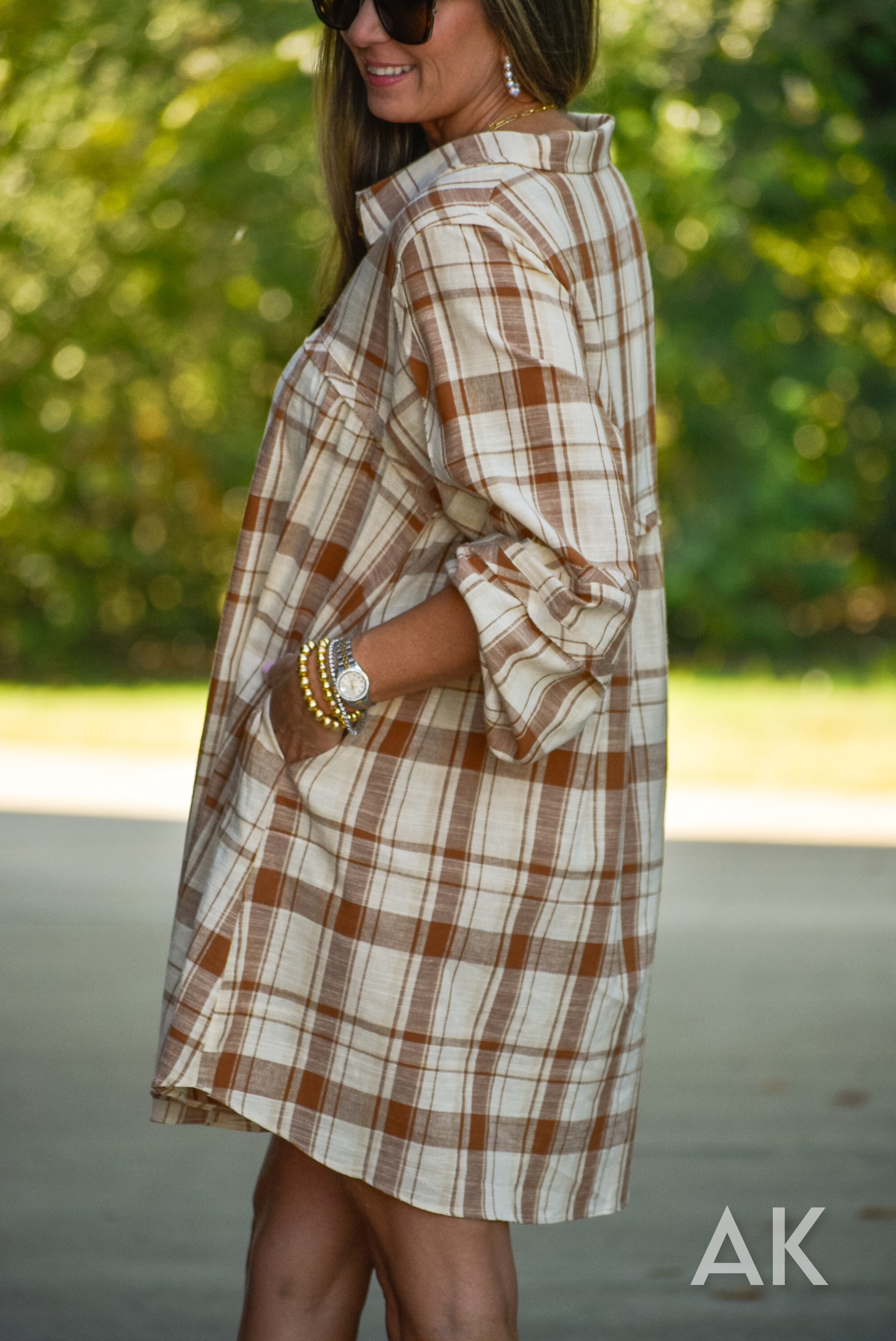We have a major crush on the Trista dress! We love the caramel and cream plaid and the roomy, easy fit. It features a v neck with a lay flat collar and a raw hem empire waist with fun details on the sleeves.