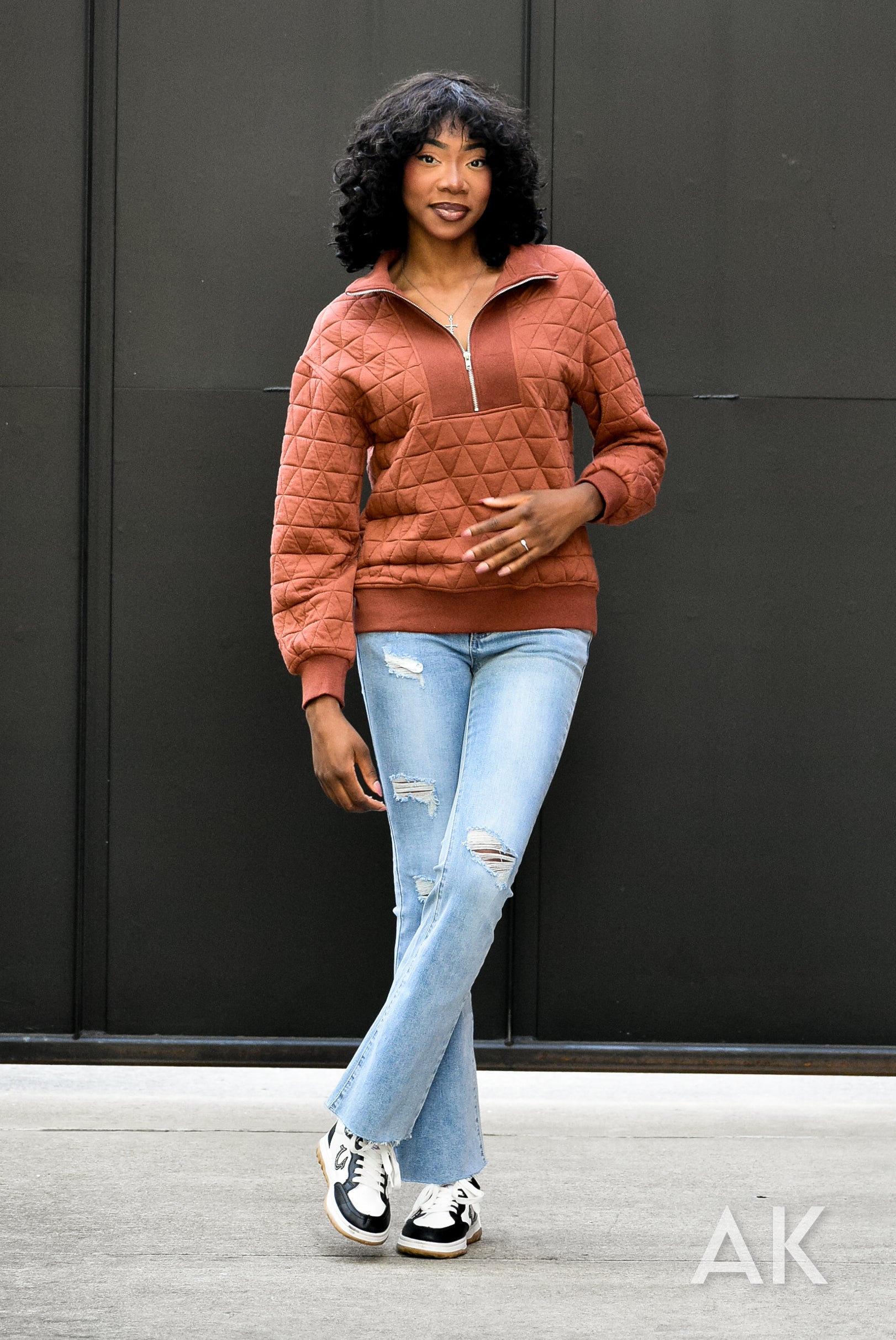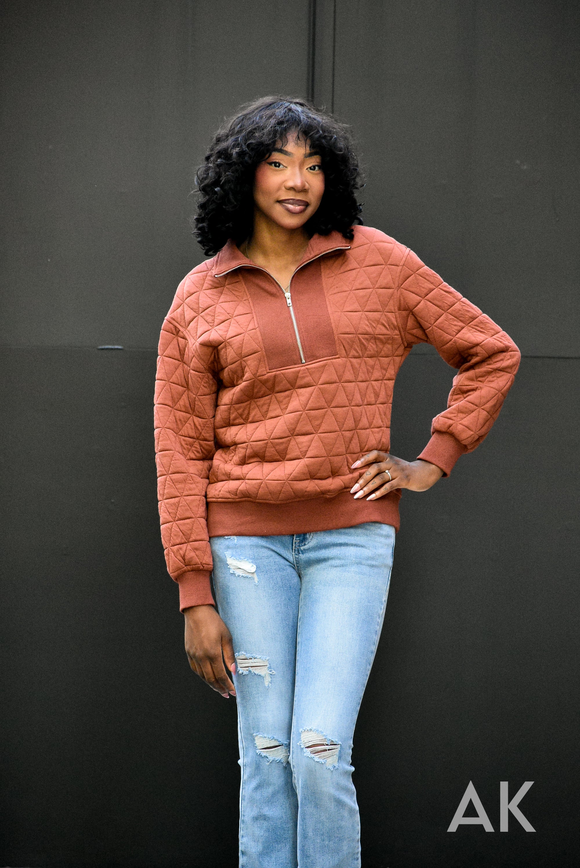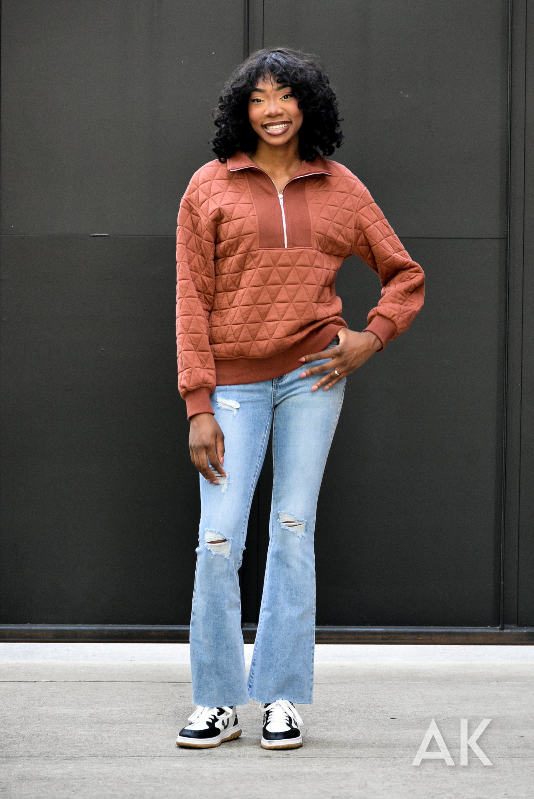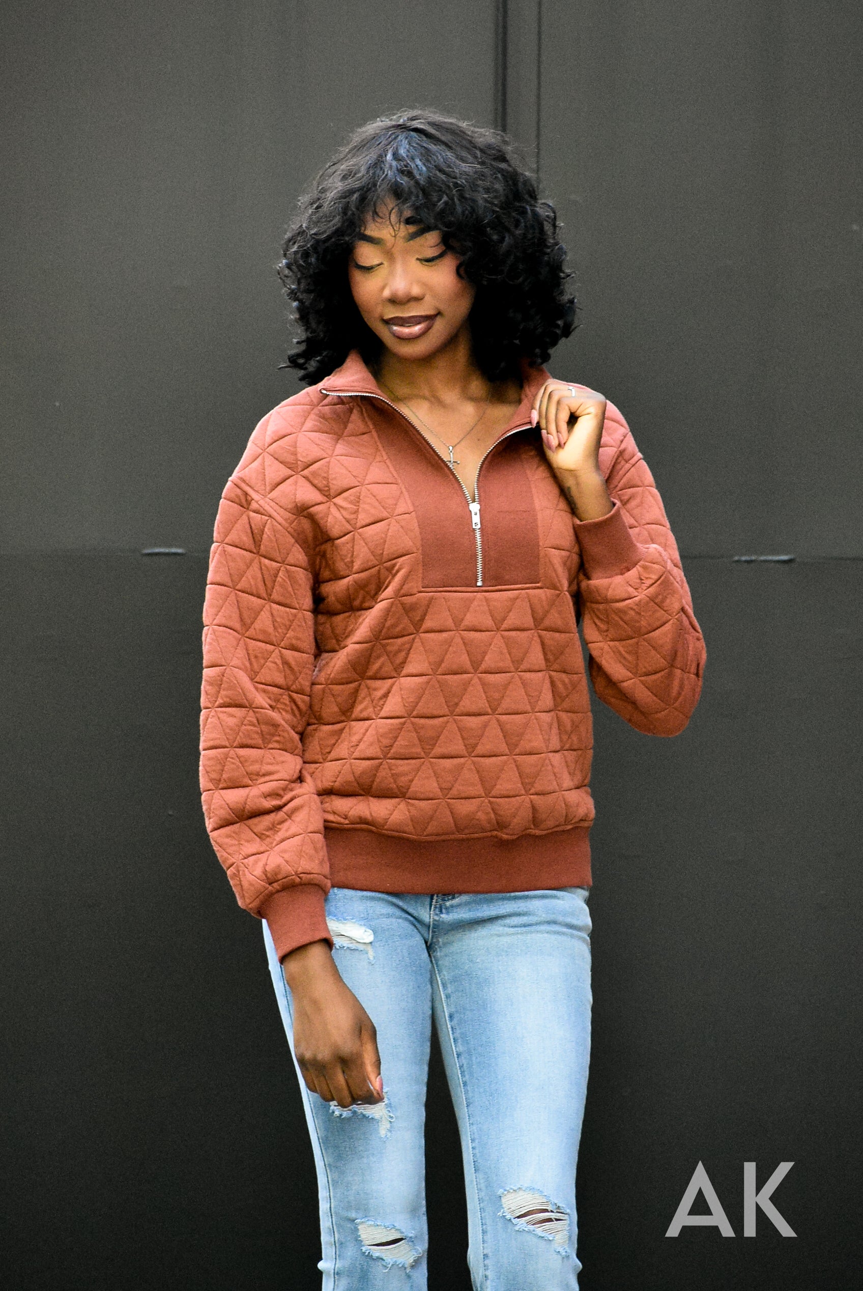 We love a good half zip pullover! This is a gorgeous caramel color and has a unique geometric quilted design. Violet is great worn alone or layered for a chic, put together fall look.