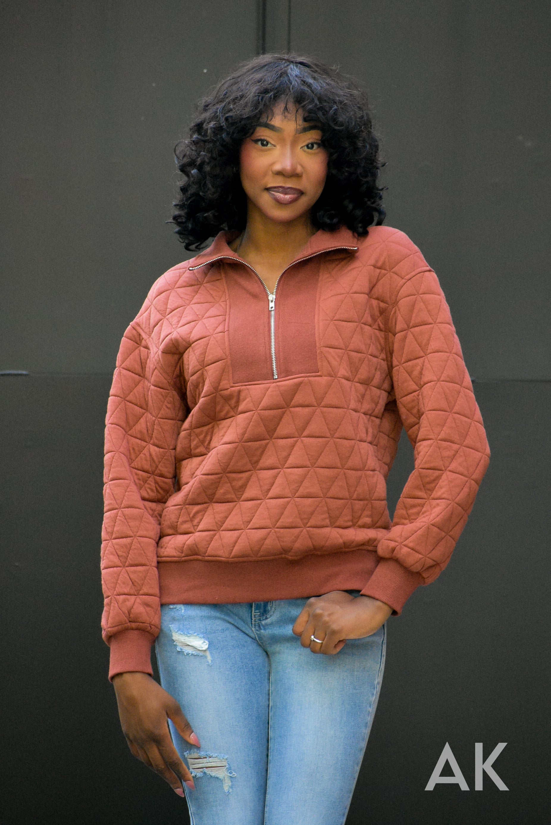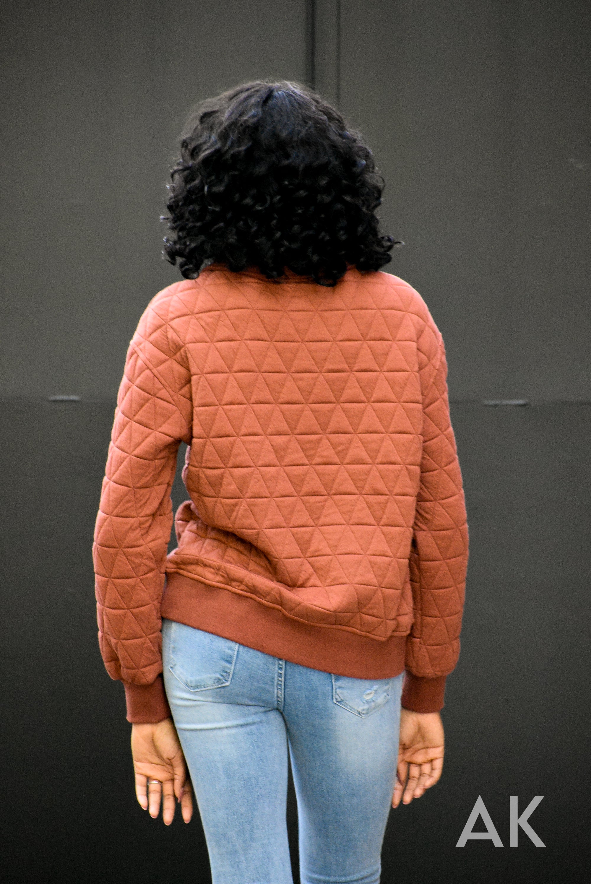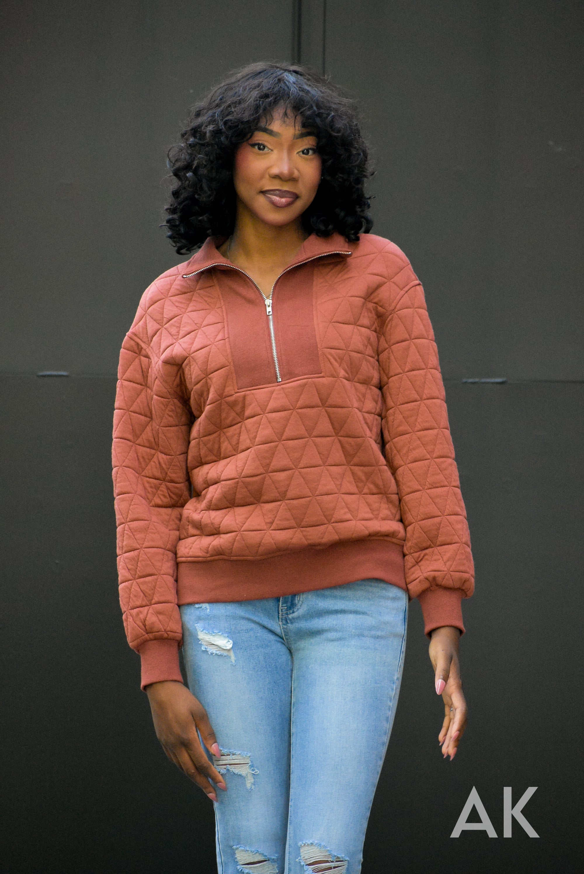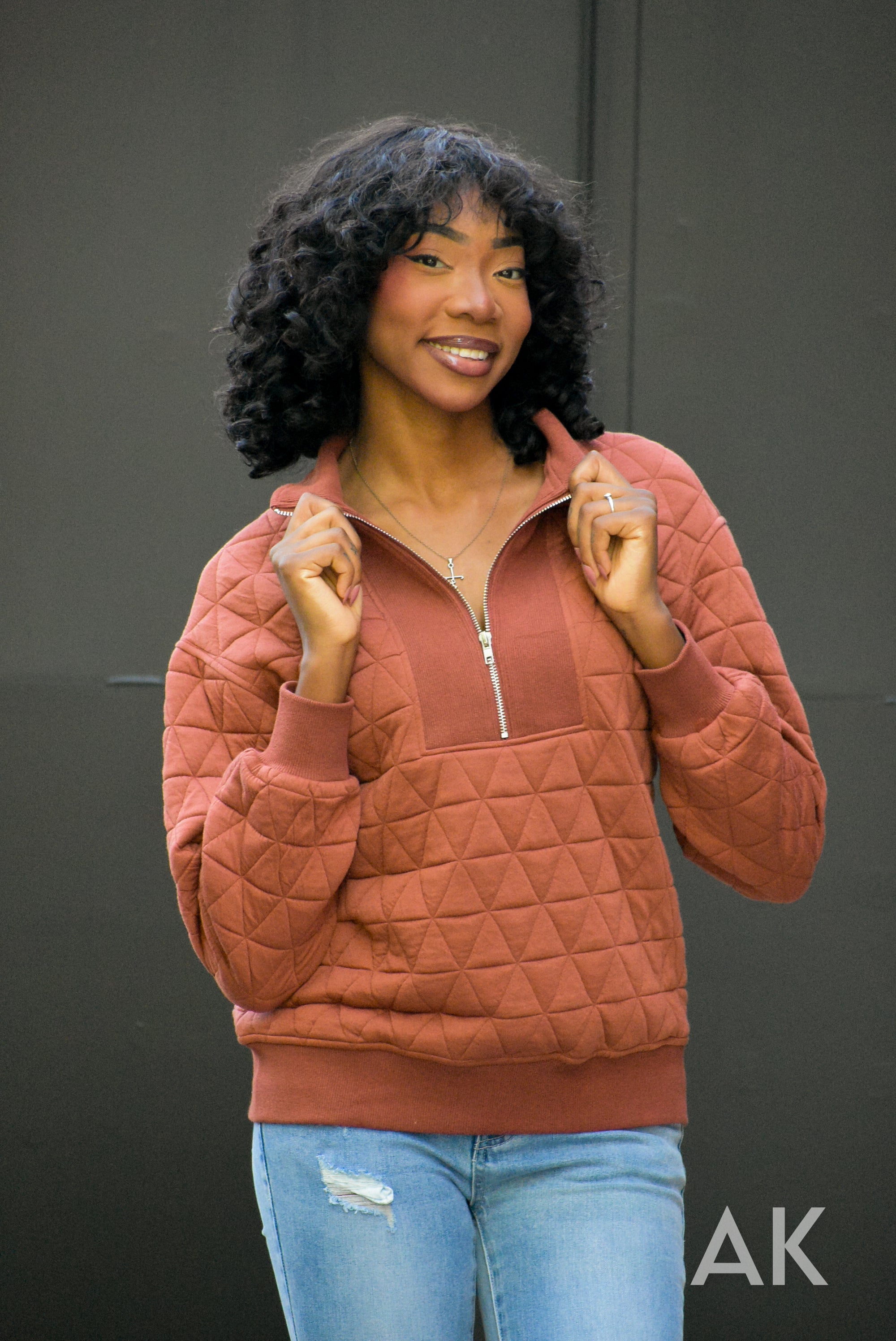 We love a good half zip pullover! This is a gorgeous caramel color and has a unique geometric quilted design. Violet is great worn alone or layered for a chic, put together fall look.